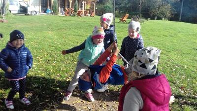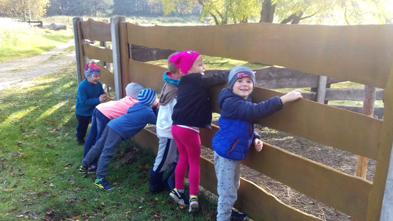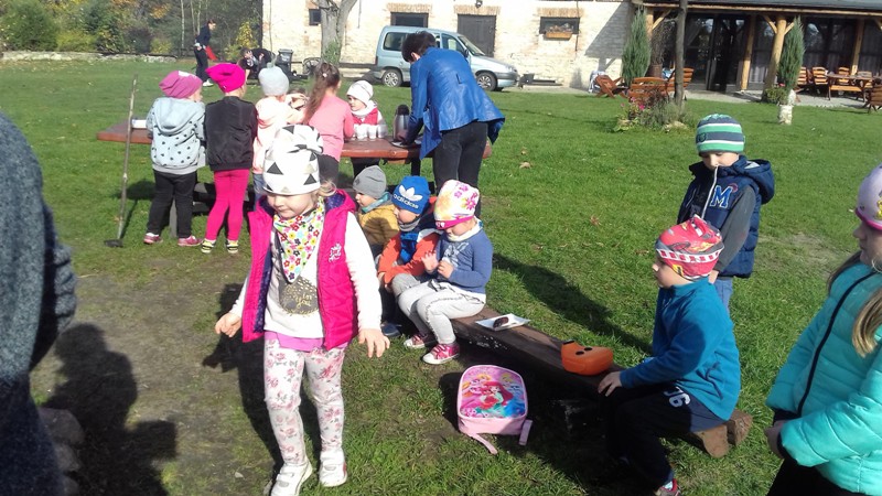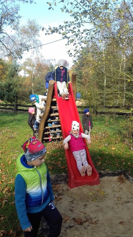Był również czas, aby nacieszyć się swobodną zabawą – pobiegać, poskakać wśród kolorowych liści, skorzystać z huśtawek i zjeżdżalni znajdujących się w gospodarstwie. Na twarzach dzieci rysował się piękny uśmiech i ogromna radość z wyjazdu. Wspólne ognisko pieczeniem kiełbasy było akcentem wieńczącym spotkanie z „Panią Jesienią”.