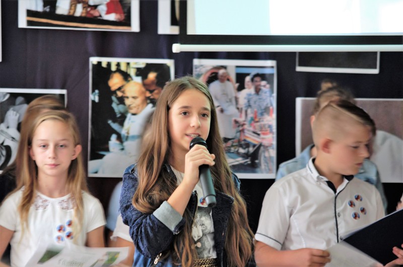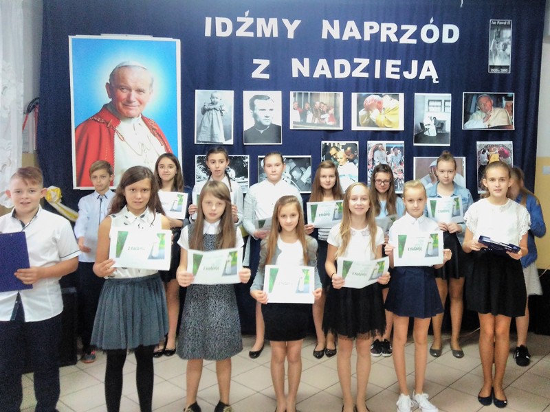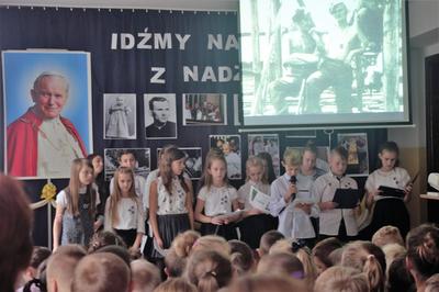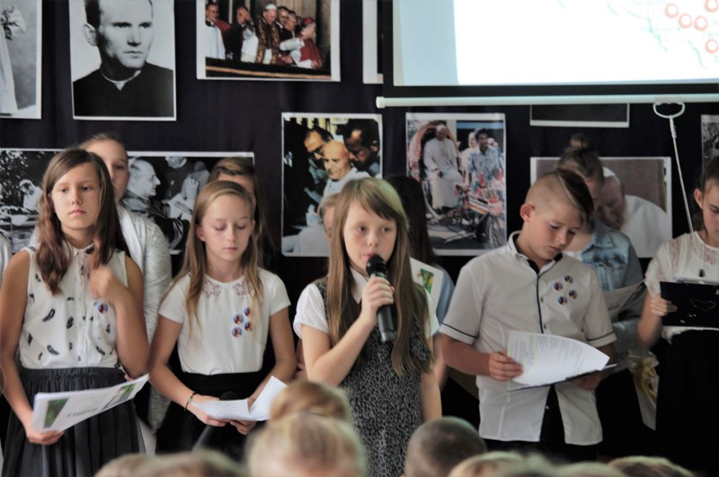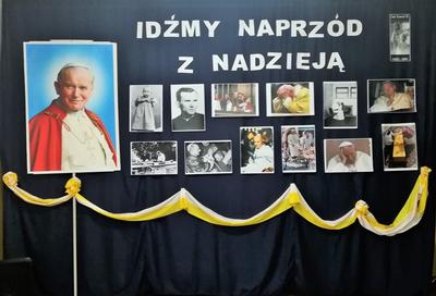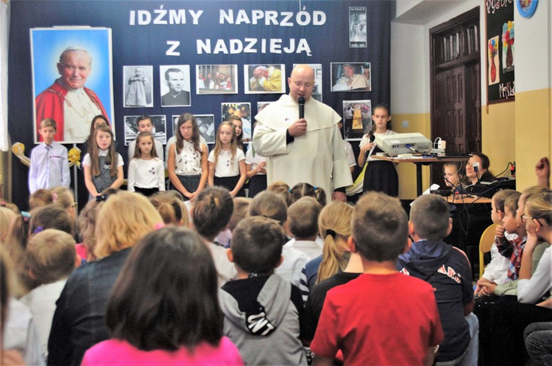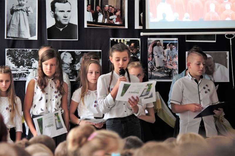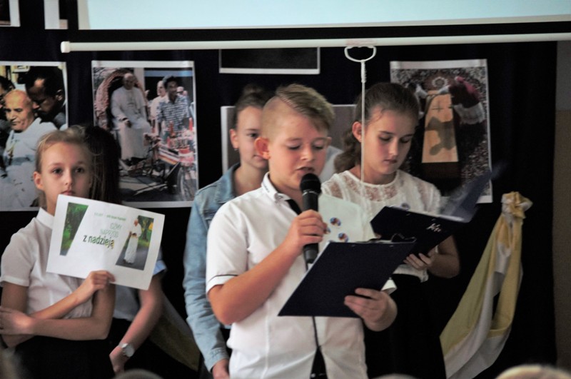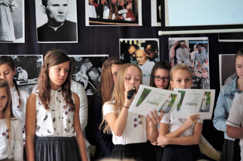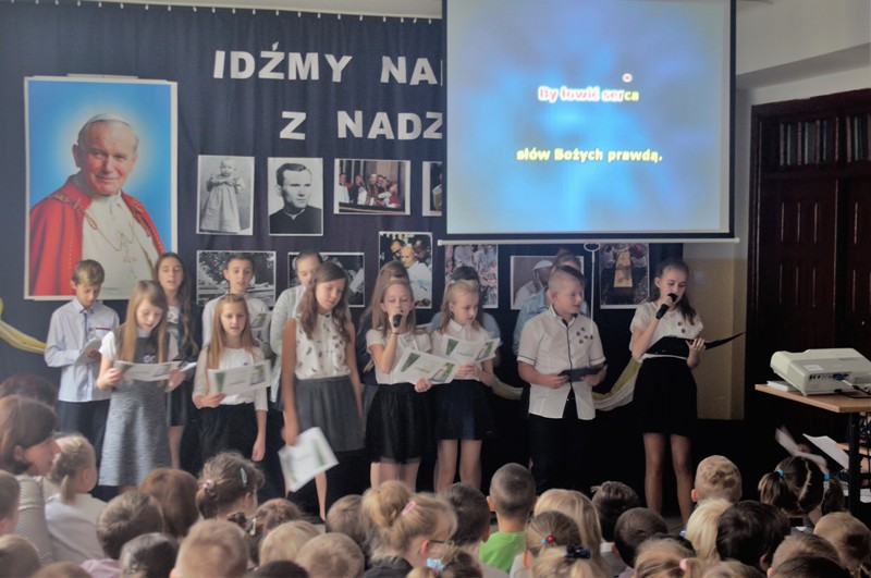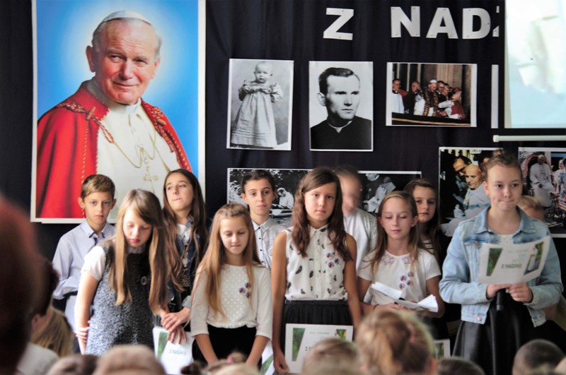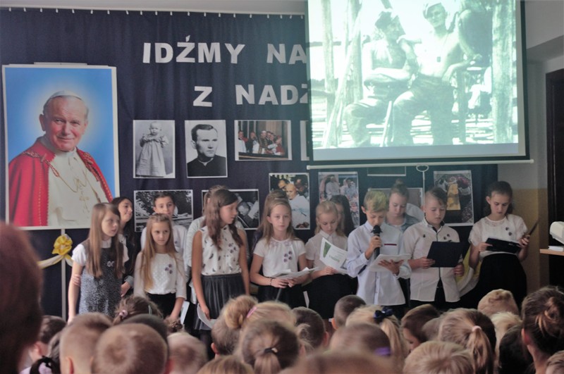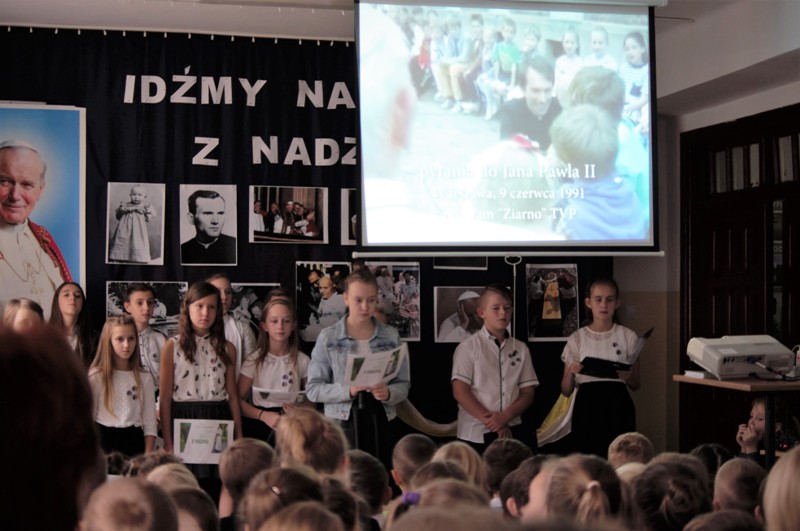 20 października 2017 r. obchodziliśmy w naszej szkole XVII Dzień Papieski, którego hasłem były słowa „Idźmy naprzód z nadzieją”. Pod przewodnictwem o. Dominika Słabika oraz p. Katarzyny Bień, uczniowie klasy V zaprezentowali program słowno- muzyczny, w którym przybliżyli najważniejsze fakty z życia Jana Pawła II i Jego refleksje o nadziei. Wzruszające uzupełnienie słów młodzieży stanowiły nagrania z wystąpień papieża. Równie ważne oraz wymowne były pieśni papieskie.