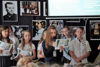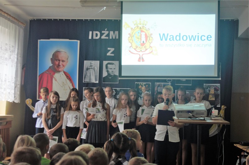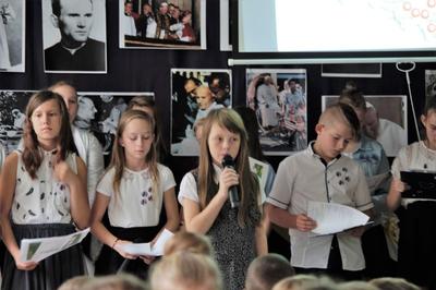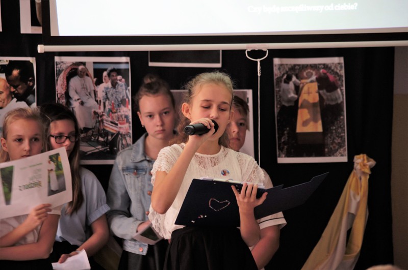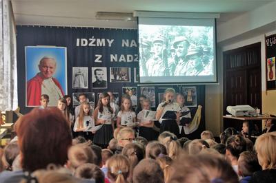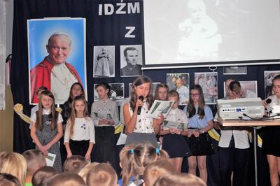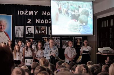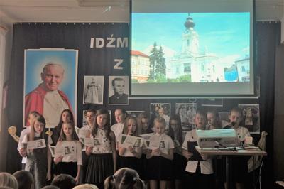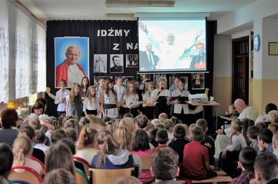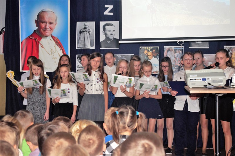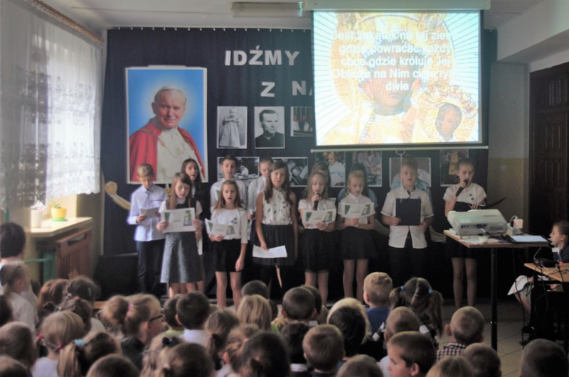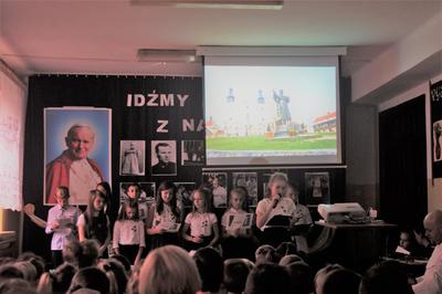 Wszyscy włączyli się w śpiew " Abba Ojcze", " Barki" i wielu innych. Uczniowie poprzez wiersze i pieśni ukazali widzom obraz niestrudzonego pielgrzyma, orędownika pokoju i miłości, człowieka, który lubił chodzić po górskich szlakach oraz mistrza, który zachęca nas do życia w świętości.