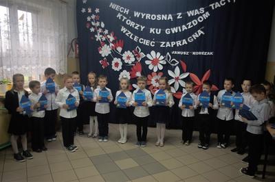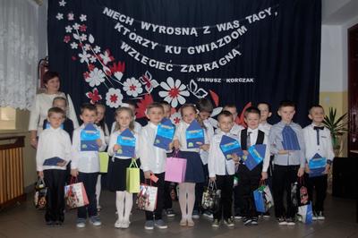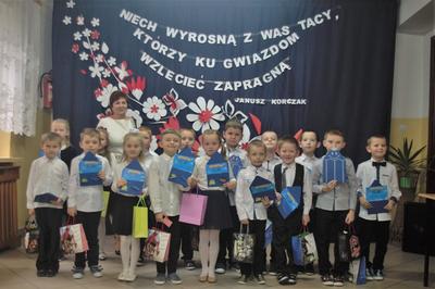 Po części artystycznej w obecności rodziców, nauczycieli, starszych i młodszych kolegów, złożyli uroczyste ślubowanie, po którym odbyło się symboliczne pasowanie na ucznia, którego dokonał dyrektor szkoły, Pan Leszek Wróblewski. Wraz z wychowawcą wręczył uczniom pamiątkowe dyplomy, a starsi koledzy przekazali drobne prezenty, przygotowane przez rodziców.Na zakończenie rodzice zaprosili swoje dzieci oraz nauczycieli na spotkanie i słodki poczęstunek.