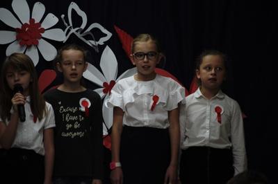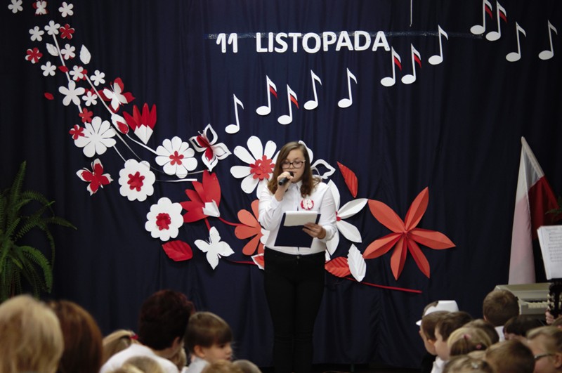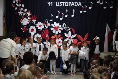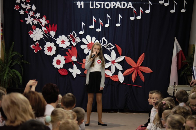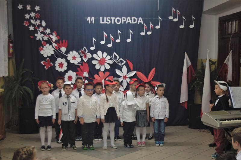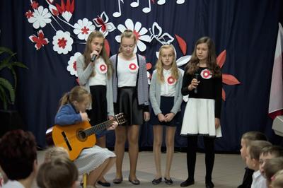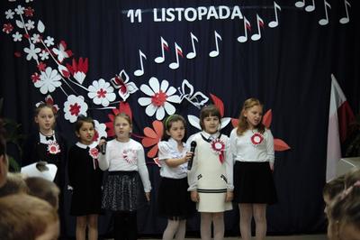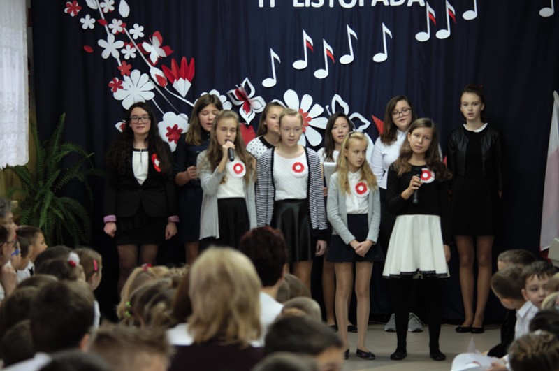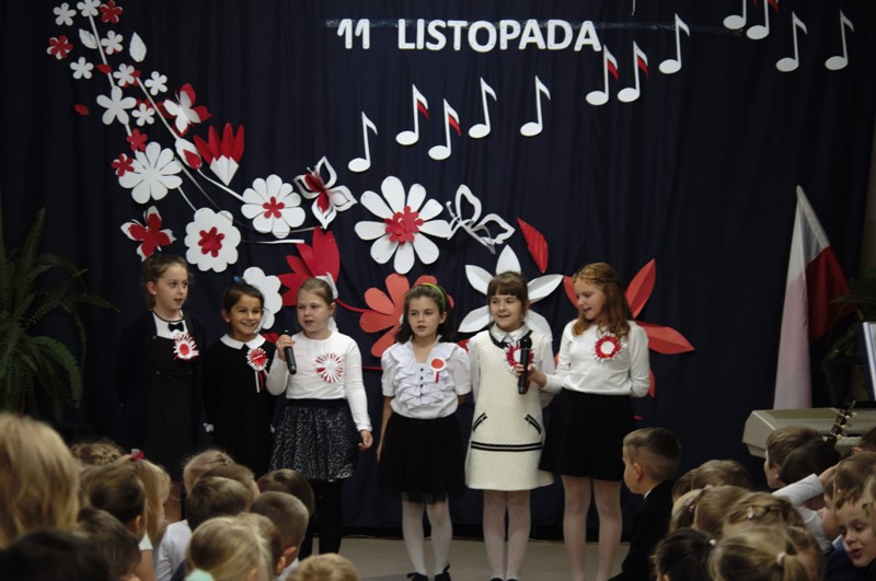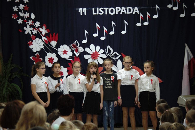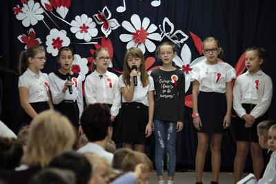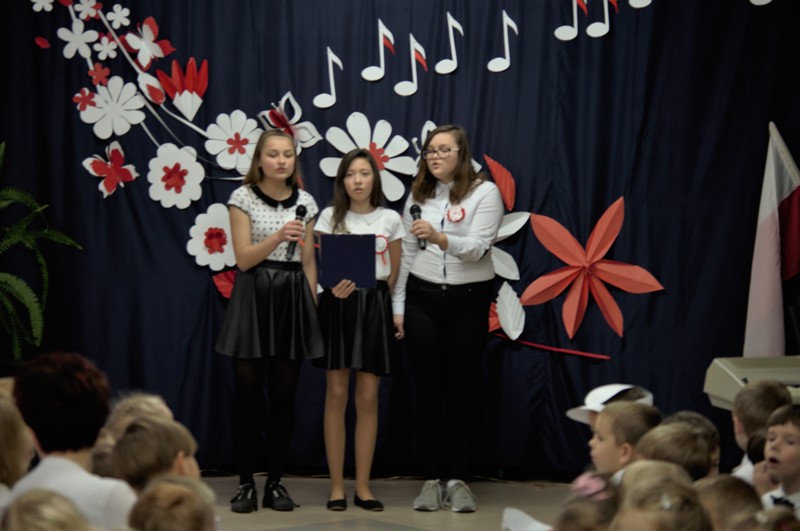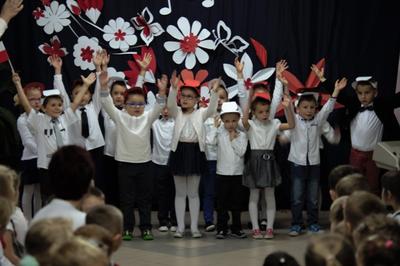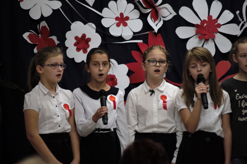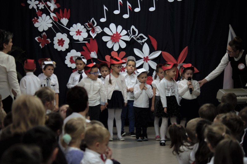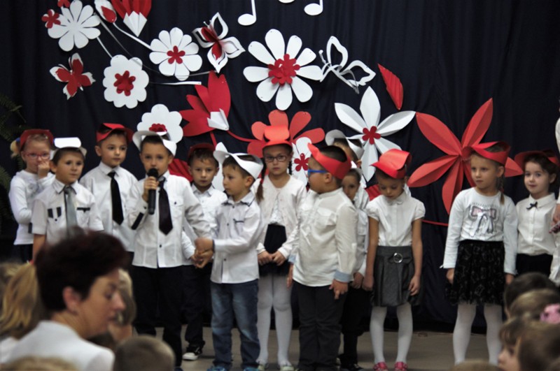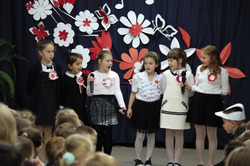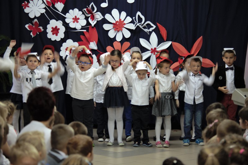 Grupa 5-latków z oddziału przedszkolnego wierszem wyraziła swą miłość do Ojczyzny. Uczestnicy akademii w skupieniu i z uwagą wysłuchali pięknych, wzruszających pieśni patriotycznych, które wykonały zespoły wokalne i wokalno – instrumentalne z klas: IVa, IVb, V, VI i VII.