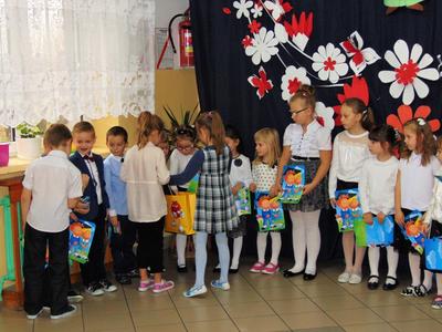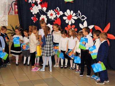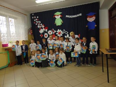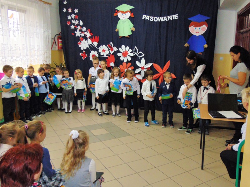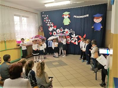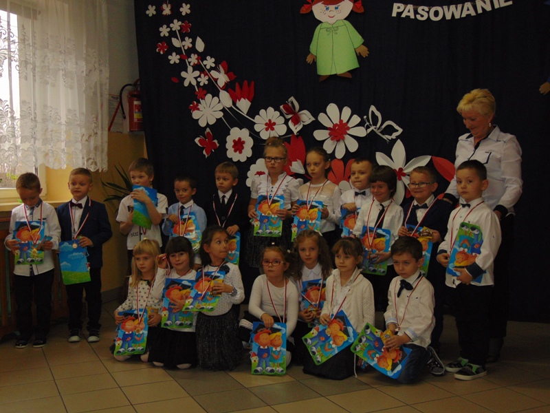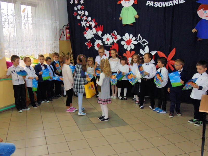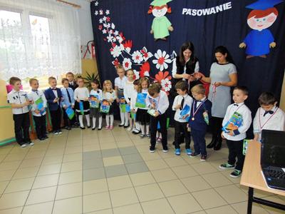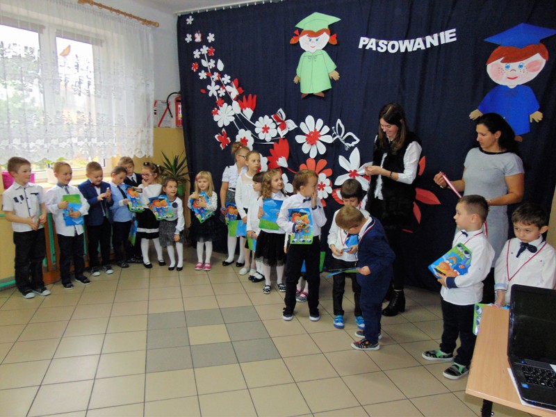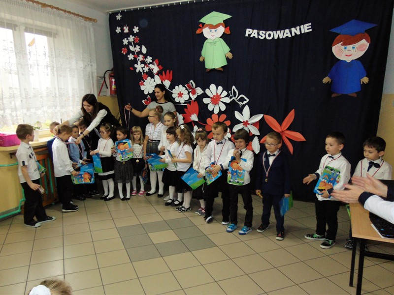Na zakończenie dzieci przedstawiły swoje ślubowanie - wtedy głos zabrał dyrektor szkoły pan Leszek Wróblewski. Pogratulował dzieciom ich zapału i zaangażowania, a następnie odbyła się ceremonia pasowania na Zerówkowicza. Na pamiątkę tego wydarzenia sześciolatki otrzymali dyplomy. Następnie uczniowie klasy I złożyli życzenia swoim młodszym kolegom i wręczyli słodki upominek.