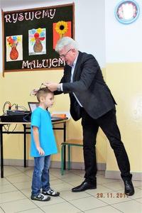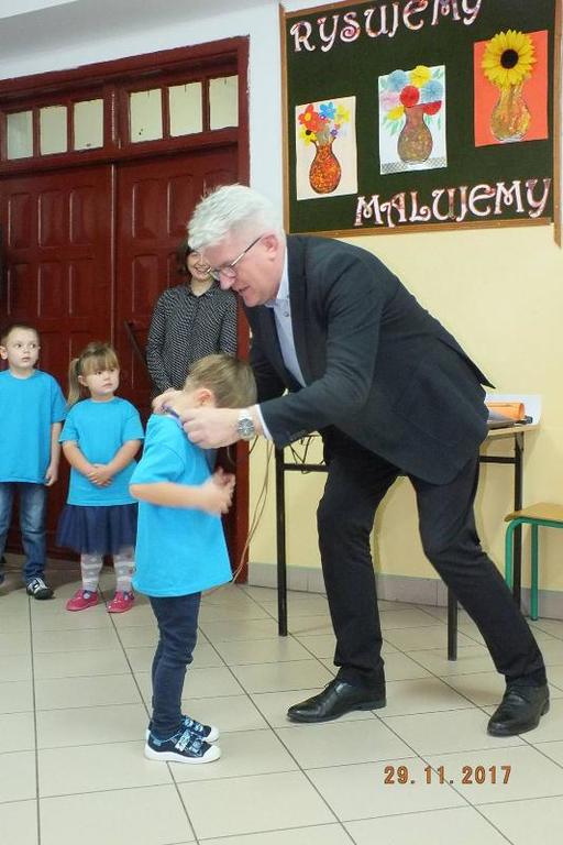 Dyrektor Szkoły dokonał uroczystego pasowania, a następnie dzieci otrzymały pamiątkowe medale. Pamiątką ze spotkania będą dla przedszkolaków również poduszki z nadrukiem zdjęcia grupy, które otrzymali od swoich rodziców. Słodki poczęstunek przygotowany przez mamy był akcentem wieńczącym to miłe spotkanie.