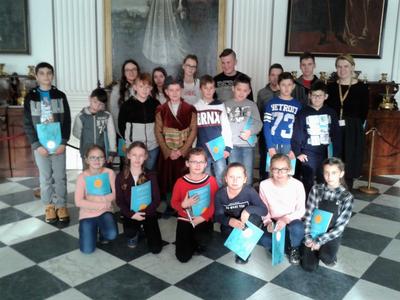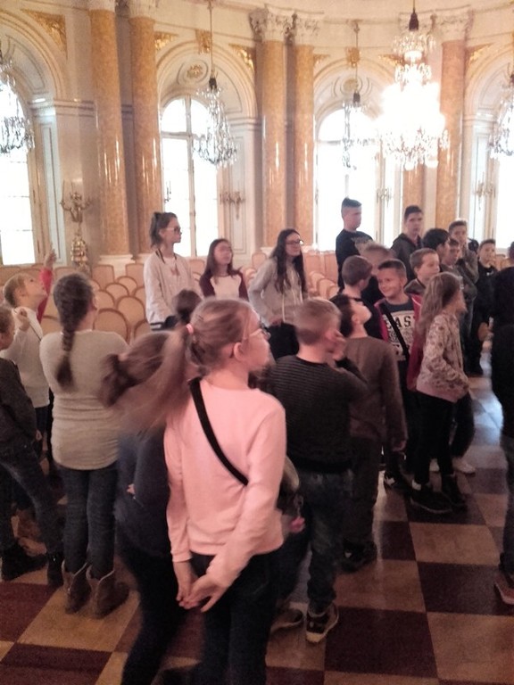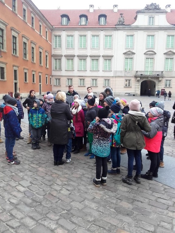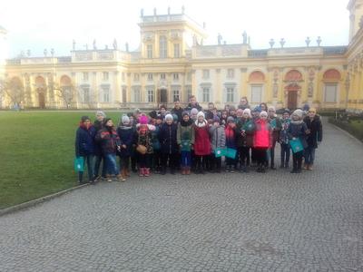 W dniu 28 listopada uczniowie klas czwartych, piątej i siódmej odbyli wycieczkę do stolicy Polski – Warszawy. Wycieczkę rozpoczęła „Wizyta u króla” w Muzeum Pałacu Króla Jana III w Wilanowie. Uczniowie poznali historię tej przepięknej i niepowtarzalnej rezydencji. Mieli okazję podziwiać i zachwycać się pięknem jej wystroju i zgromadzonych dzieł sztuki. Zwiedzanie rozpoczęli od obejrzenia Wielkiej Sali, gdzie wszyscy otrzymali zeszyty – notatniki, będące pamiątkami z wycieczki. Podziwiali pomnik króla Jana III na koniu, galerię obrazów, podłogę „3D” w dawnej bibliotece. Zwiedzili apartamenty króla Jana i królowej Marysieńki. Oglądali wspaniałe arrasy, kunsztowne meble i zastawę stołową, rzeźby i płaskorzeźby ozdabiające królewskie apartamenty. Mieli też okazję dowiedzieć się z czego składa się strój szlachecki, a wybrani uczniowie mogli go nawet przymierzyć.