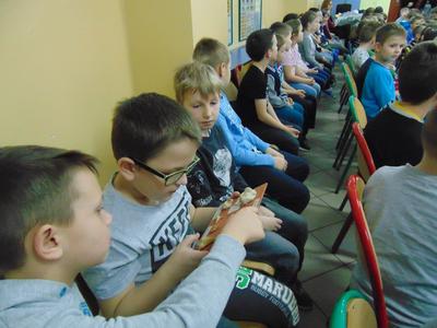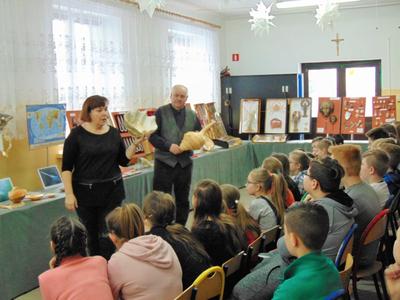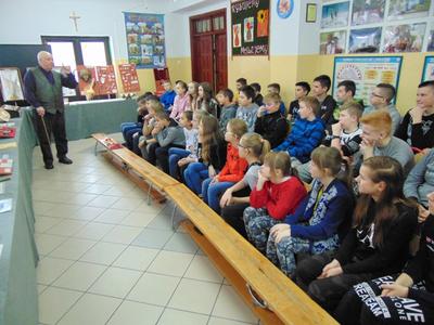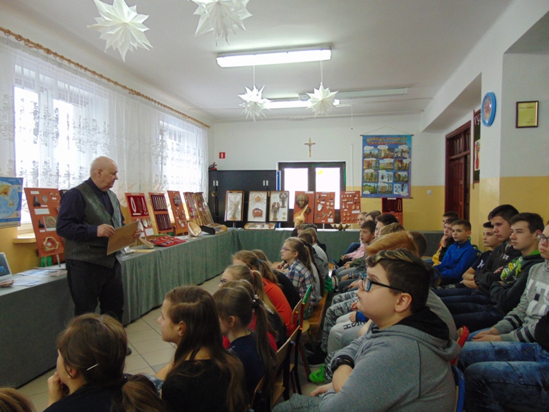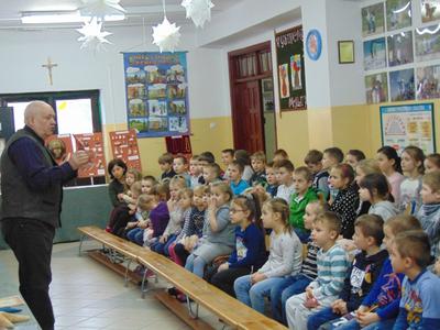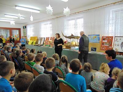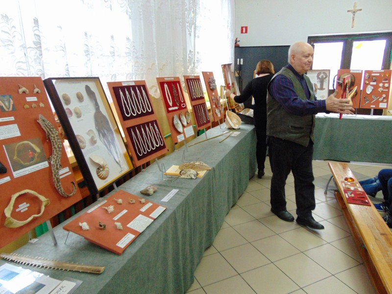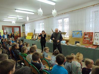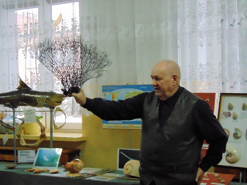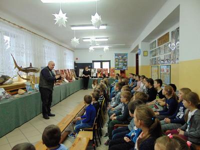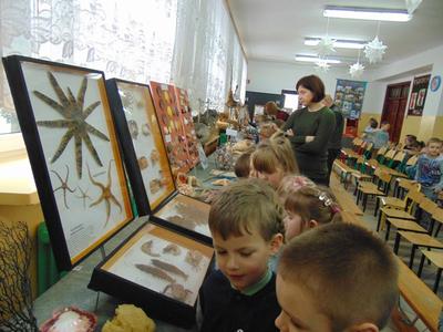 W poniedziałek 22 stycznia dzieci z oddziałów przedszkolnych oraz uczniowie klas I -VII mieli okazję podziwiać wystawę "Skarby mórz i oceanów". Imponującą kolekcję ponad 500 okazów fauny mórz i oceanów, zaprezentował Pan Stanisław Jantura, pasjonat z województwa świętokrzyskiego. Uczniowie wysłuchali prelekcji i ciekawych opowieści z dziedziny zoologii i geologii. Towarzyszyła mu w tym córka, Pani Żaneta Przyjemska.