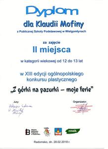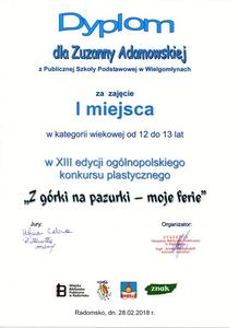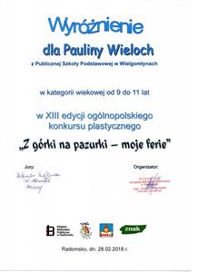 W kategorii od 9 do 11 lat wyróżnienie przyznano Paulinie Wieloch z klasy IVa, natomiast w kategorii od 12 do 13 lat I miejsce zajęła Zuzanna Adamowska z klasy VII, a II miejsce – Klaudia Mofina z klasy VI. Serdecznie gratulujemy sukcesu uczennicom i opiekunowi, Pani Elżbiecie Olczyk.