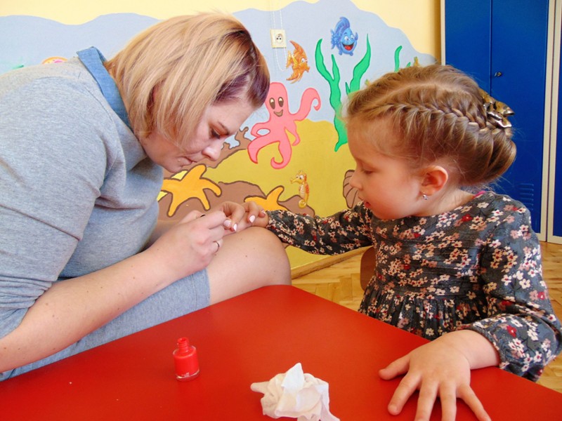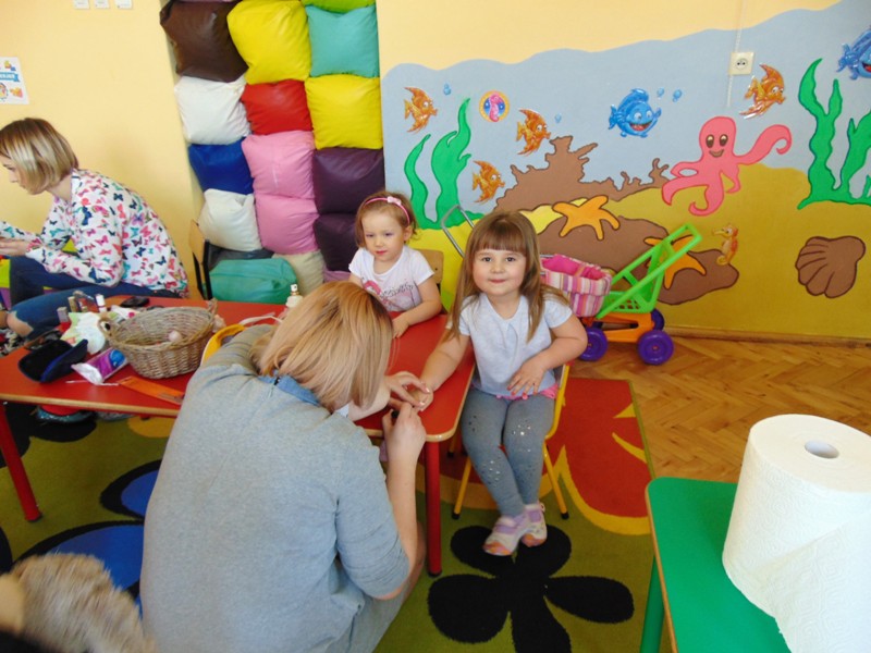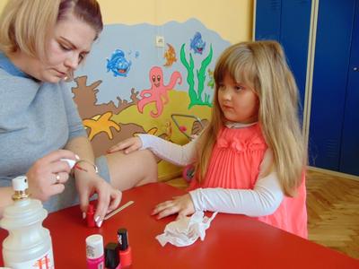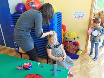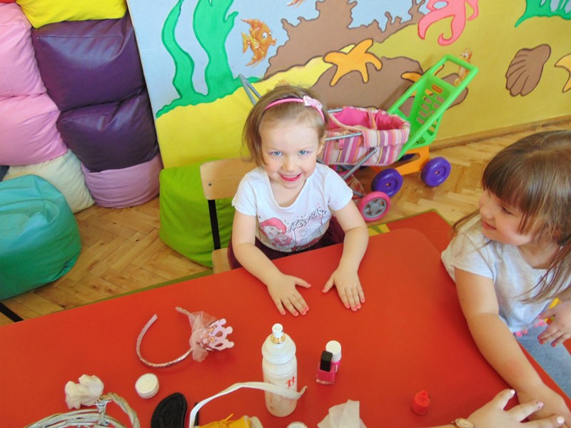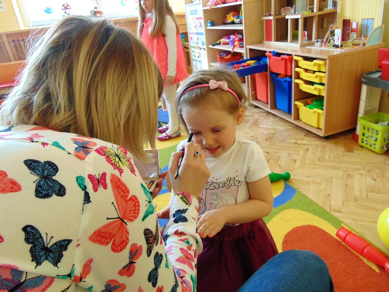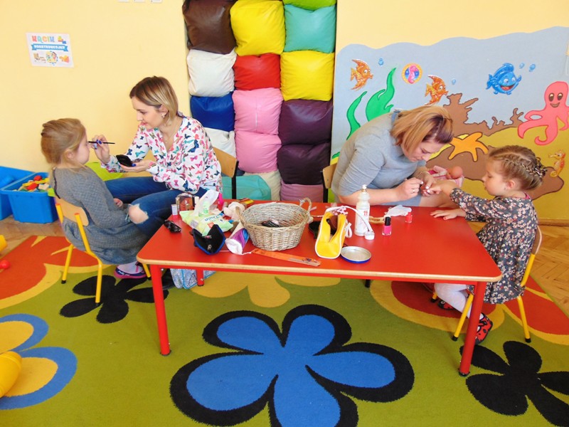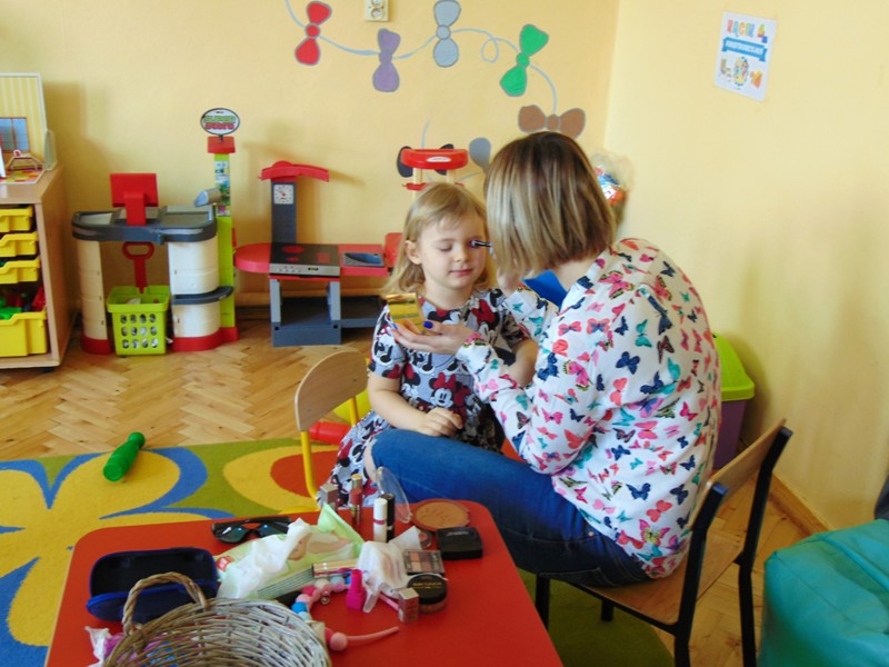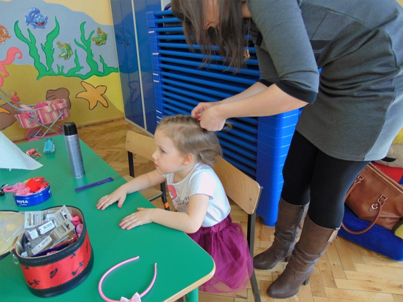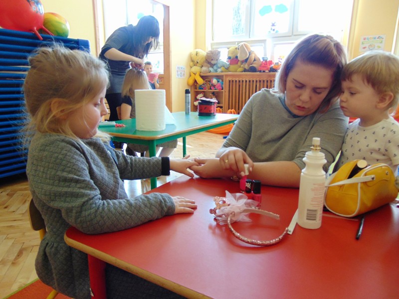 Słowa piosenki Alicji Majewskiej odzwierciedlają marzenia każdej dziewczynki, która chciałaby jak najszybciej dorosnąć, aby móc założyć buty na wysokim obcasie, zrobić makijaż, iść do fryzjera i wyglądać wyjątkowo. W najmłodszej grupie przedszkolnej dziś te marzenia się częściowo spełniły. Był to wyjątkowy dzień dla małych kobietek, gdyż mogły choć na chwilę stać się prawdziwymi damami. Przy zaangażowaniu mam udało się zorganizować „salon piękności”. Mamy przyjęły rolę fryzjerów, makijażystów i stylistów, a dziewczynki były zachwycone. W atmosferze radości i zabawy małe piękności nabrały jeszcze większego blasku. Swój wdzięk i urok mogły zaprezentować podczas zorganizowanego pokazu, gdzie przy wtórze muzyki pokonywały trudy chodzenia w butach na wysokim obcasie. Uśmiech na twarzach dzieci i ich rodziców był wspaniałym dopełnieniem tego dnia. Nie zabrakło również życzeń oraz słodkiego poczęstunku przygotowanego przez chłopaków z grupy. Dziękujemy mamom za zaangażowanie i wkład w realizację dziecięcych wyobrażeń o byciu kobietą.