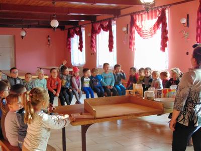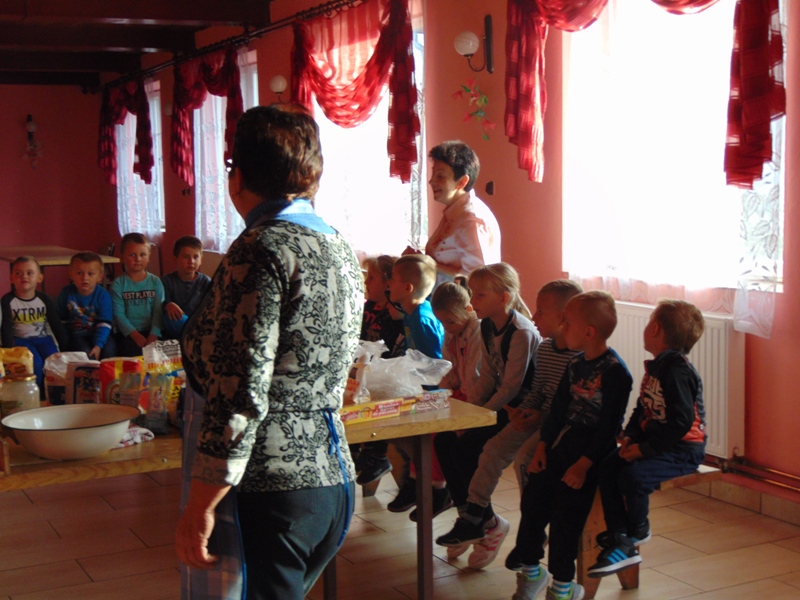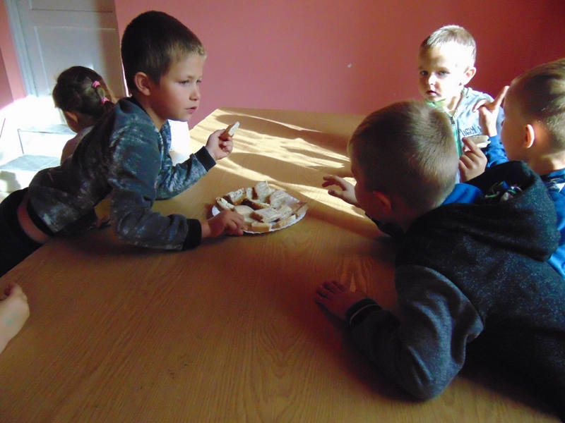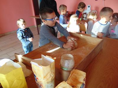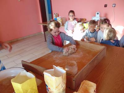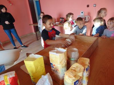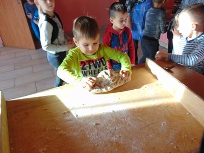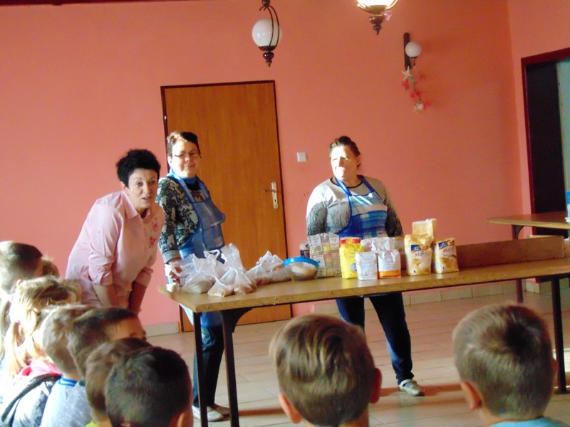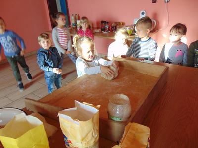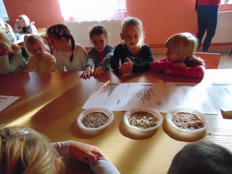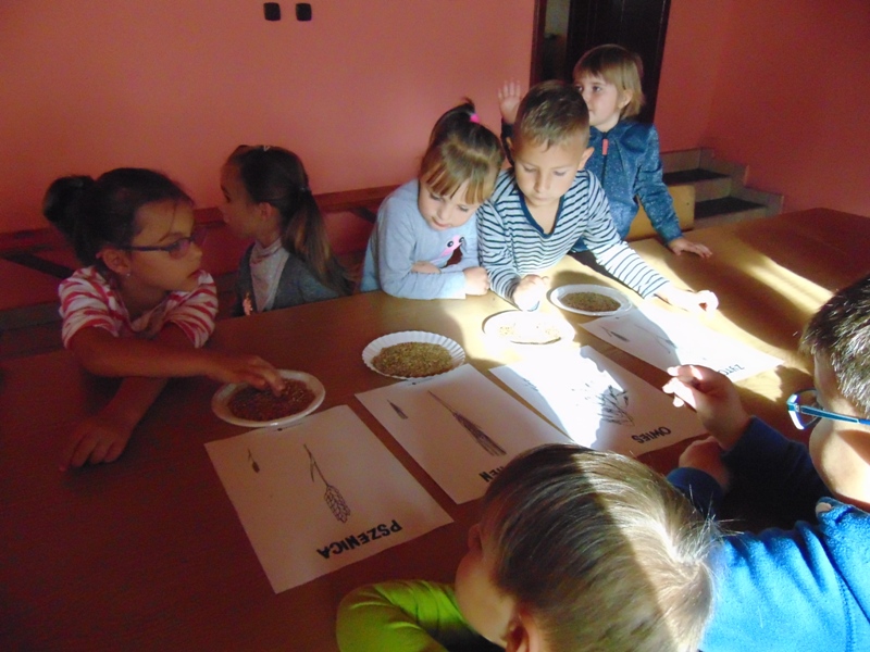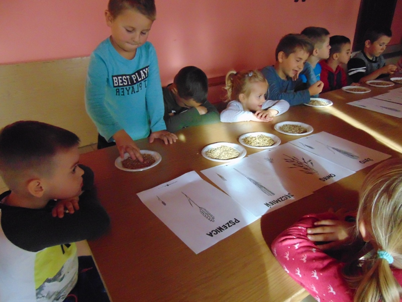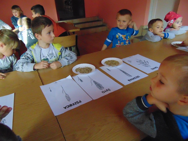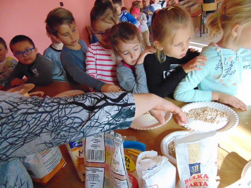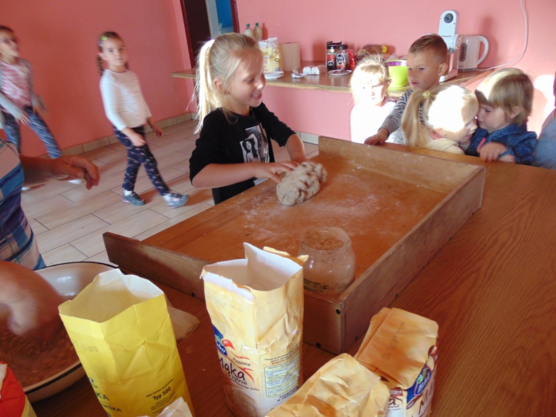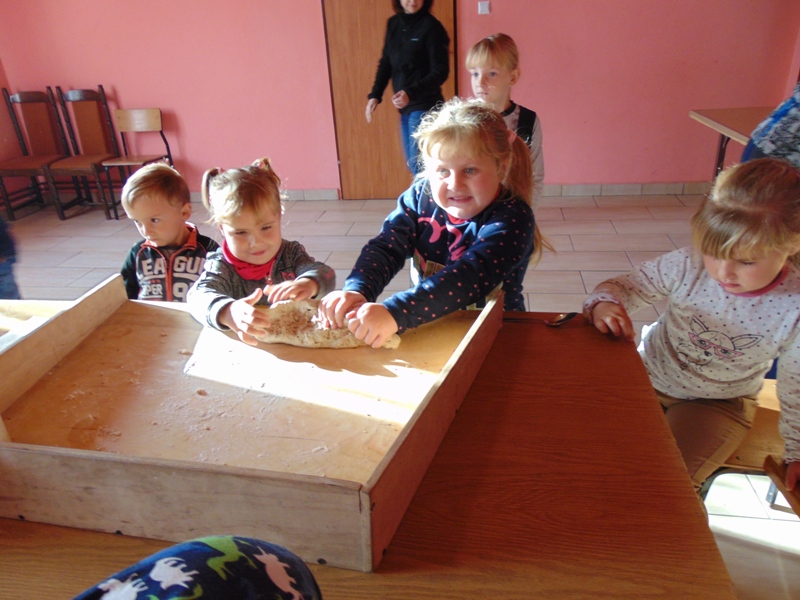 Na tę okoliczność zgromadzone zostały ziarna zbóż, różne go rodzaju gatunki mąki, kasze, płatki. Dzieci poznawały je oglądając, dotykając, smakując. Następnie dopasowywały ziarna do kłosów zbóż, utrwalając ich nazwy. Panie z KGW opowiedziały o historii chleba, jego znaczeniu dla ludzi, a także o recepturach wypieku. Przedszkolaki zobaczyły kolejne etapy wypieku chleba , uczestniczyły w ugniataniu ciasta, poznawały walory smakowe i zapachowe różnych rodzajów chleba. W międzyczasie, gdy ciasto wyrastało udaliśmy się do gospodarstwa Państwa Ptaszków, w którym znajduje się piec chlebowy. Gospodyni opowiedziała i zaprezentowała, w jaki sposób chleb był wypiekany w takim piecu. Wizyta w gospodarstwie zakończyła się słodkim poczęstunkiem.