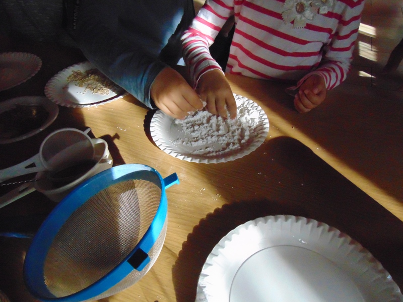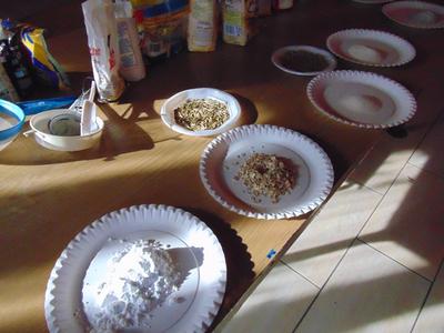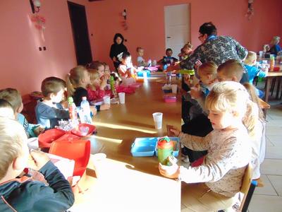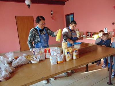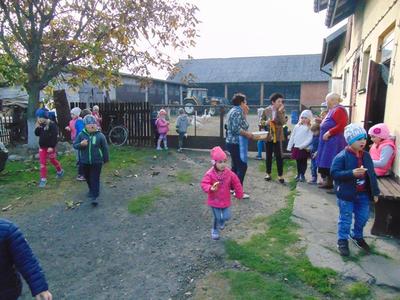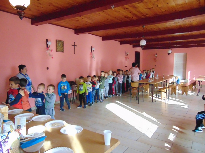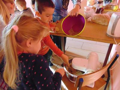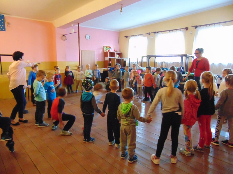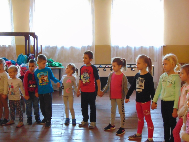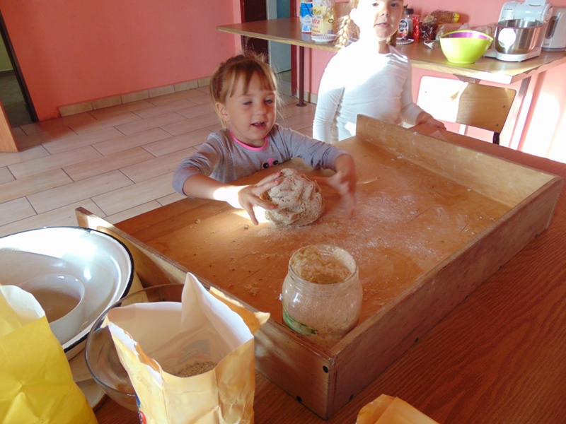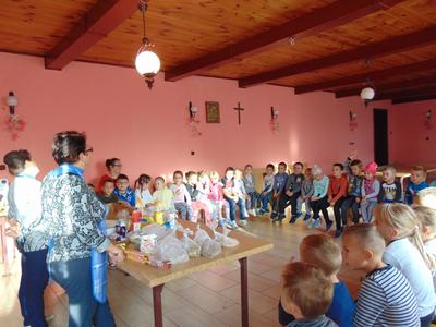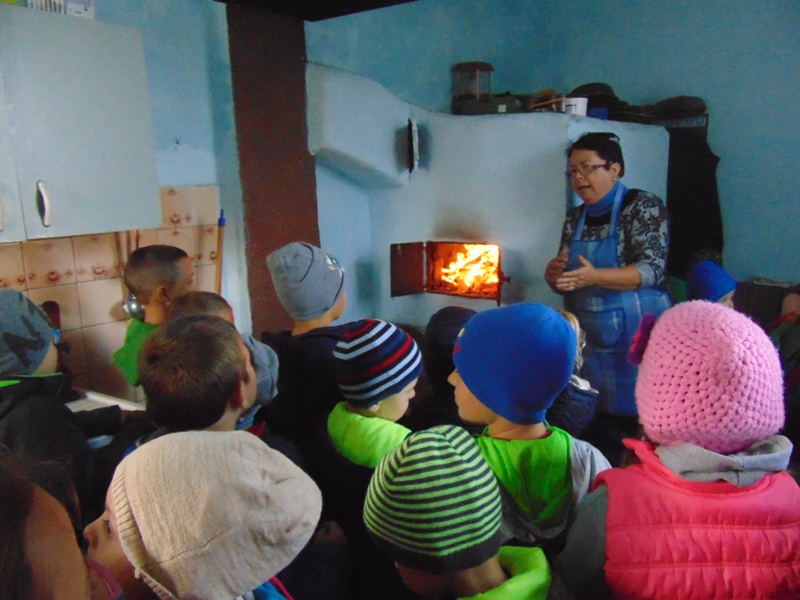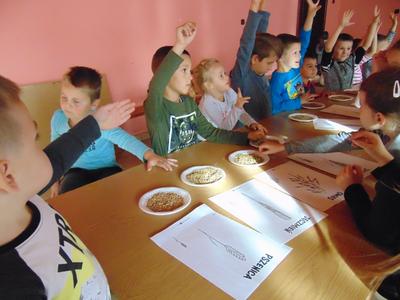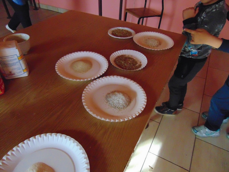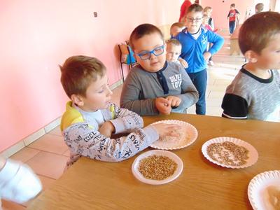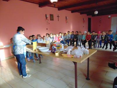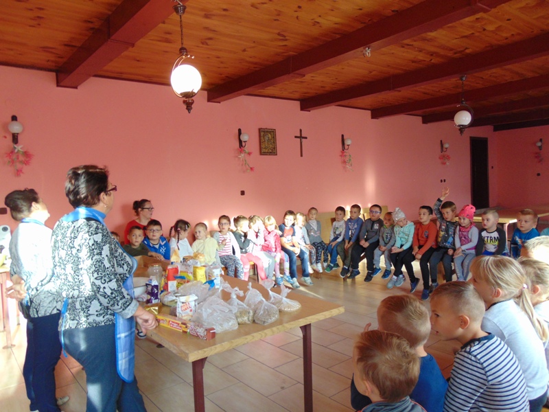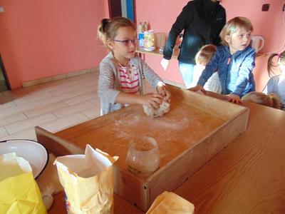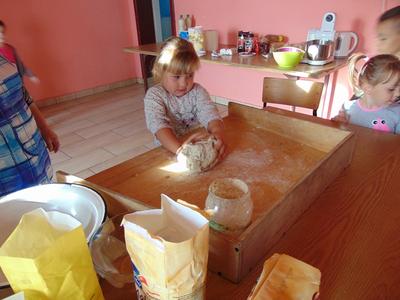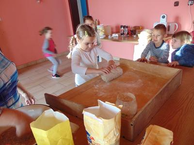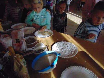 Na tę okoliczność zgromadzone zostały ziarna zbóż, różne go rodzaju gatunki mąki, kasze, płatki. Dzieci poznawały je oglądając, dotykając, smakując. Następnie dopasowywały ziarna do kłosów zbóż, utrwalając ich nazwy. Panie z KGW opowiedziały o historii chleba, jego znaczeniu dla ludzi, a także o recepturach wypieku. Przedszkolaki zobaczyły kolejne etapy wypieku chleba , uczestniczyły w ugniataniu ciasta, poznawały walory smakowe i zapachowe różnych rodzajów chleba. W międzyczasie, gdy ciasto wyrastało udaliśmy się do gospodarstwa Państwa Ptaszków, w którym znajduje się piec chlebowy. Gospodyni opowiedziała i zaprezentowała, w jaki sposób chleb był wypiekany w takim piecu. Wizyta w gospodarstwie zakończyła się słodkim poczęstunkiem.