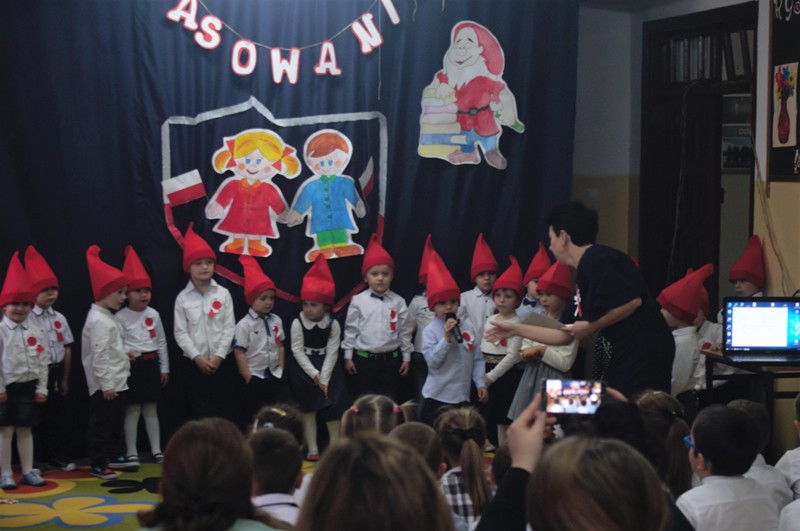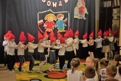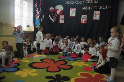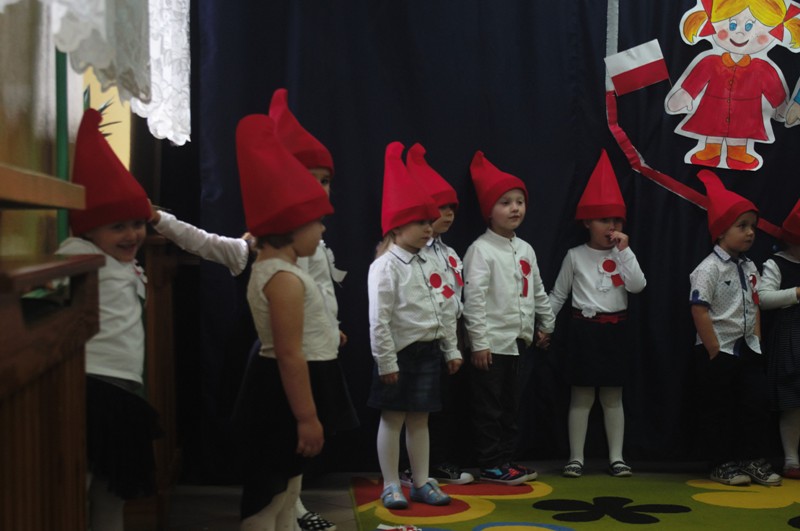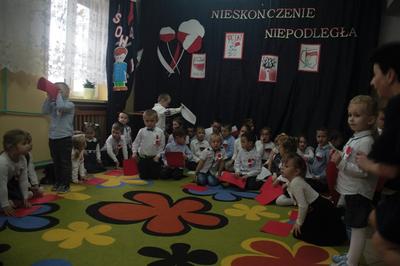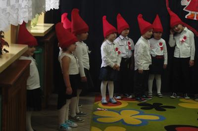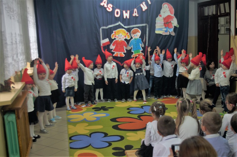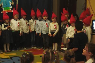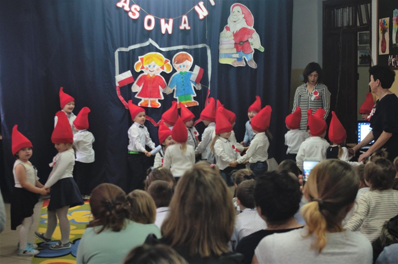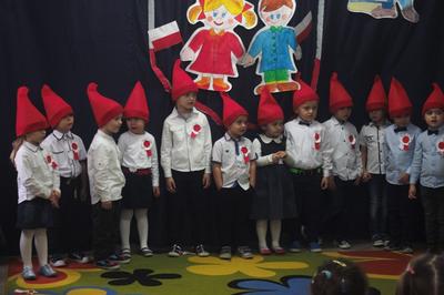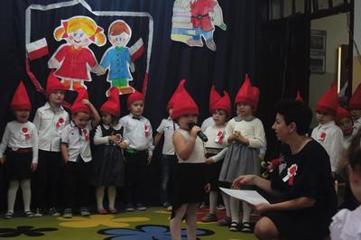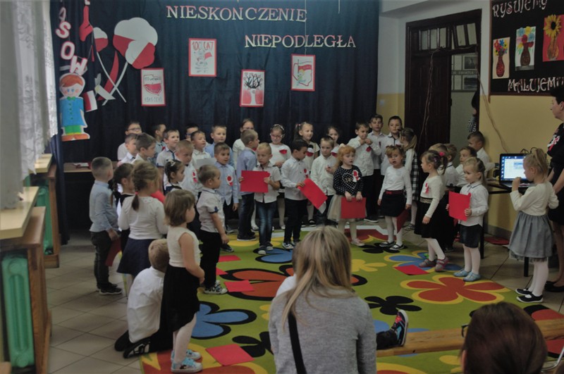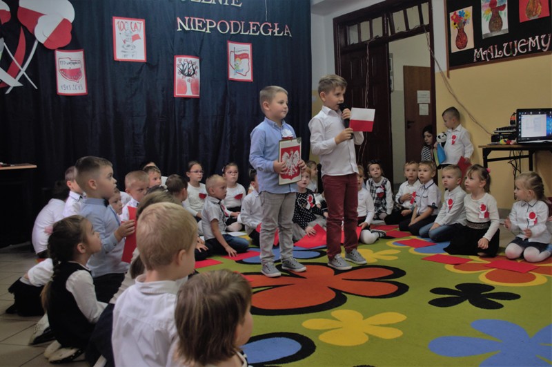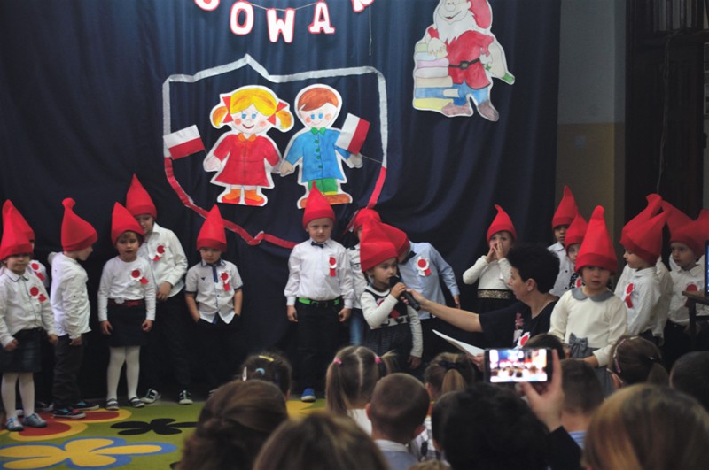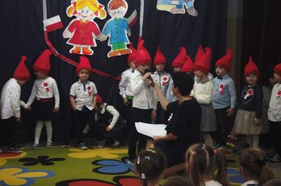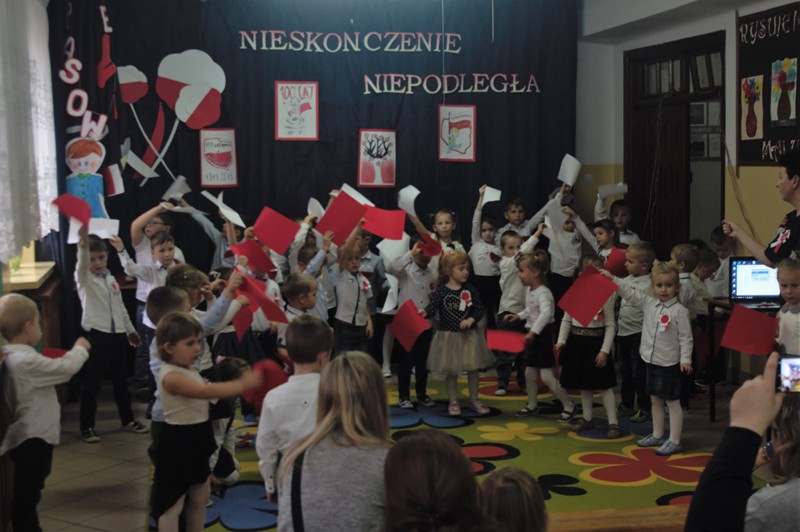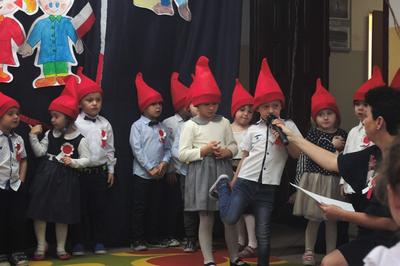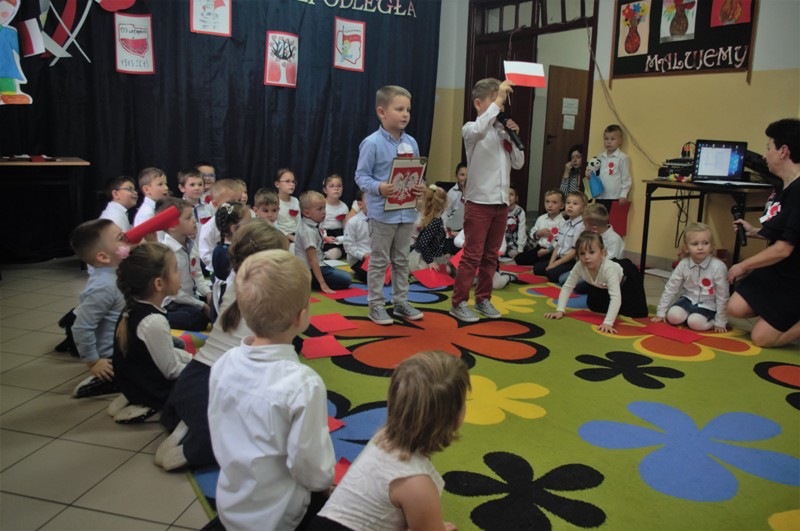 W tym dniu również 3,4-latki wraz ze swoimi kolegami i koleżankami z klasy O zaprezentowały krótki program artystyczny o charakterze patriotycznym, aby uczcić 100- lecie odzyskania przez Polskę niepodległości. Postawy szacunku , miłości do własnej Ojczyzny powinny być kształtowane u dzieci od najmłodszych lat, gdyż to co zaszczepi się w serach małych Polaków będzie rozkwitać w przyszłości. Wyjątkowe bo setne obchody Święta Niepodległości były okazją, aby często na zajęciach poruszać tematy rozwijające u dzieci poczucie tożsamości narodowej. Owocem podjętych działań był występ dzieci, podczas którego z ogromną dumą recytowały wiersz Władysława Bełzy „Kto ty jesteś - Polak mały”, mówiły o symbolach narodowych, tańczyły eksponując barwy narodowe. Odśpiewany został również hymn państwowy. Dziękujemy wszystkim zaangażowanym w przygotowania do tego dnia, aby miał tak uroczysty charakter.