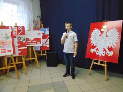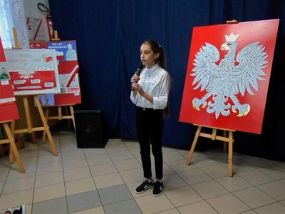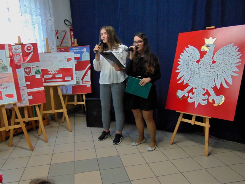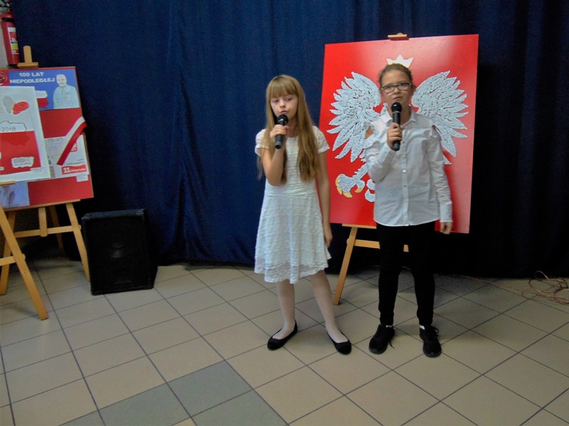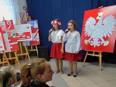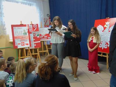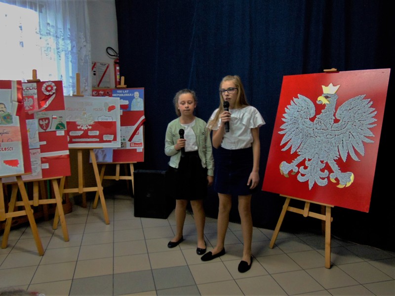 Prowadzące konkurs uczennice z kl. VIII : Zuzanna Adamowska i Klaudia Nowak, oprócz zapowiedzi występów poszczególnych wykonawców pieśni, w przystępny i wyrazisty sposób przedstawiły okoliczności historyczne prezentowanych utworów i ich wymowę patriotyczną.