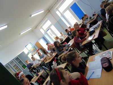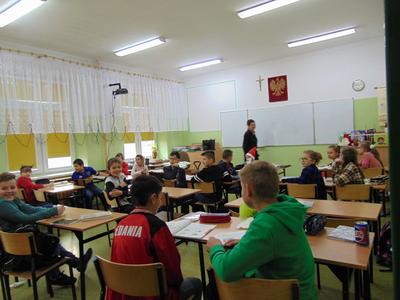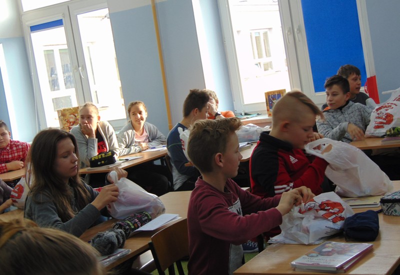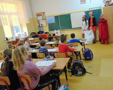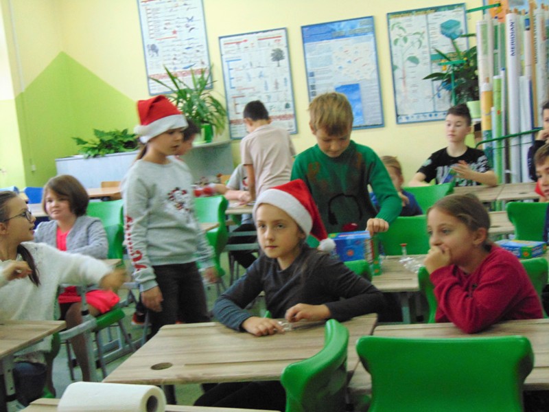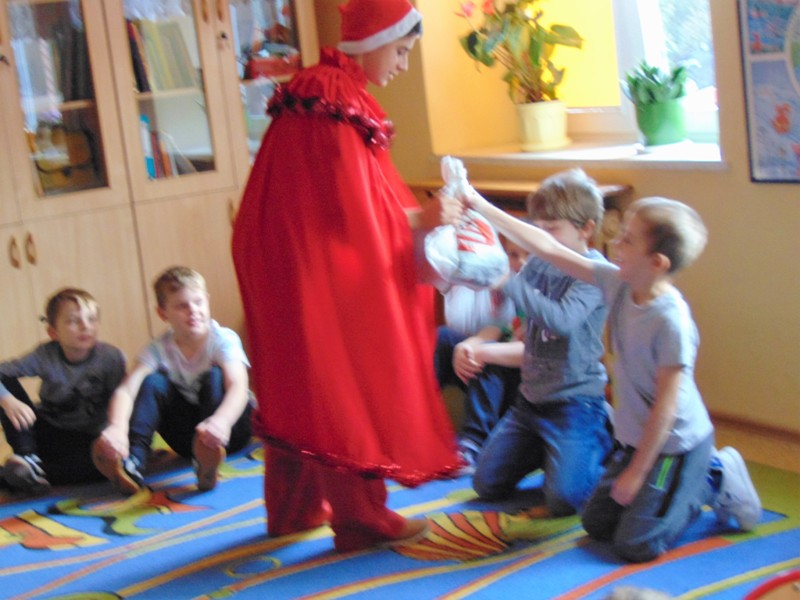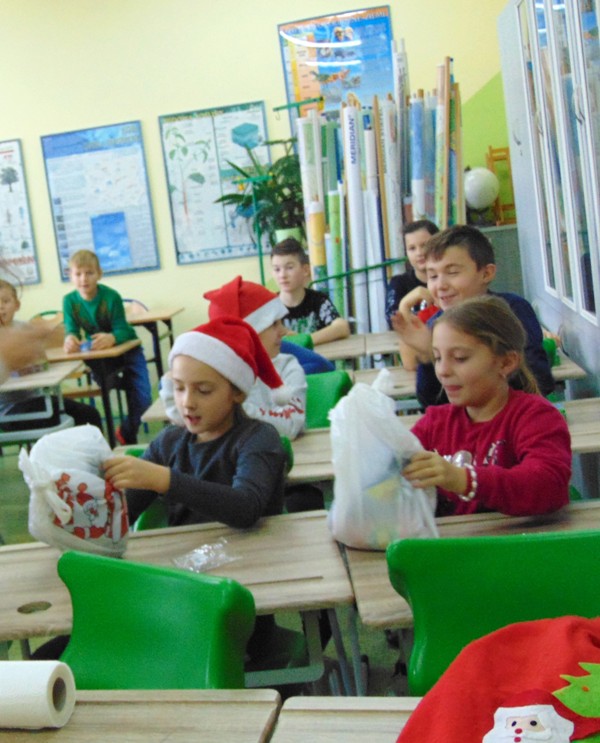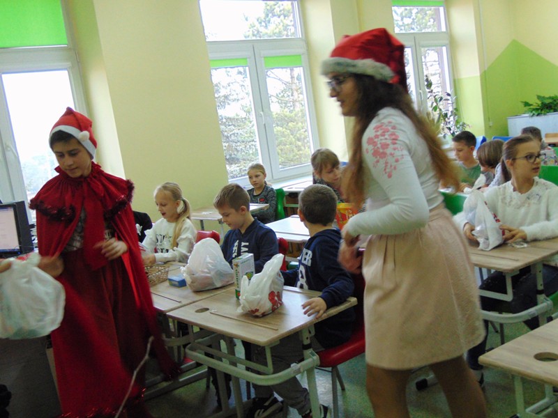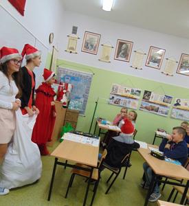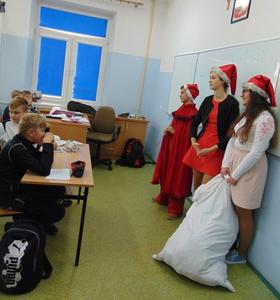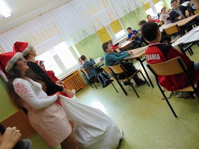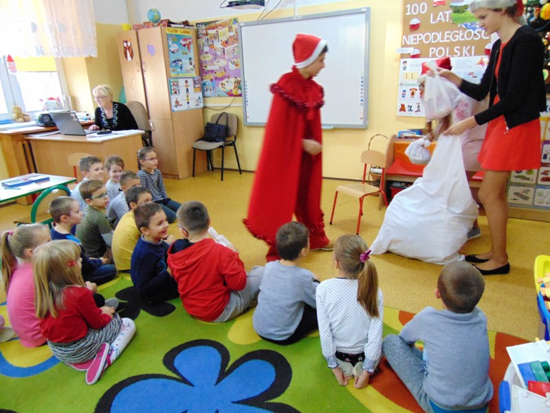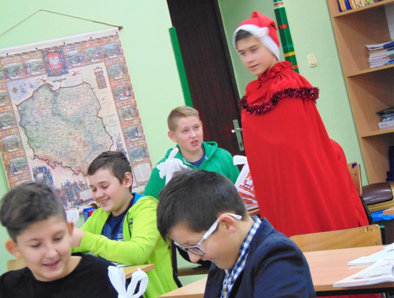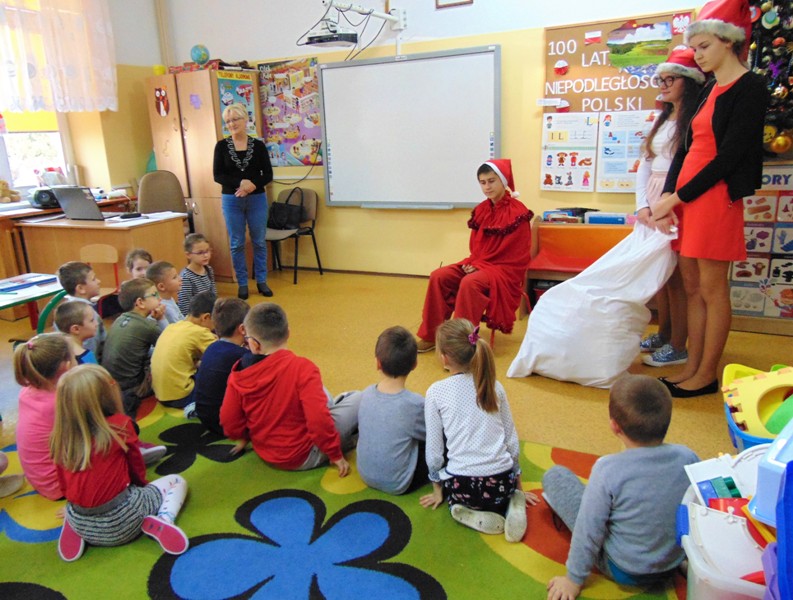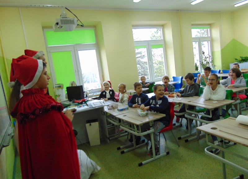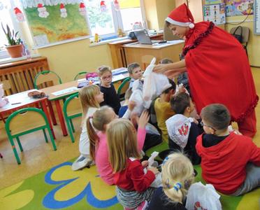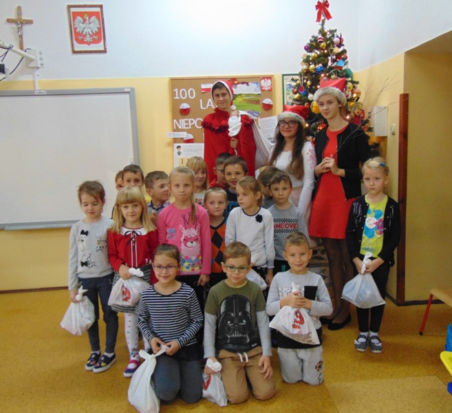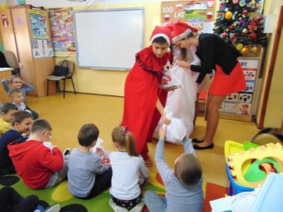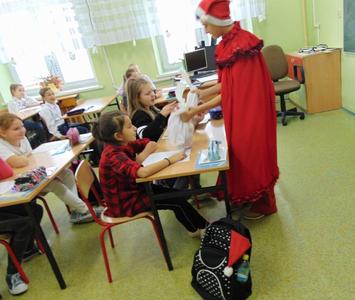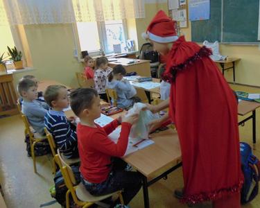 Radość i wyjątkowa atmosfera zagościła dokoła. Wszystkie dzieci otrzymały prezenty, bo przecież małe dziecięce psoty zawsze można wybaczyć. Uczniowie obiecali, że postarają się grzecznie zachowywać w szkole i w domu. Były piosenki, wiersze, żarty. Szkoda, że taki Gość przychodzi do szkoły tylko raz w roku. Mikołaj i dyrektor szkoły dziękuje za pomoc wolontariuszom z klasy VIII oraz Radzie Rodziców, w szczególności: Pani Ewie, Ani i Kasi. Do następnego roku!