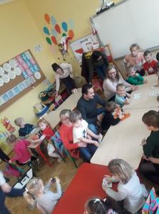 Radość i atmosfera świąteczna widoczna była nie tylko na twarzach dzieci, lecz również ich rodziców. Powstały mikołajkowe prace, które będą zdobić salę przedszkolną, a dzieci co najważniejsze spotkały się również ze św. Mikołajem który przyniósł im prezenty. Dziękujemy uczestnikom zajęć za miła i serdeczną atmosferę oraz za zaangażowanie.
