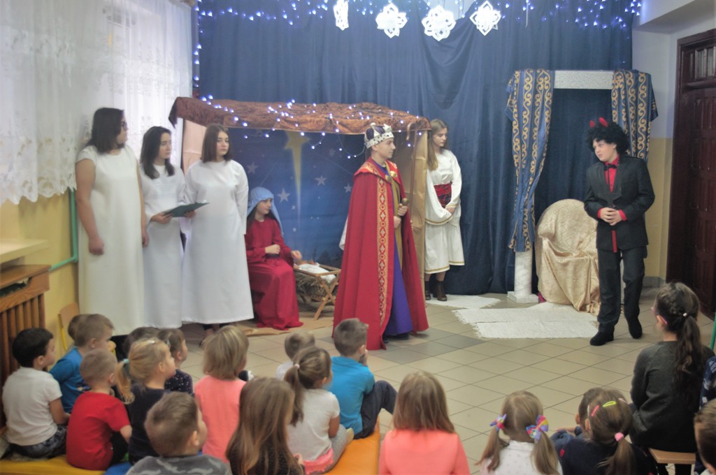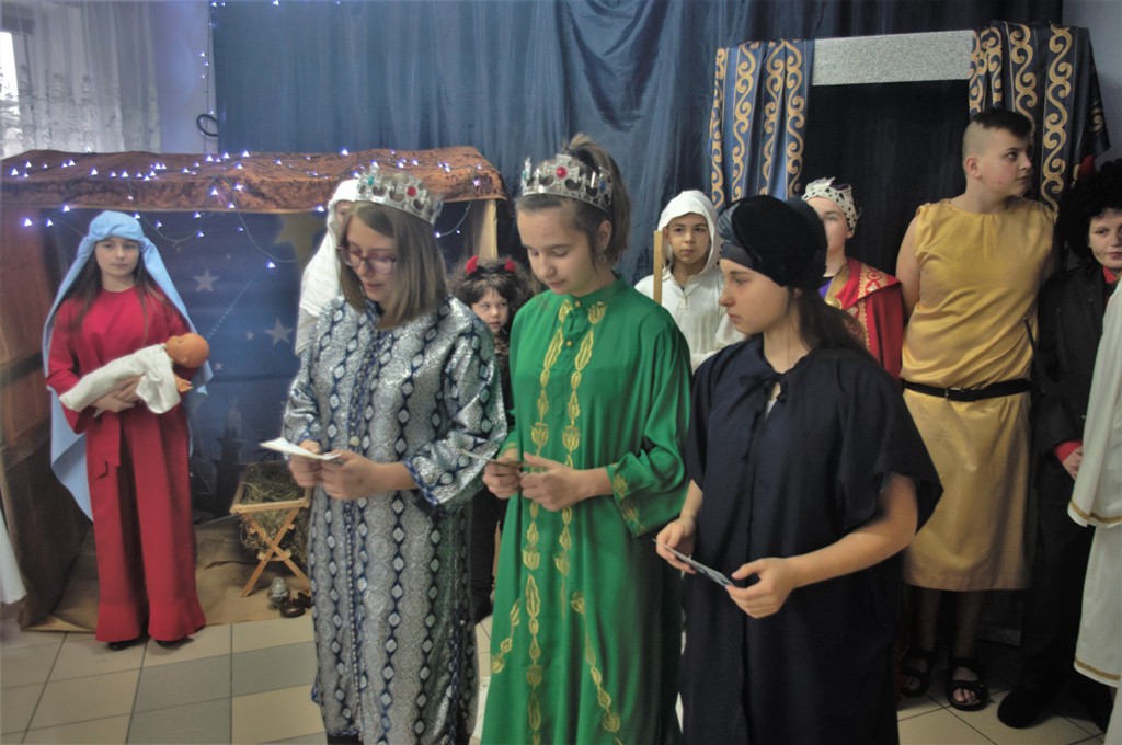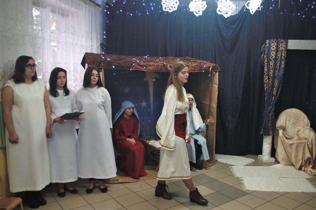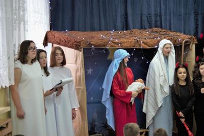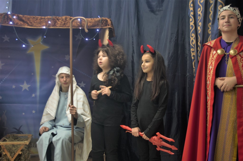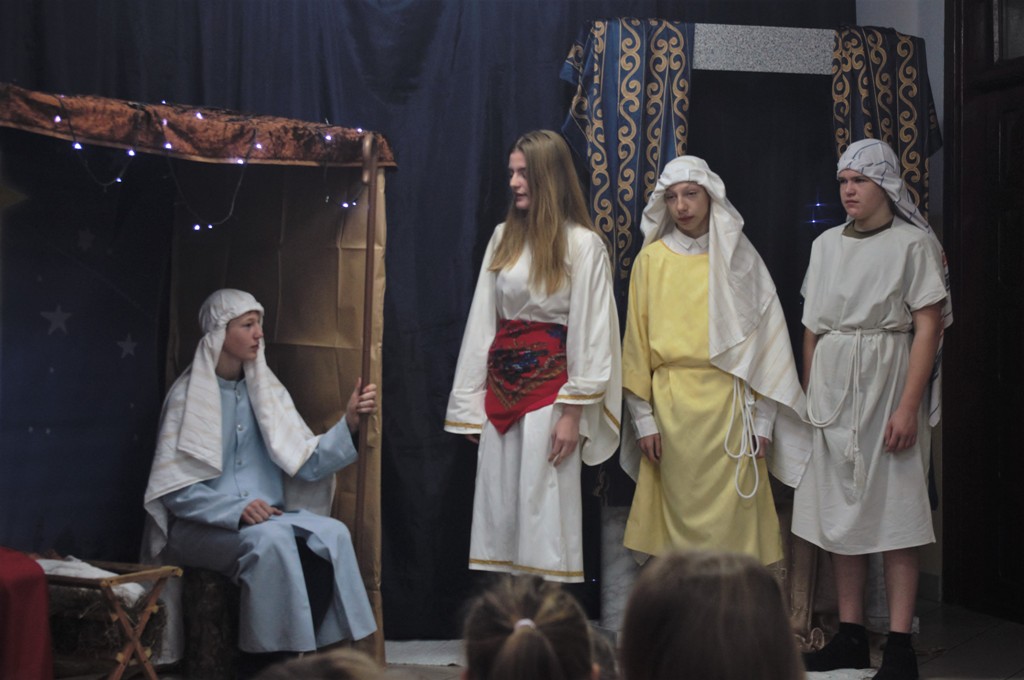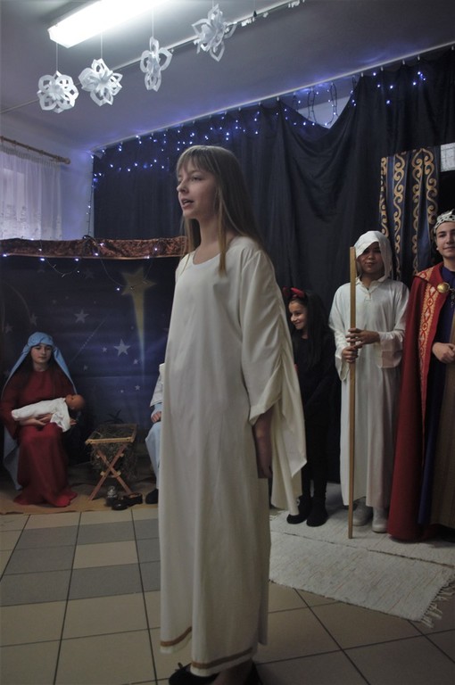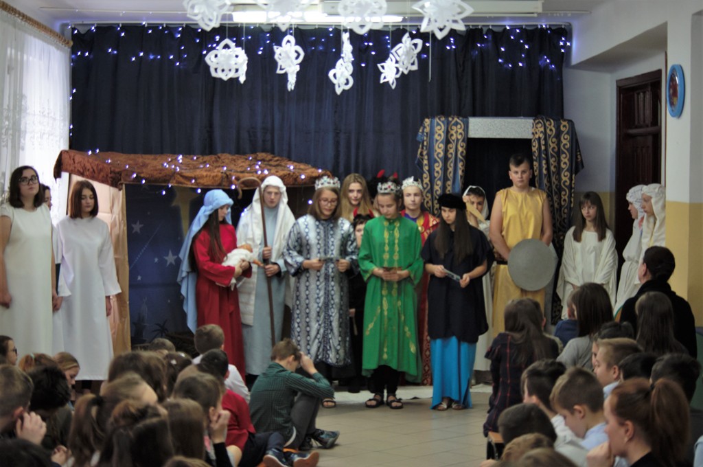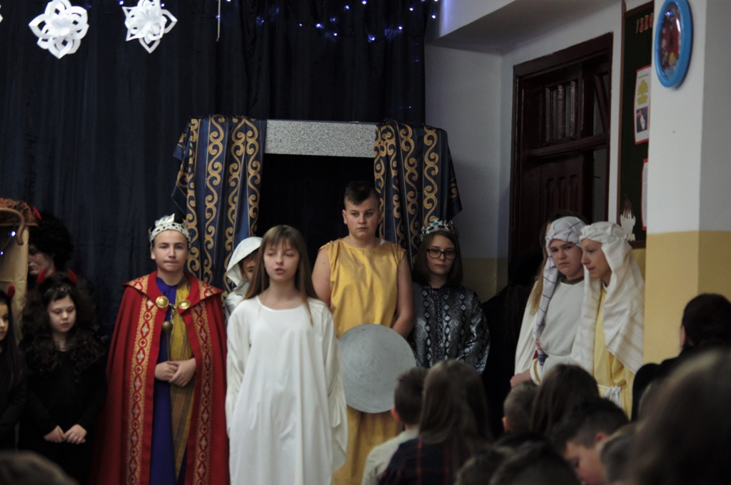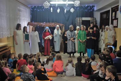 Uczniowie wprowadzili wszystkich w świąteczny nastrój śpiewając kolędy oraz opowiadając historię narodzin Jezusa. Profesjonalną grę aktorską uczniów wsparły realistyczne stroje oraz świąteczna scenografia. Występ został nagrodzony gromkimi brawami.