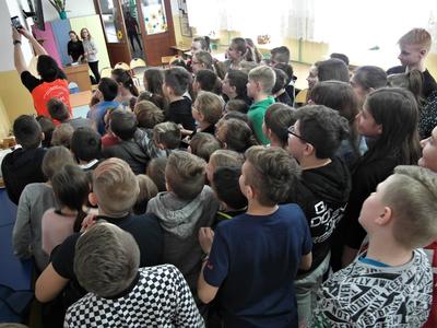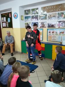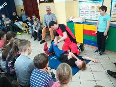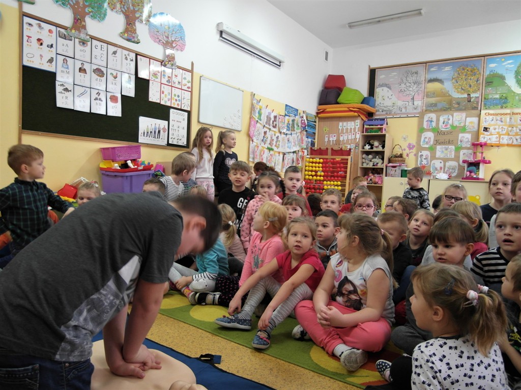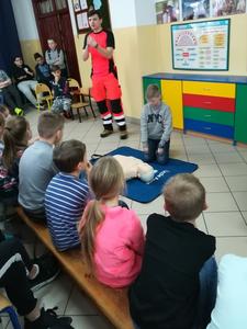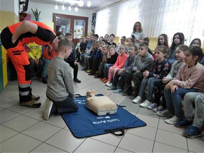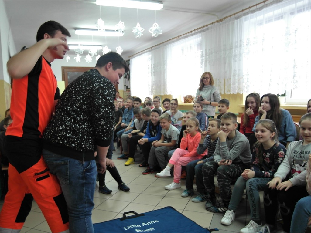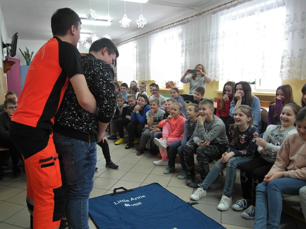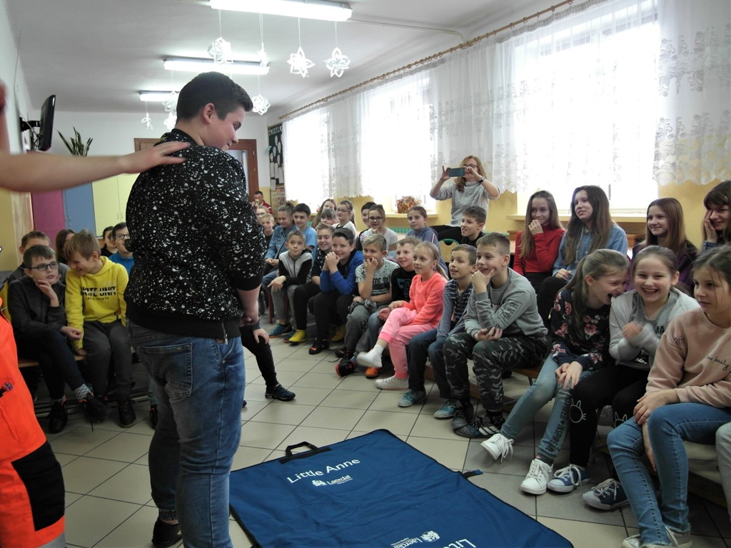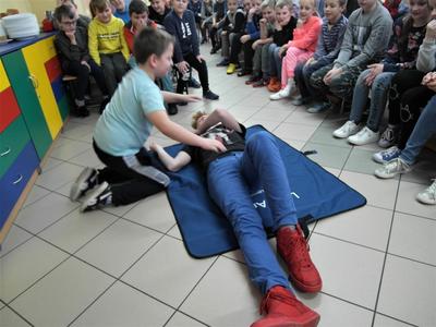 Kolejnym punktem spotkania była resuscytacja krążeniowo- oddechowa. Dzieci wspólnie z zaproszonym gościem ćwiczyły na fantomach, Bardzo częstym pytaniem do pana Rafała było zagadnienie dotyczące pozycji bocznej ustalonej. Dzieci uzyskały konkretne wskazówki w jaki sposób układamy osobę poszkodowaną, dlaczego ją tak układamy oraz jak należy to zrobić aby czynność ta była o wiele prostsza.