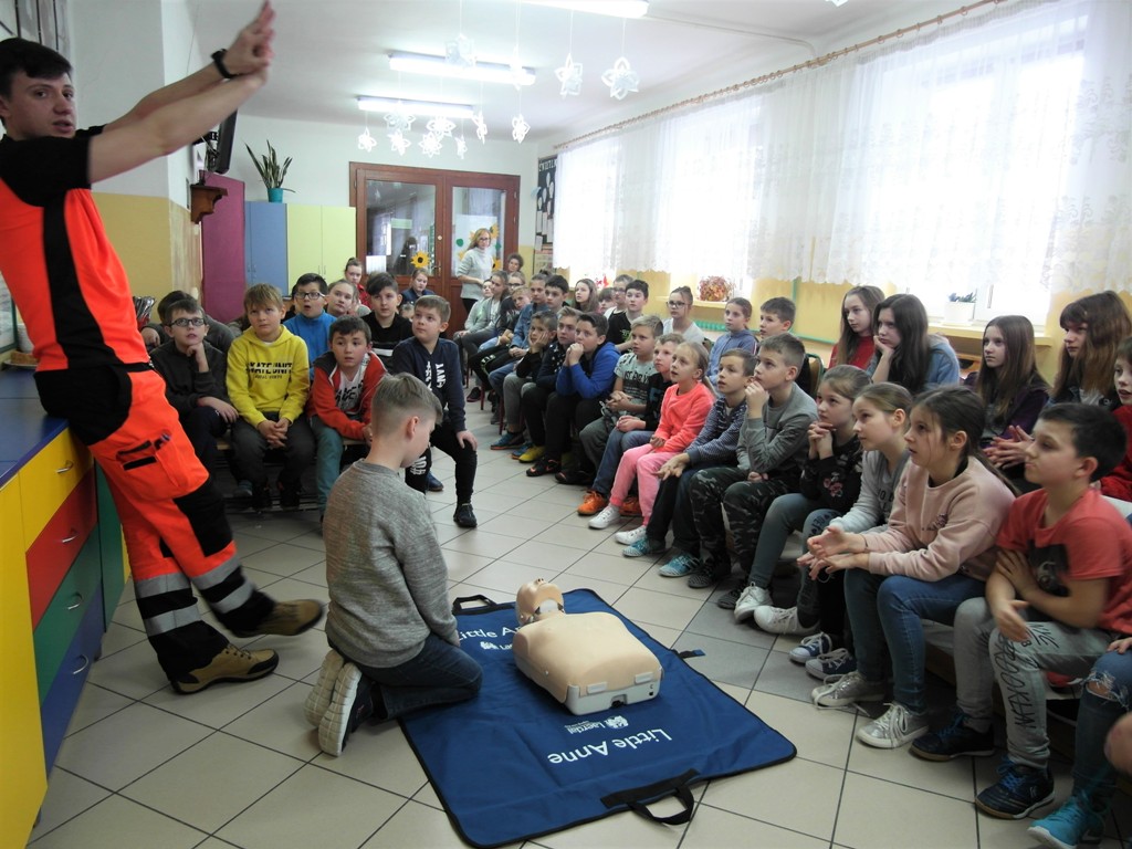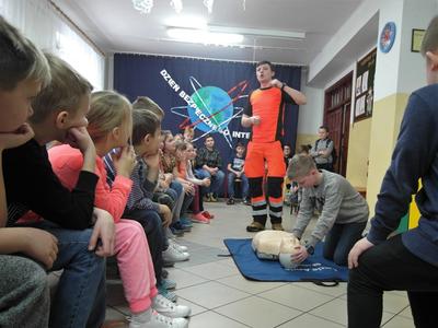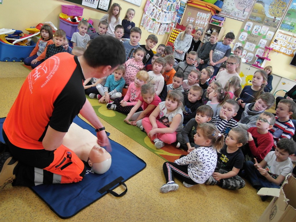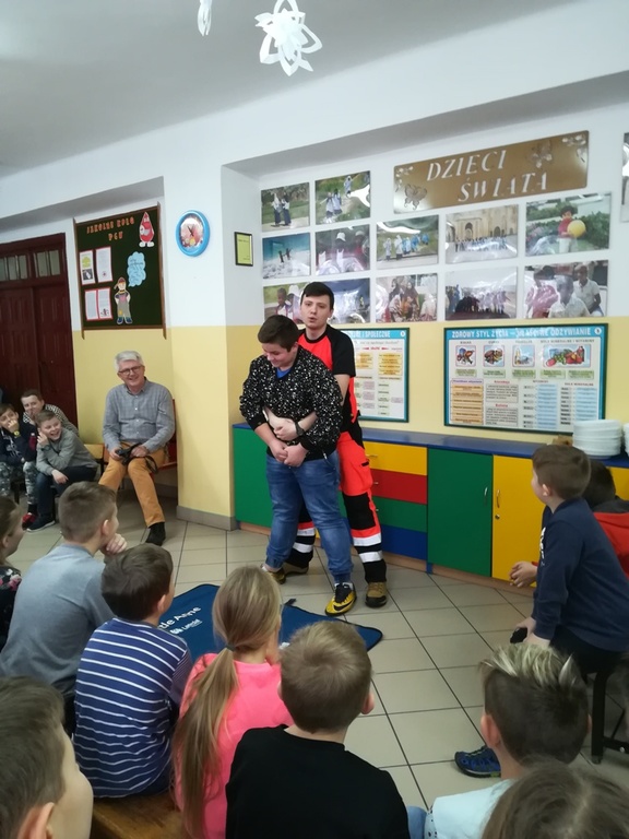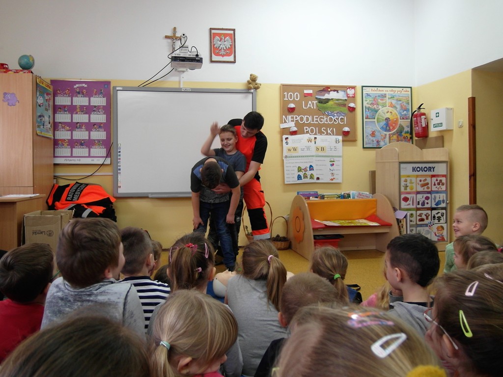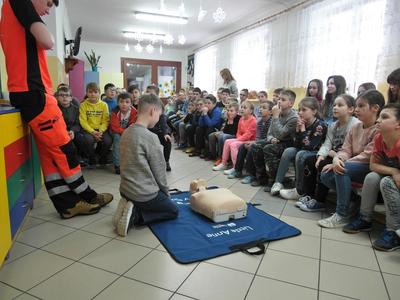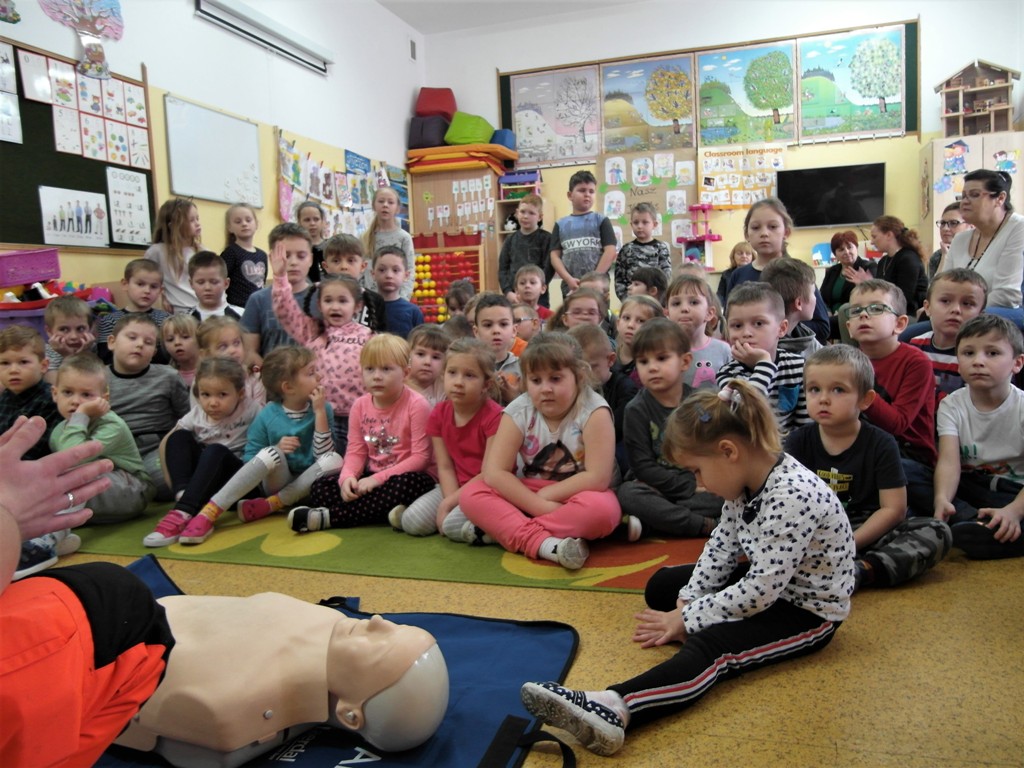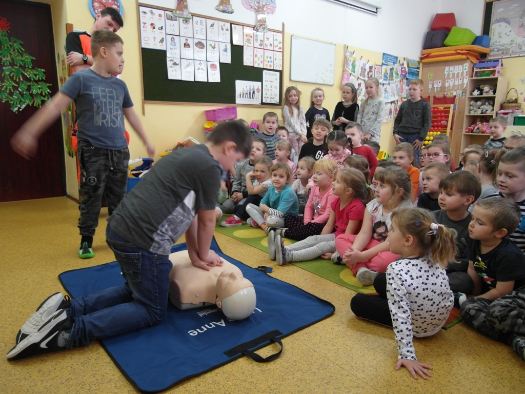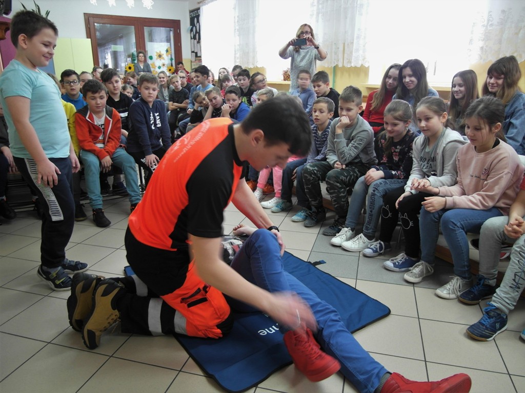 Spotkanie to miało na celu przekazanie dzieciom informacji na temat udzielania pierwszej pomocy oraz prawidłowego zachowania się w czasie wypadku a także w sytuacjach zagrożenia zdrowia i życia.