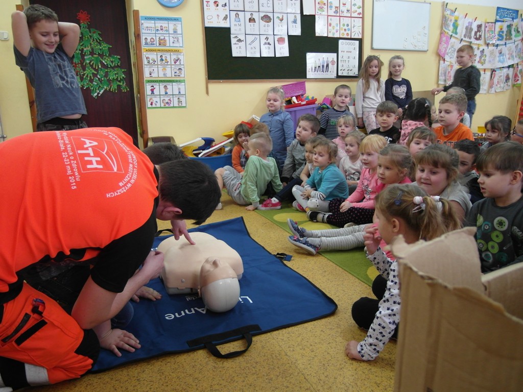 Ratownik medyczny wyjaśnił dzieciom na czym polega jego praca, jak ważna jest pierwsza pomoc, dlaczego należy pomagać. Pan Rafał udzielił dokładnego instruktażu w jaki sposób wzywamy pogotowie, jakie informacje musimy podać, kiedy wzywamy pomoc, do jakiego momentu udzielamy pierwszej pomocy. Następnie wspólnie uczestnikami warsztatów przećwiczył ten schemat. Dzieci uczyły się również jak sprawdzić czy osoba poszkodowana oddycha oraz czy jest przytomna, co zrobić w przypadku oparzeń, skaleczeń, zasłabnięć, złamań, zadławień oraz spożycia środka chemicznego.