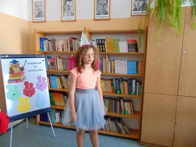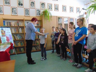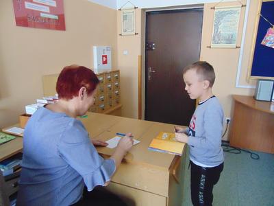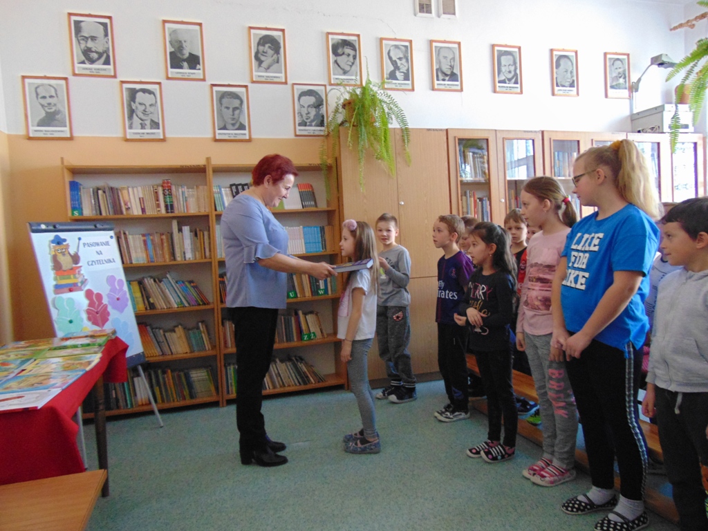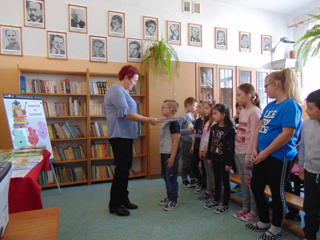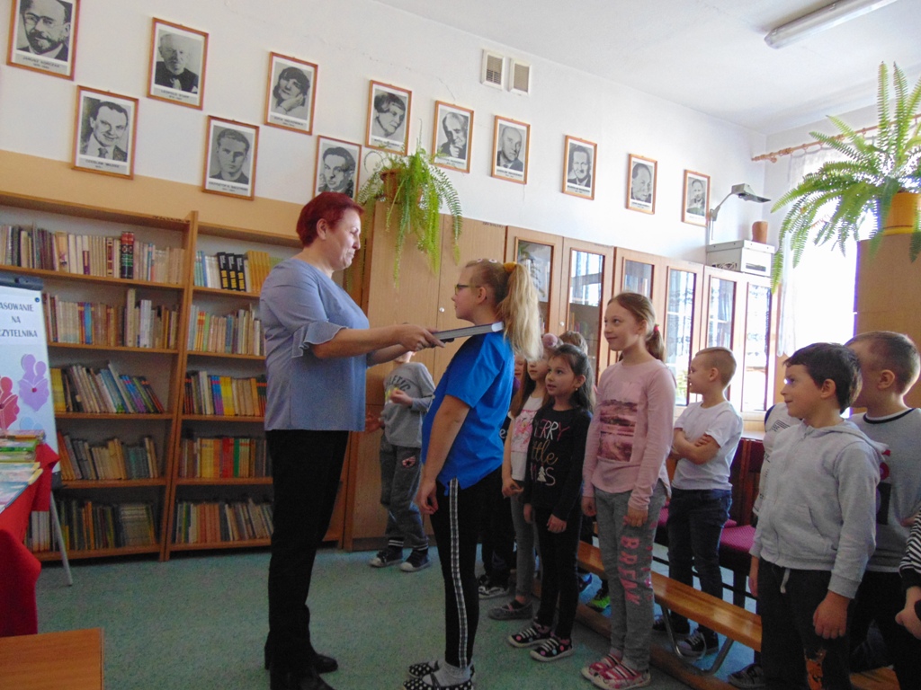 Następnie pierwszoklasiści odgadywali bajkowe zagadki, zapoznali się z księgozbiorem przeznaczonym dla najmłodszych czytelników oraz regulaminem i zasadami wypożyczania. Przyrzekali, że będą czytać i szanować książki, korzystać z ich mądrości i sumiennie wypełniać obowiązki czytelnika. Po przyrzeczeniu odbyło się uroczyste pasowanie na czytelnika oraz wypożyczenie pierwszej książki.