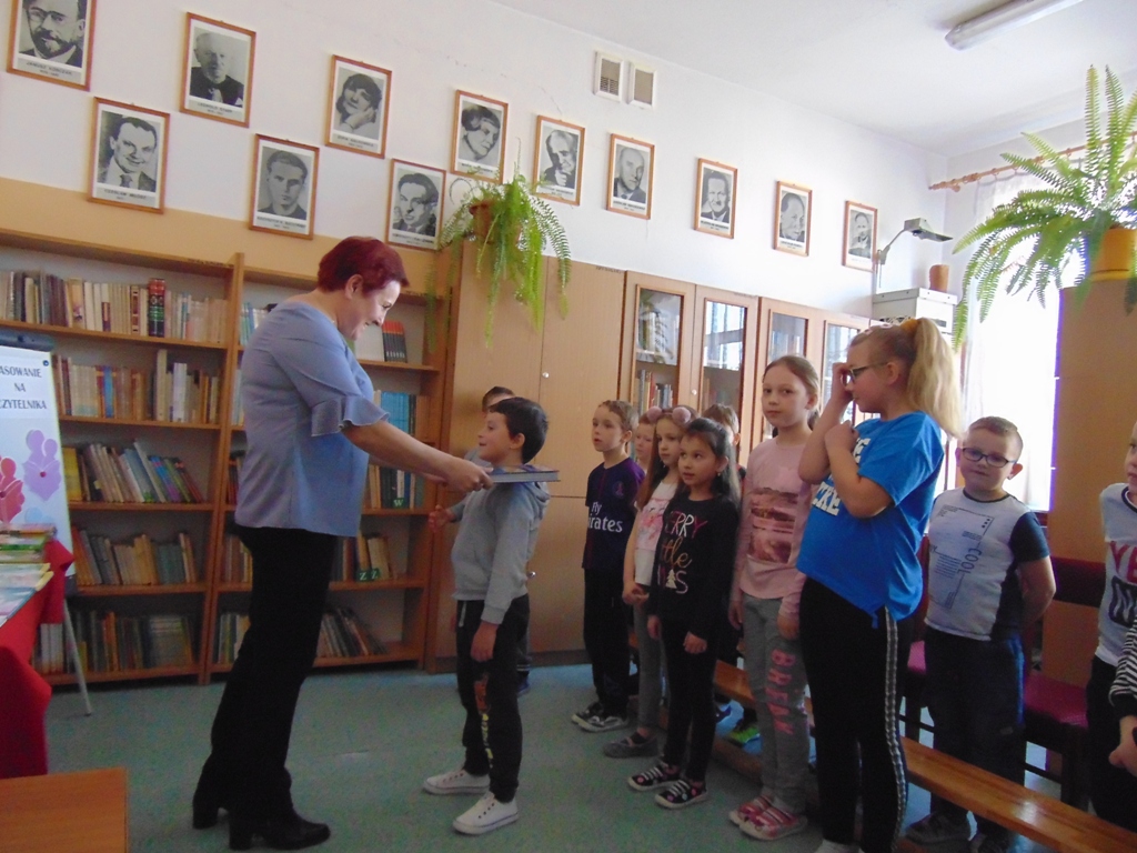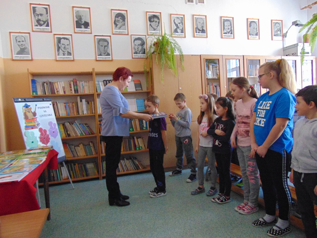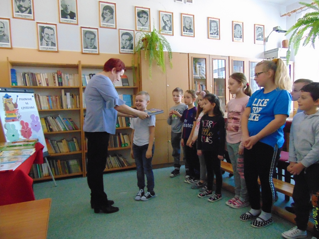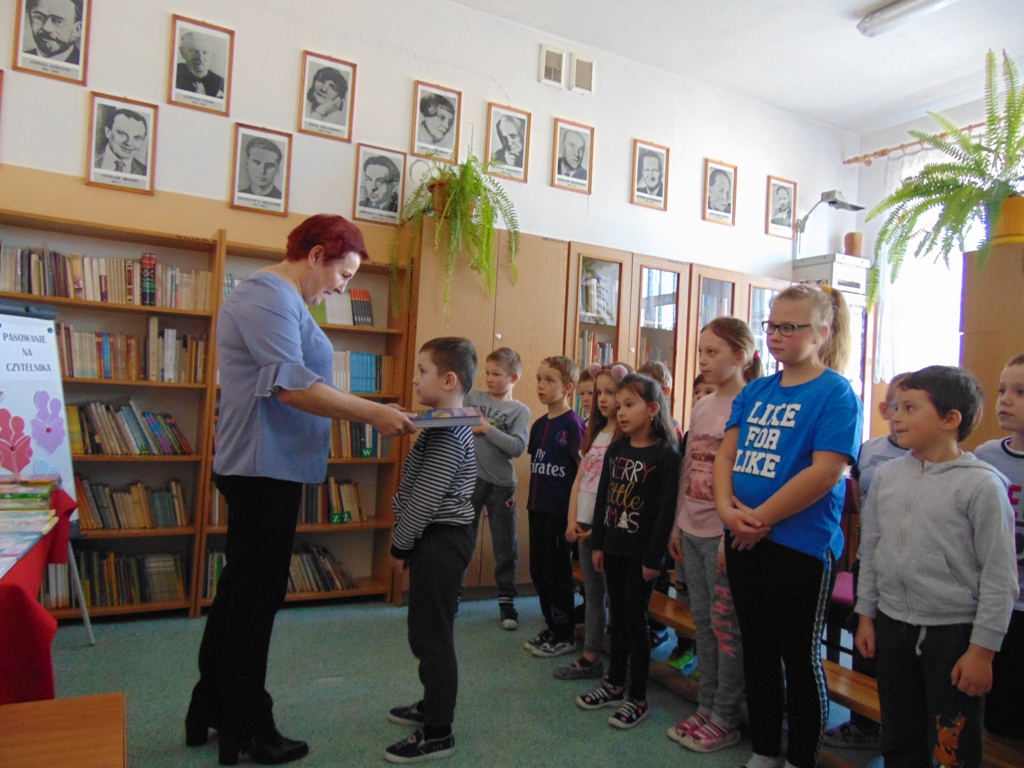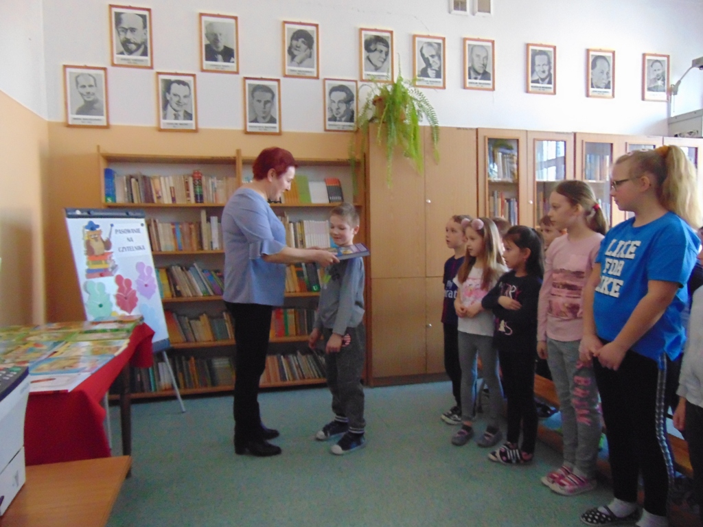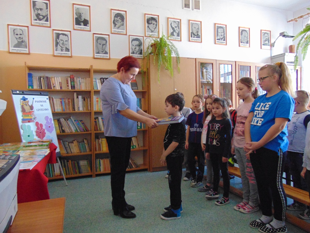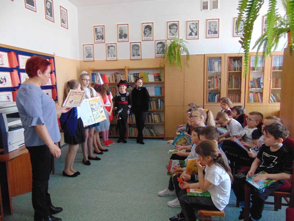 4 marca uczniowie klasy pierwszej zostali uroczyście przyjęci w poczet czytelników biblioteki szkolnej. Podczas uroczystości obejrzeli przedstawienie pt. „Zaczarowany świat bajek”. W baśniowe postaci wcieliły się uczennice z klasy V b.