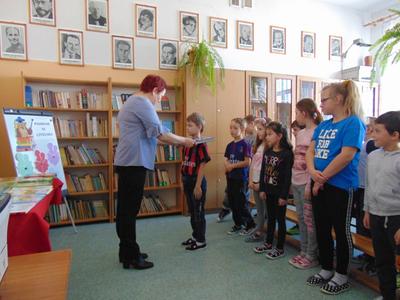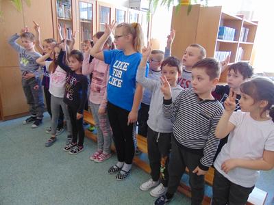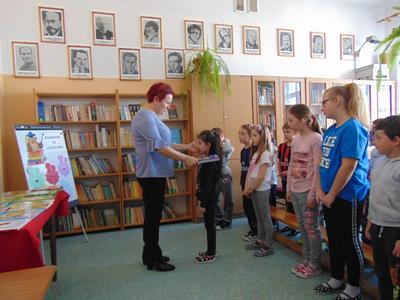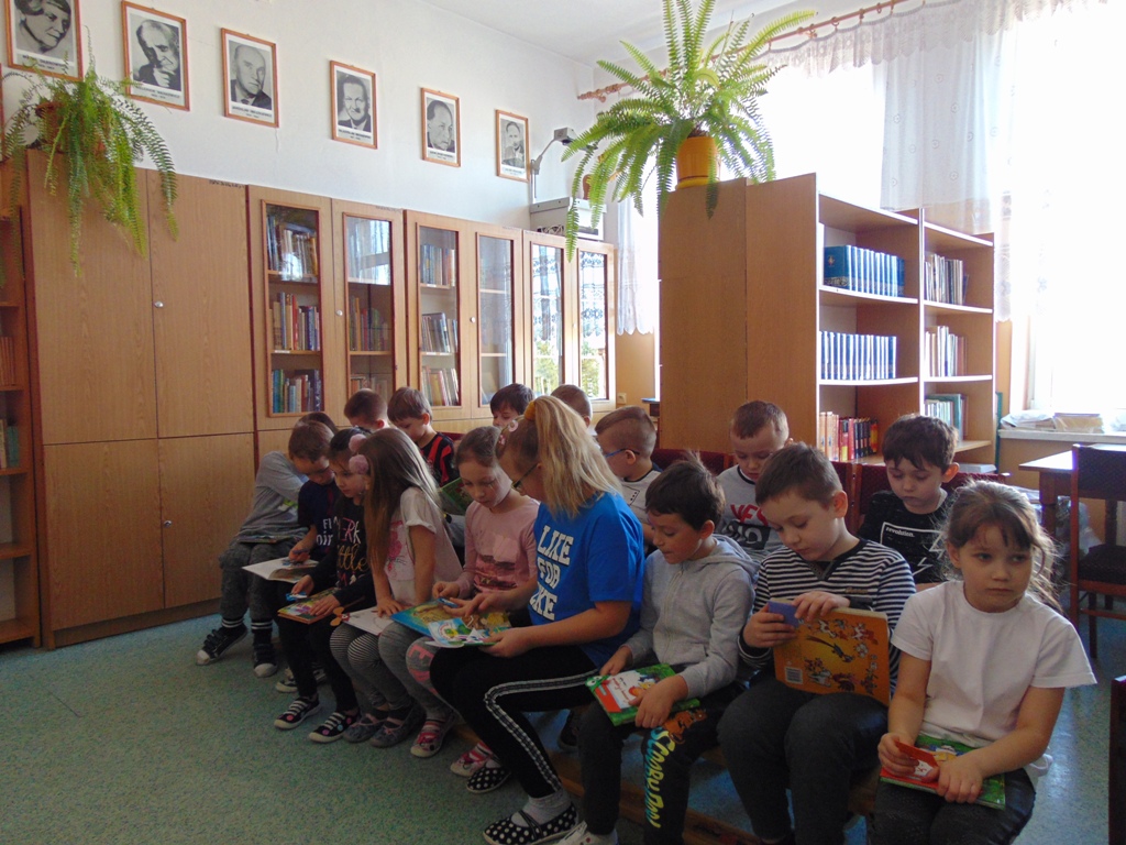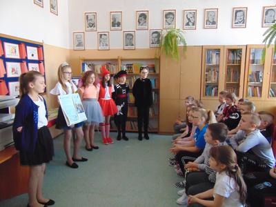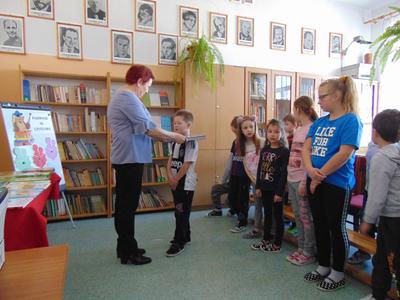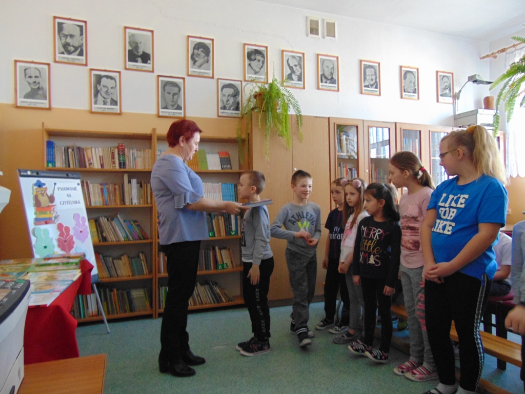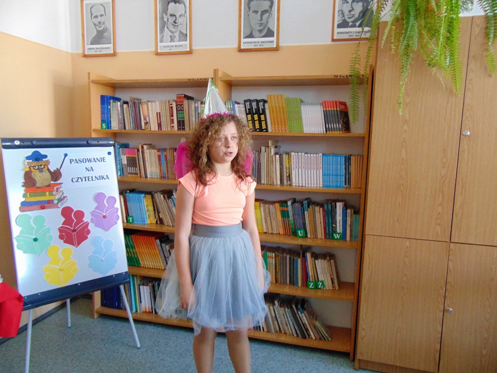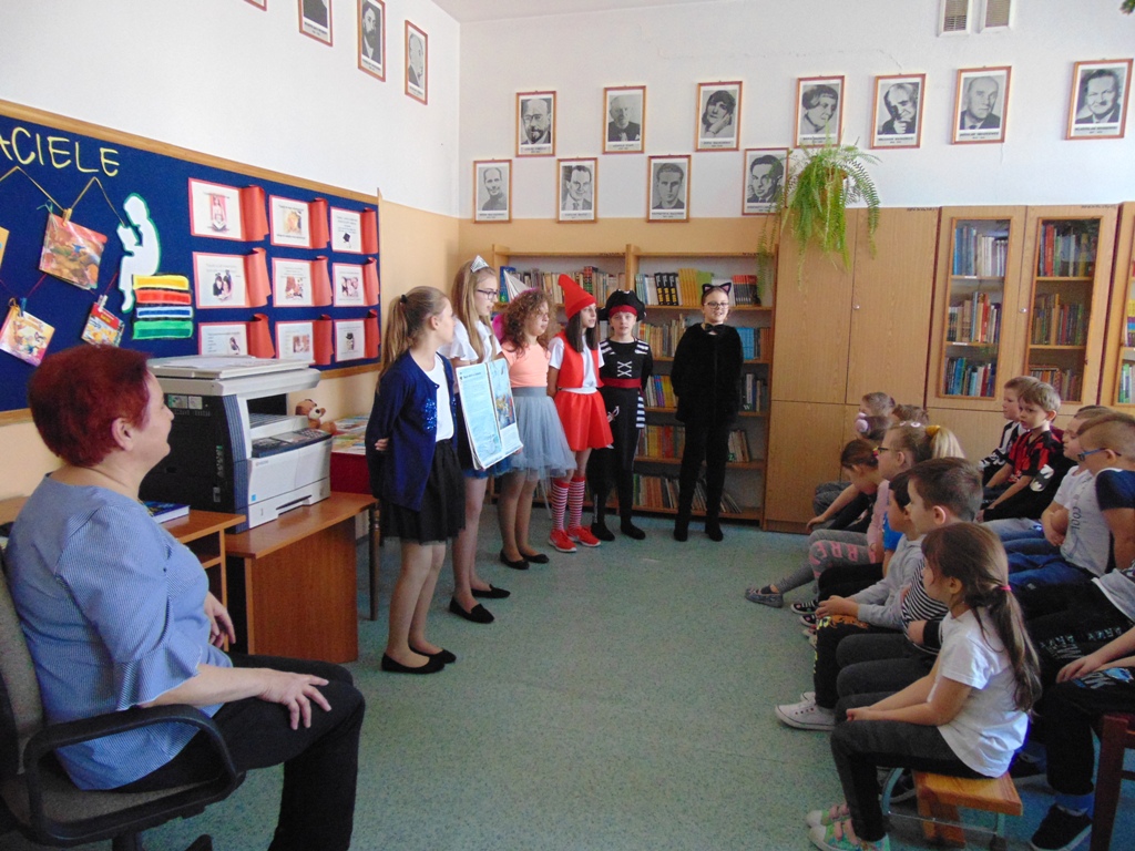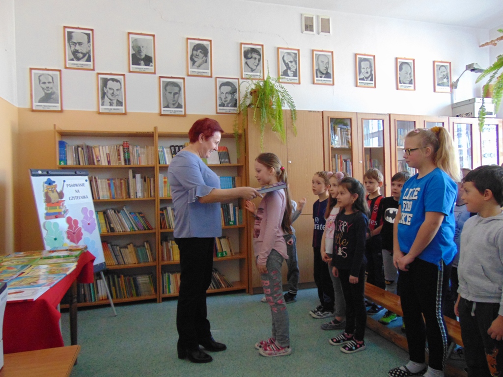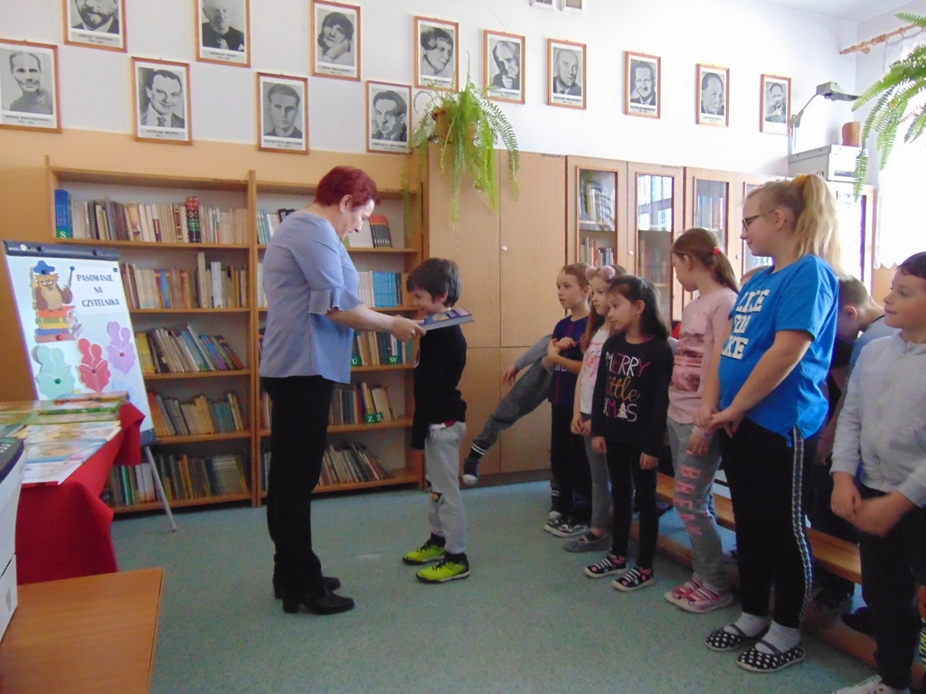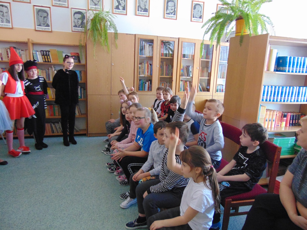 4 marca uczniowie klasy pierwszej zostali uroczyście przyjęci w poczet czytelników biblioteki szkolnej. Podczas uroczystości obejrzeli przedstawienie pt. „Zaczarowany świat bajek”. W baśniowe postaci wcieliły się uczennice z klasy V b.