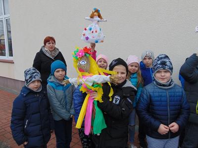 Młodsze klasy wraz z wychowawcami odwołując się do tradycji wybrały się na wycieczkę gdzie pożegnały zimę a przywitały wiosnę. Dzieci przygotowały marzannę- słomianą kukiełkę symbolizującą odchodzącą zimę. Wszyscy w barwnym korowodzie udali się nad rzekę. Mówiąc piękne wiersze i śpiewając piosenki pożegnali marzannę, która popłynęła nurtem rzeki zabierając od nas śnieżnobiałą porę roku.