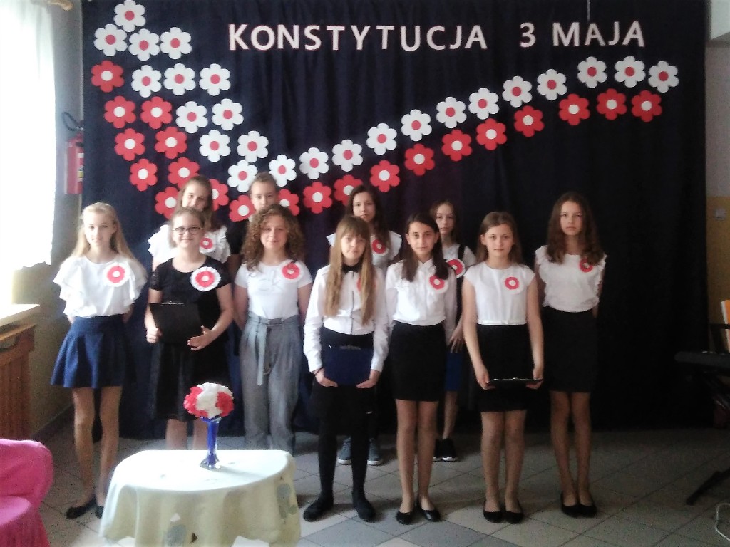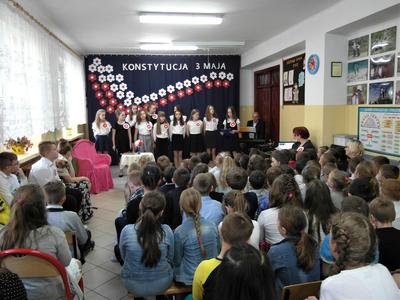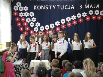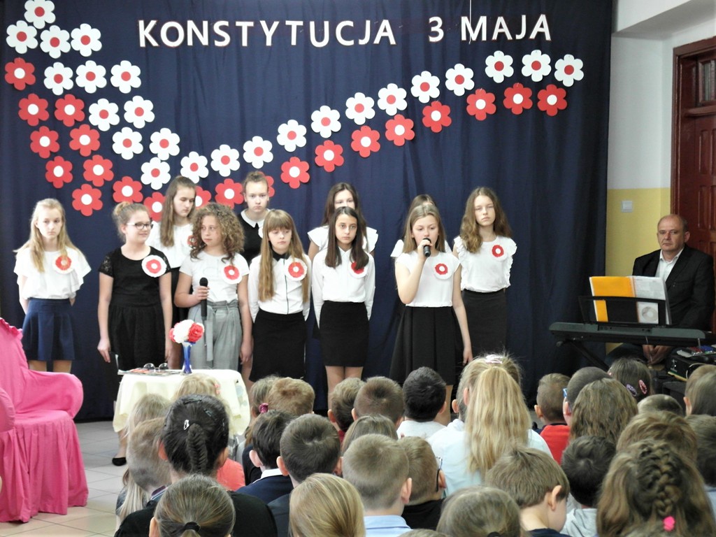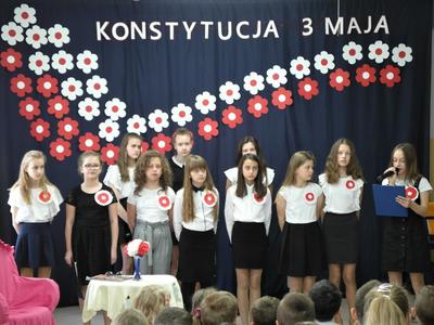 30 kwietnia br. w naszej szkole odbyło się spotkanie ogólnoszkolne z okazji 228 rocznicy uchwalenia Konstytucji 3 Maja. W jego przygotowanie zaangażowani byli uczniowie z klasy Vb i VI pod kierunkiem wychowawców: p. Ewy Bedlechowicz i p. Katarzyny Bień oraz nauczyciela muzyki: p. Krzysztofa Siejki.