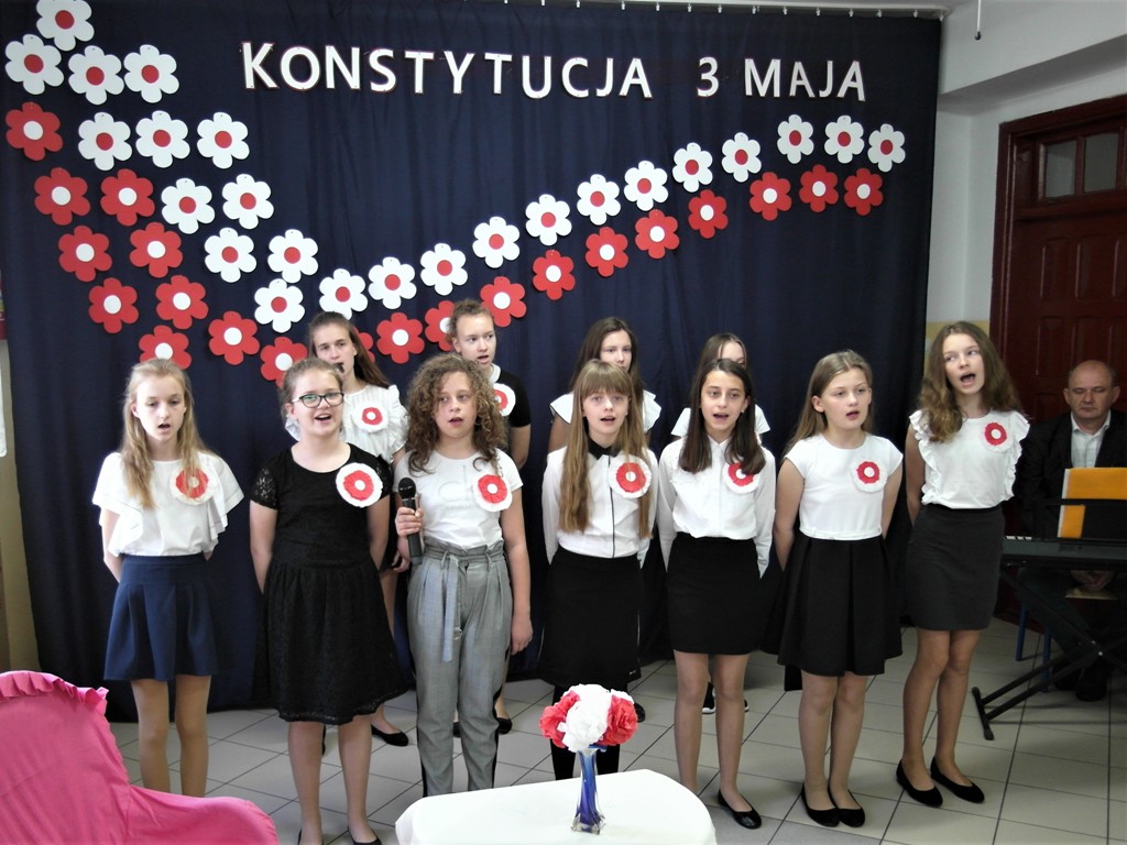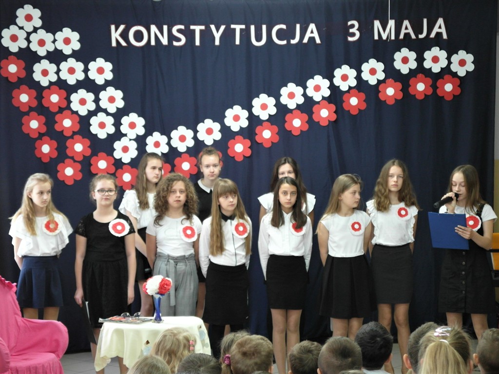 Uroczystość rozpoczęła się od odśpiewania hymnu narodowego. Podczas apelu uczniowie przypomnieli tło historyczne wydarzeń z 3 maja 1791 roku i wyjaśnili, dlaczego jest to tak ważny dzień dla naszego kraju. Uroczystość wzbogaciły pieśni patriotyczne i scenografia przygotowana w barwach narodowych, a jej powagę podkreśliły galowe stroje uczniów.