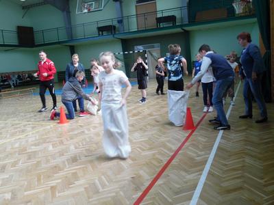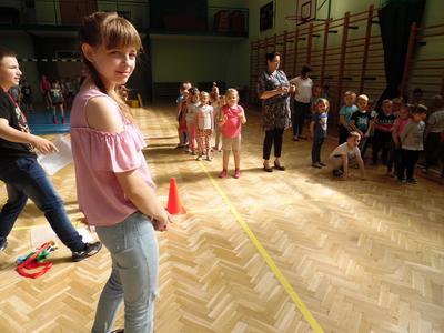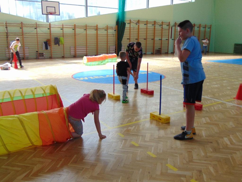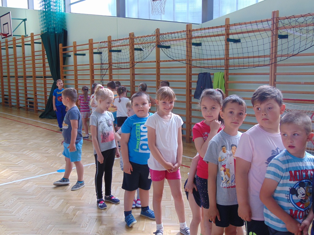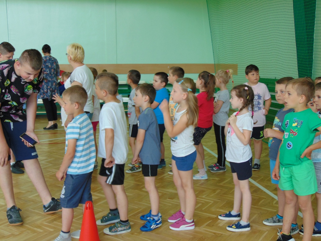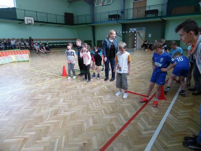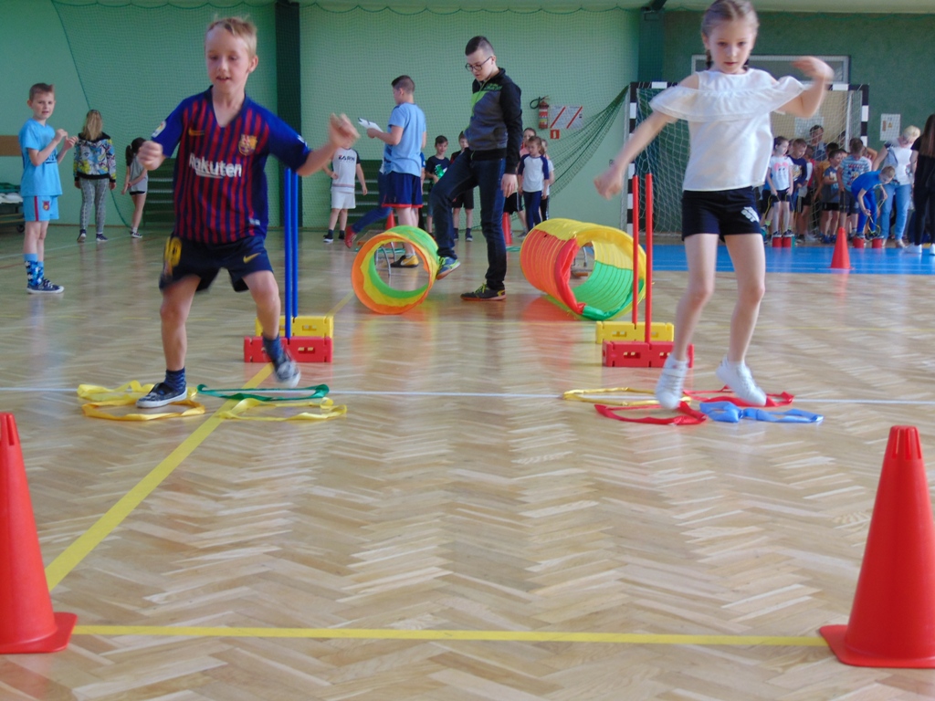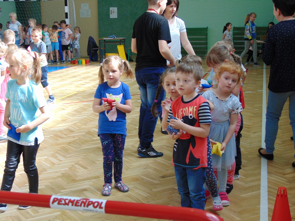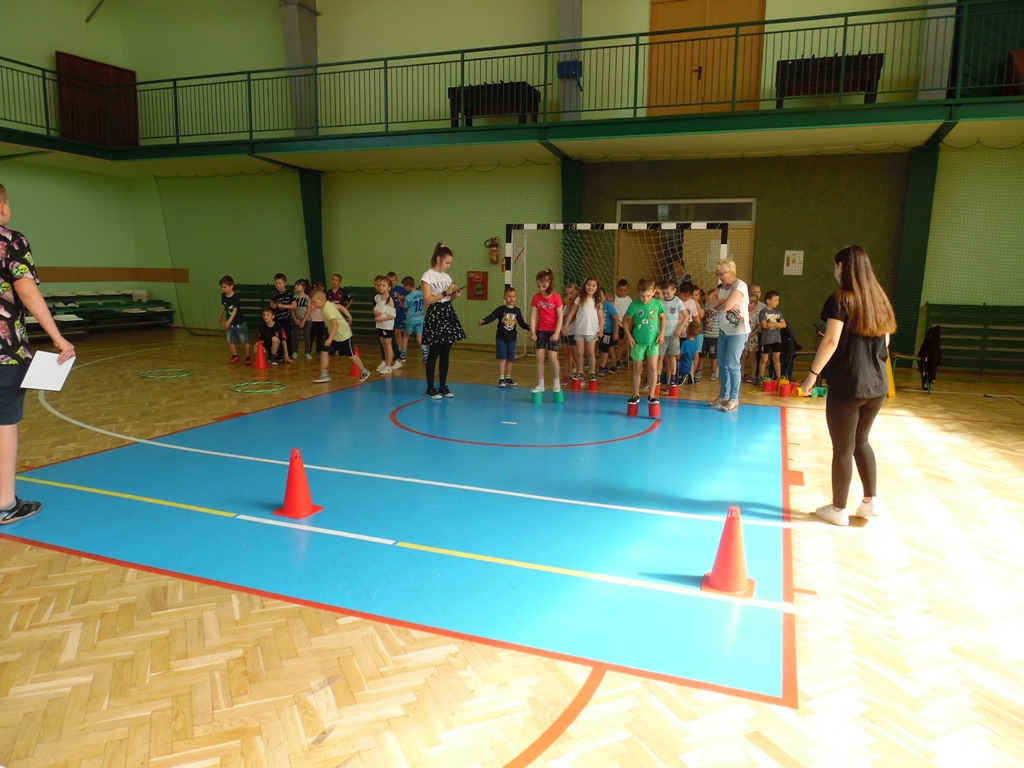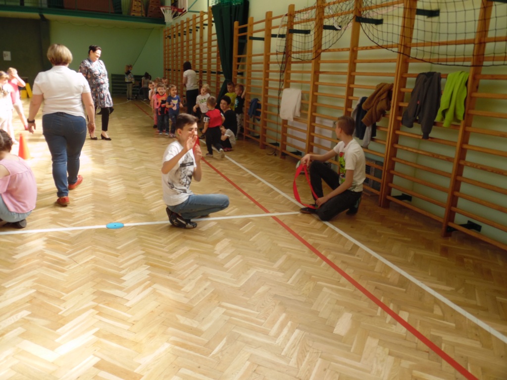 Dla najmłodszych dzieci i uczniów klas 0, I i II, w hali sportowej zostały ustawione stanowiska, przy których można było sprawdzić swoją sprawność fizyczną, odbyły się również wyścigi rzędów. W czasie wykonywania ćwiczeń uczniowie musieli m.in. pokonać w workach (skacząc) wyznaczony odcinek toru, trafić piłką do małej bramki, rzucić woreczkiem do zawieszonego koła, skakać z piłką umieszczoną między kolanami.