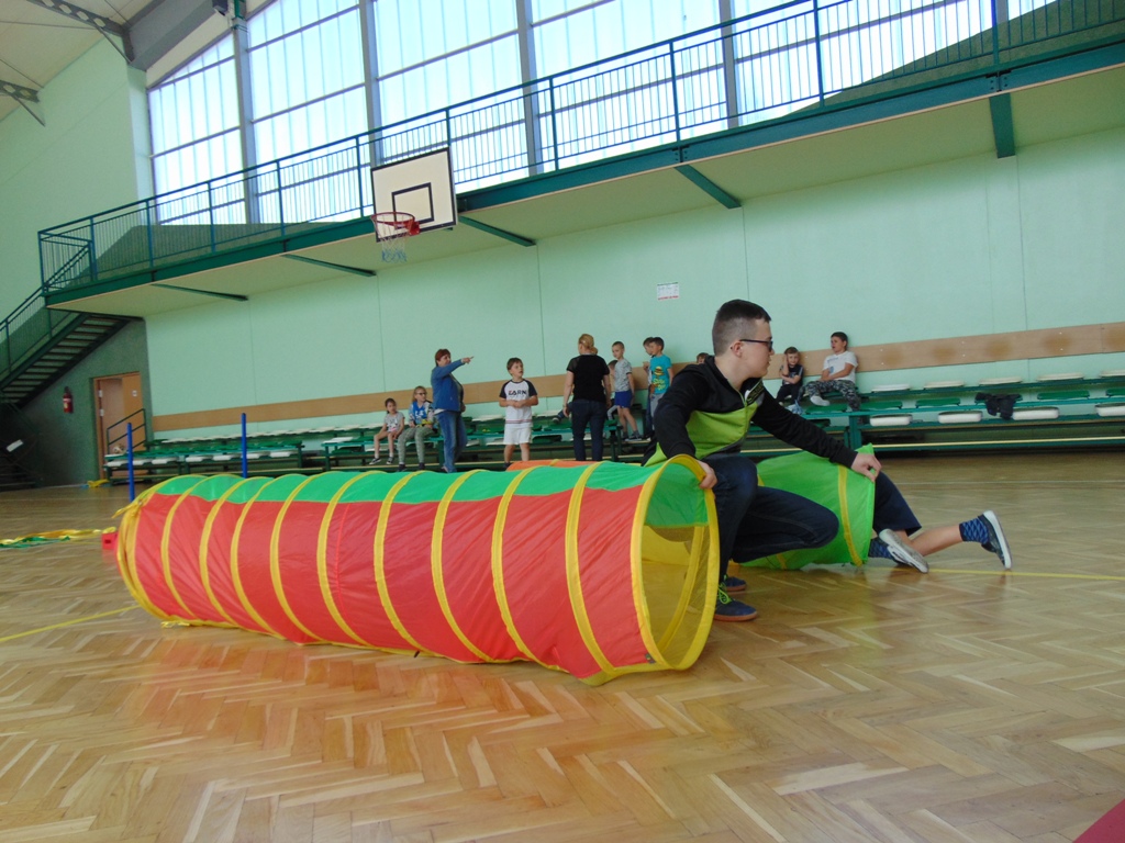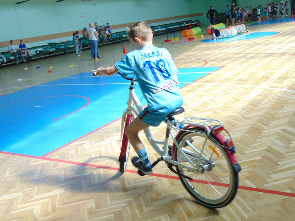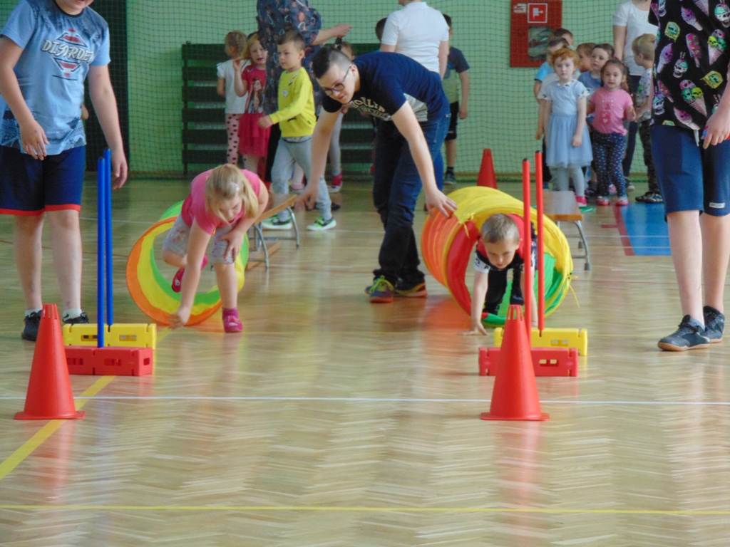 Oprócz tego dzieci mogły sprawdzić się, pokonując na czas tor przeszkód (przejść po ławeczce, przez tunel, biec slalomem, chodzić na szczudłach, kręcić kołem hula-hop, wykonać jak najwięcej przysiadów w ciągu 30 sekund, podbijać piłkę nogą, jak najwolniej przejechać rowerem wyznaczony tor jazdy. Najmłodsi chętnie i z wielkim zaangażowaniem podeszli do wykonywania ćwiczeń. Pomagali im w tym uczniowie klasy VII, którzy prowadzili i sędziowali poszczególne konkurencje.