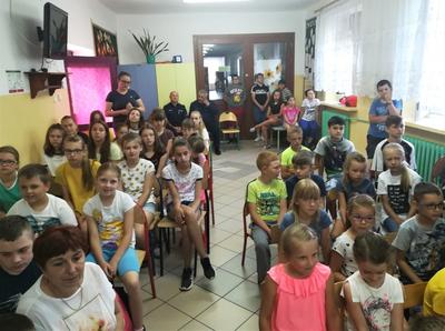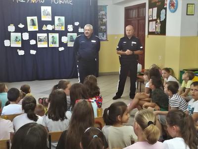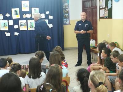 Jak każdego roku tuż przed wakacjami z uczniami naszej szkoły spotkali się funkcjonariusze z Komisariatu Policji w Przedborzu. Policjanci przeprowadzili dwie pogadanki na temat bezpieczeństwa dzieci w czasie wakacyjnego wypoczynku. Zwrócili uwagę na uczestnictwo w ruchu drogowym, w czasie pobytu nad wodą i w górach.