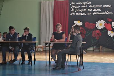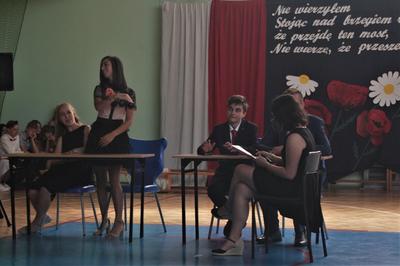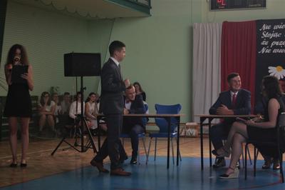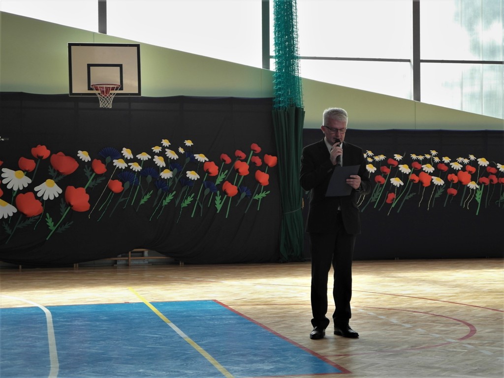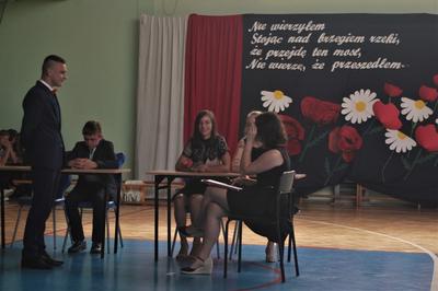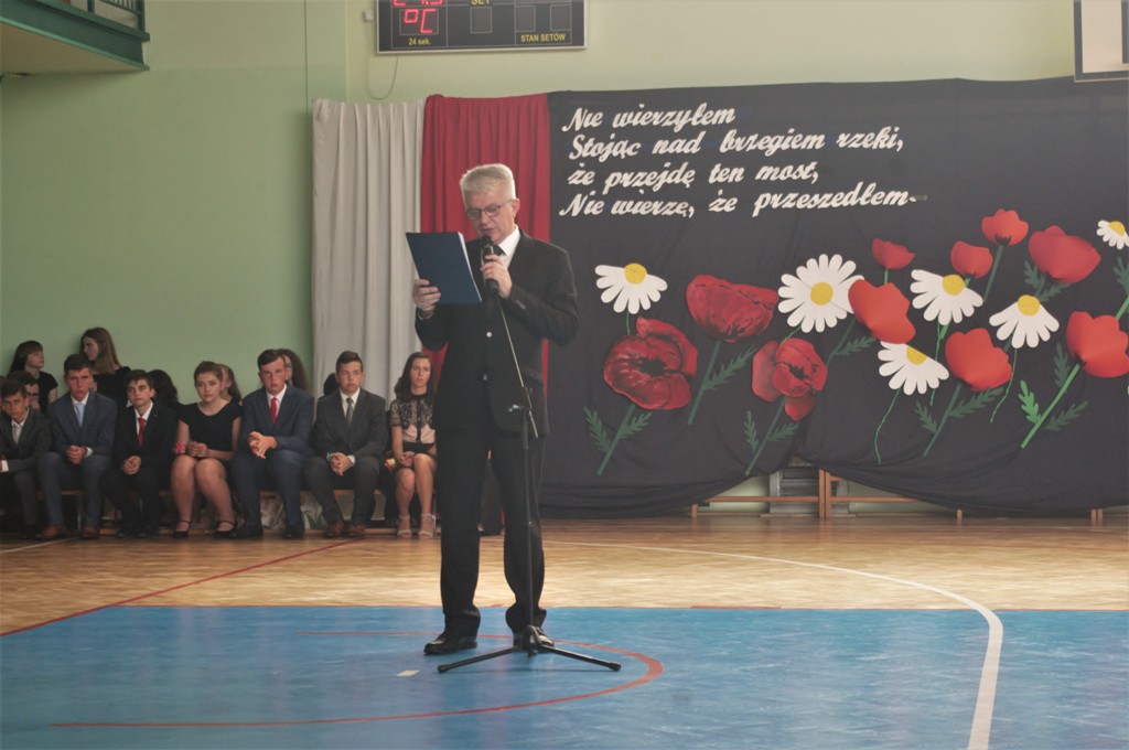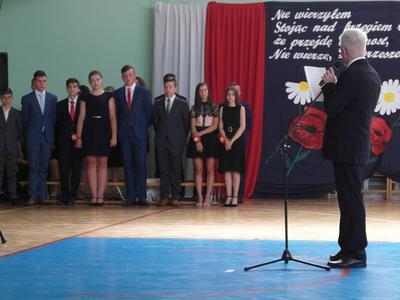 Następnie odbyła się główna część akademii, czyli ślubowanie, po którym dyrektor szkoły Leszek Wróblewski wręczył zaświadczenia o egzaminie ósmoklasisty oraz pamiątkowe dyplomy absolwenta.