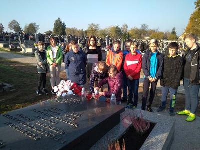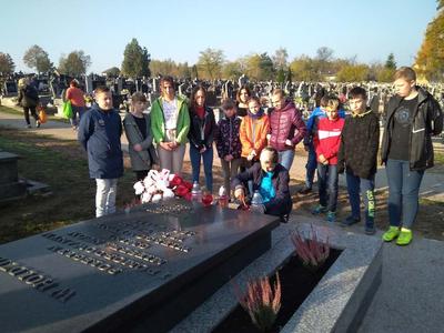 W piątek 25.10.2019r. w ramach akcji MEN "Szkoła pamięta" uczniowie z klas V, VIb oraz VII wraz z wychowawczyniami wybrali się na cmentarz w Wielgomłynach. Okres przed dniem Wszystkich Świętych to odpowiedni moment na wspomnienie tych, którzy odeszli od nas, czas na rozmowę dotyczącą szacunku dla zmarłych i o odpowiednim zachowaniu się w takim miejscu, jakim jest cmentarz.