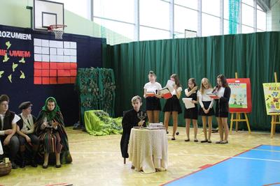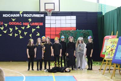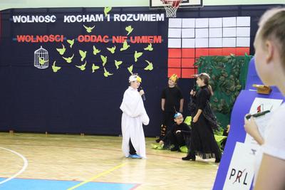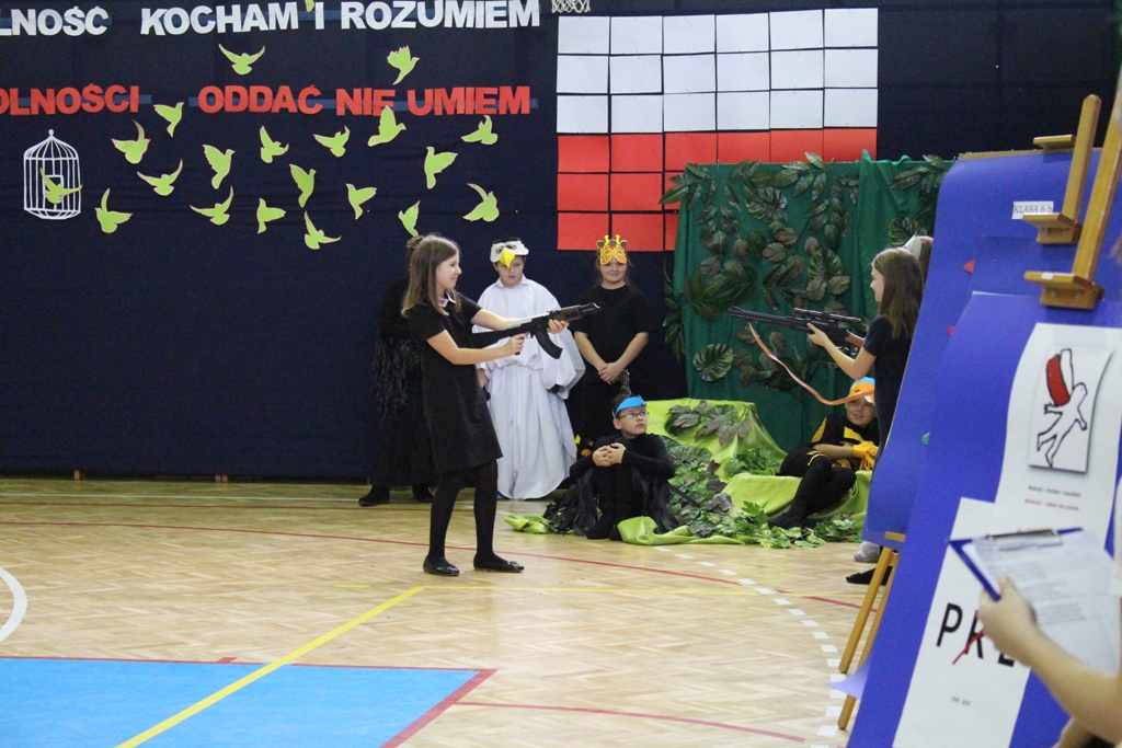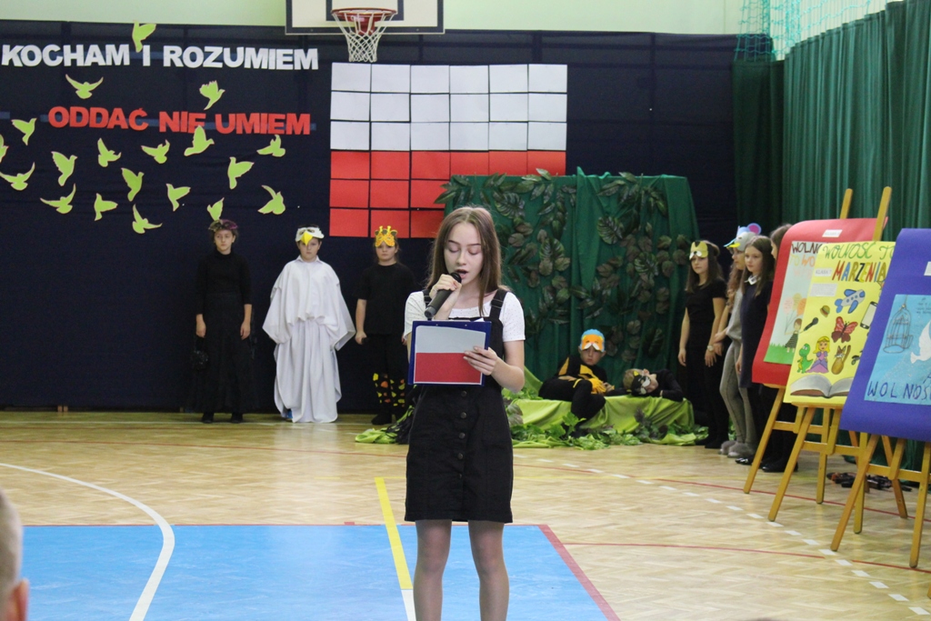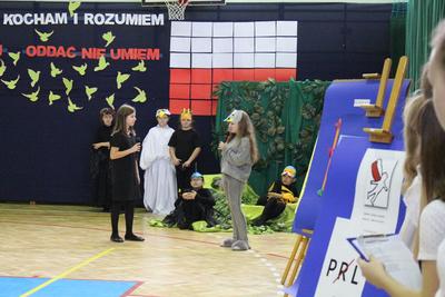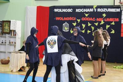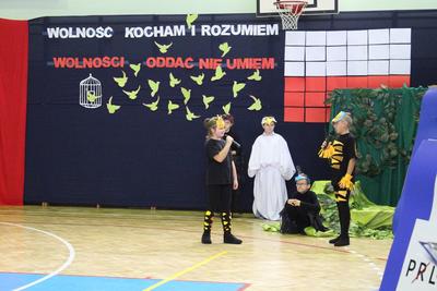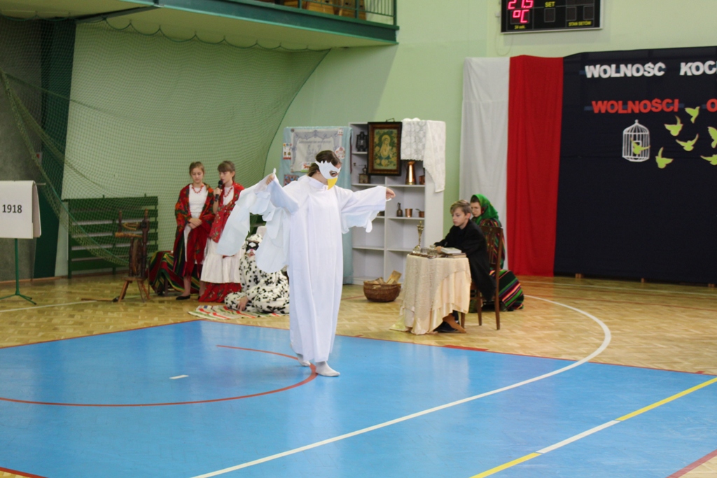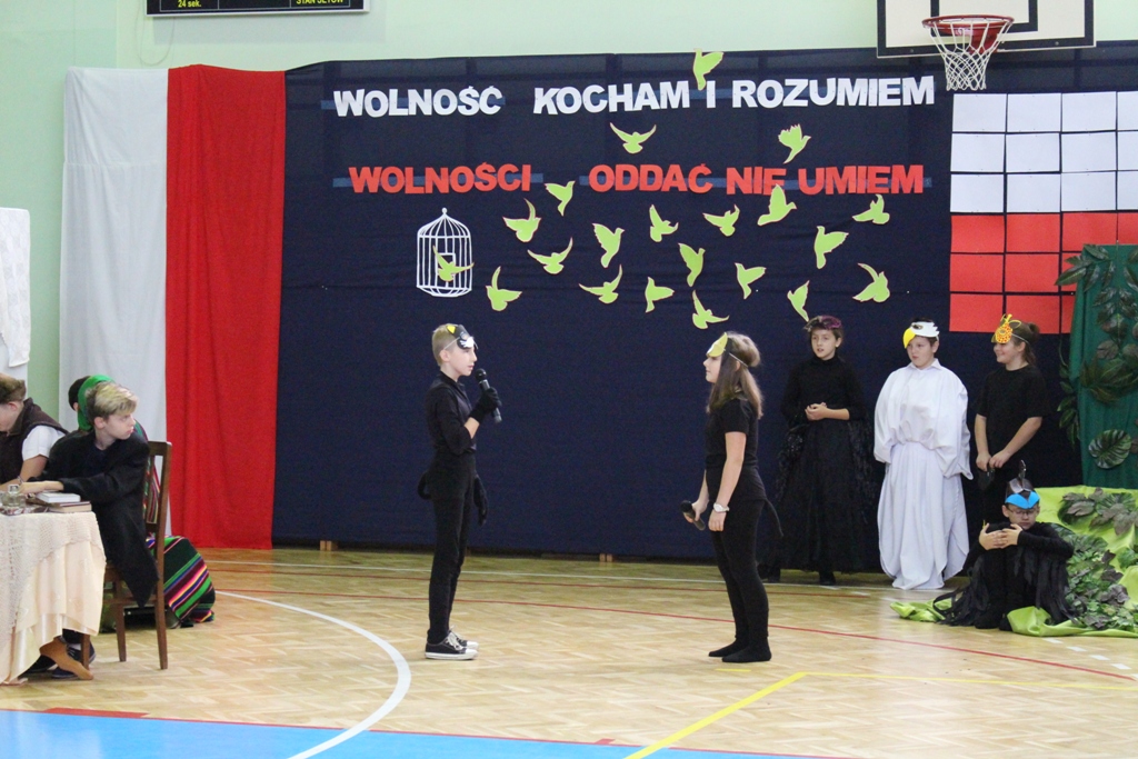 Pod kierunkiem p. Anny Nowak oraz p. Katarzyny Bień uczniowie klasy V przedstawili inscenizację pt.: ”Wolność”, a uczniowie klasy VII przedstawili spektakl pt.: ”Biały Orzeł”. Na koniec apelu, miało miejsce wspólne odśpiewanie hymnu państwowego. Wszyscy uczestnicy spotkania mieli możliwość obejrzenia wystawy prac plastycznych pt.: „Czym jest dla mnie wolność”, które wykonali uczniowie z klas V-VIII.