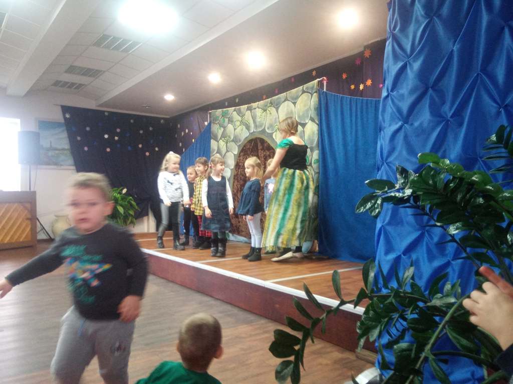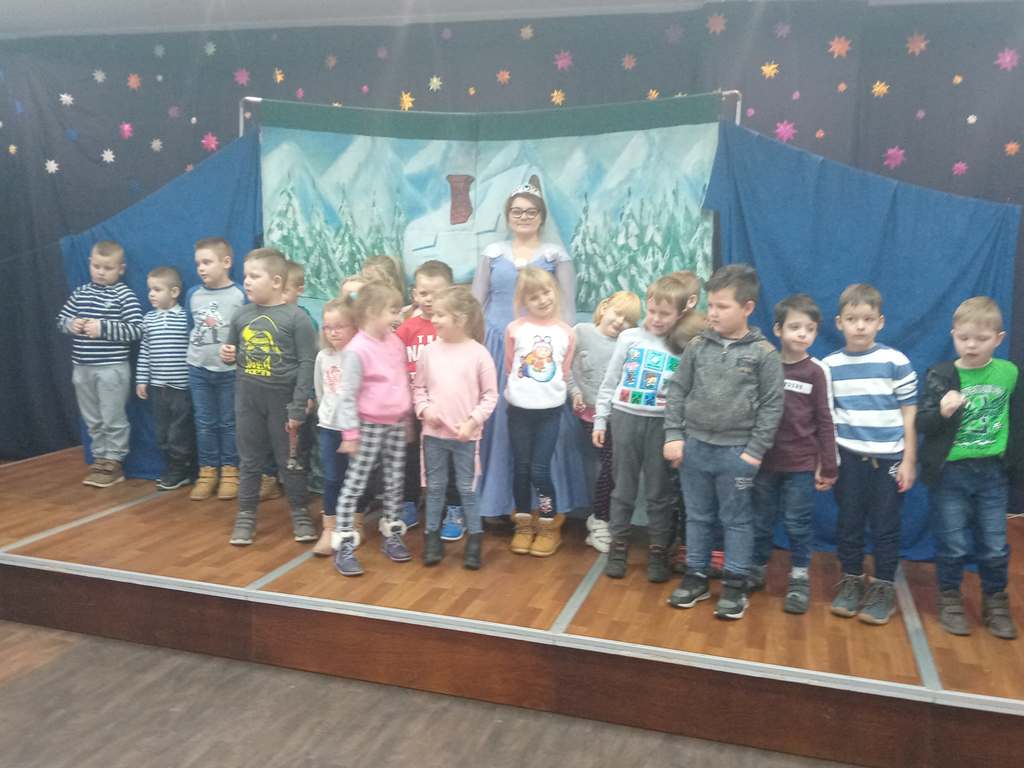 Sztuka ta adresowana była przede wszystkim do najmłodszych widzów. Tematem przewodnim stały się przygotowania do Świąt Bożego Narodzenia. Główni bohaterowie bajki „Kraina lodu”- Ana, Elsa, Kris oraz Bałwanek Olaf zapoznali dzieci z tradycjami świątecznymi tj. ubieranie choinki, szykowanie potraw na wigilijny stół itp. Aktorzy wspólnie z małymi widzami czarowali, tańczyli, śpiewali. Na koniec swojej zimowej przygody doszli do wniosku, że Święta to najpiękniejszy czas. Aktorzy złożyli dzieciom życzenia oraz poczęstowali je słodką niespodzianką, za co zostali nagrodzeni gromkimi brawami.
