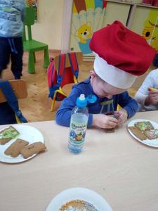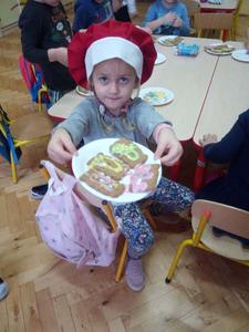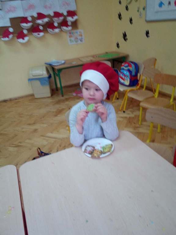 Najpierw przedszkolaki odpowiednio przygotowały się: umyły rączki oraz założyły czapki kucharskie. Następnie wspólnie z wychowawcą opowiedziały sobie czym możemy dekorować pierniki oraz w jaki sposób je przygotowujemy. Gdy wszystko było gotowe dzieci z ogromnym zaangażowaniem zabrały się do pracy. Każde ciasteczko dekorowały różnorodnymi posypkami, różnokolorowym lukrem oraz pisały na ciasteczkach specjalnymi pisakami. Efektem pracy maluchów były talerze pełne różnobarwnych pierniczków.