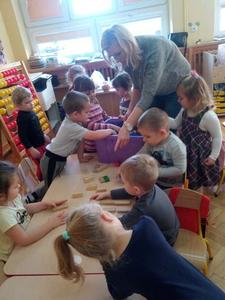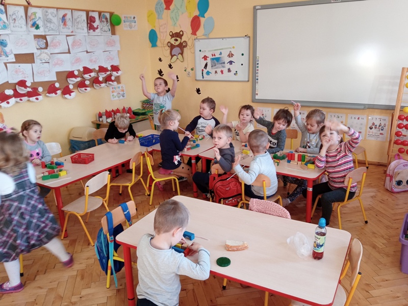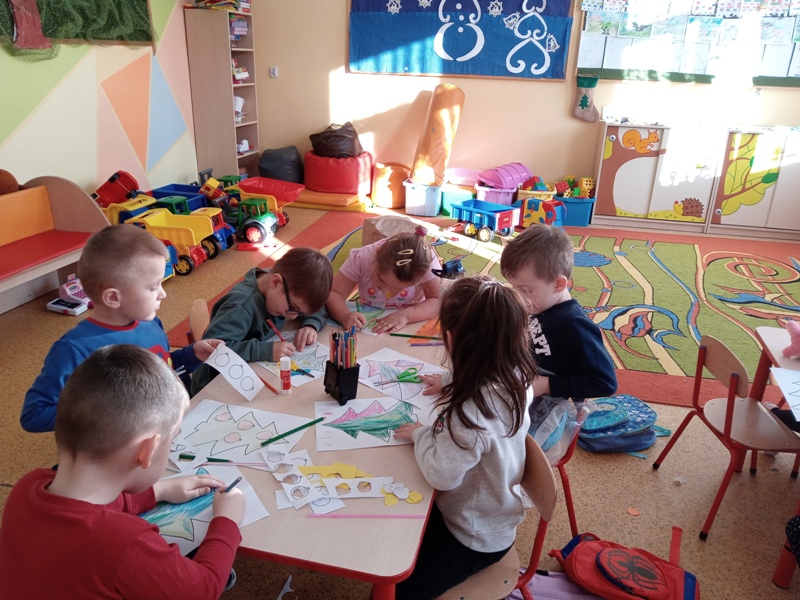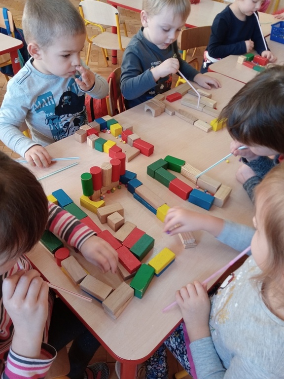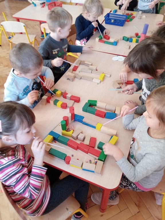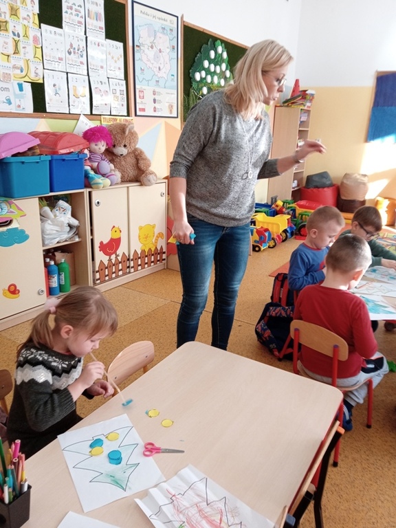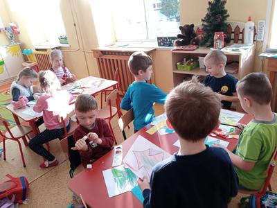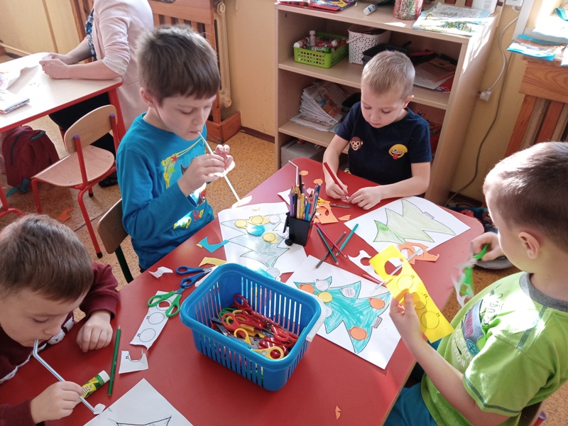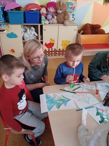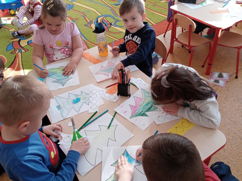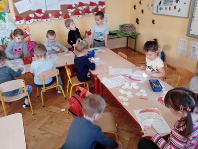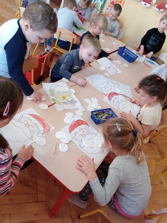 W grupie 4-latków powstały piękne portrety św. Mikołaja z brodą do zdmuchiwania z waty. Dzieci zaprojektowały również tory z klocków, w których przemieszczały styropianowe kuleczki za pomocą oddechu. Natomiast 5-latki wykonały zielone choinki, na które przenosiły za pomocą słomek ozdoby –kolorowe bombki. Dzieci wytrwale pracowały oraz ćwiczyły właściwy tor oddechowy.
