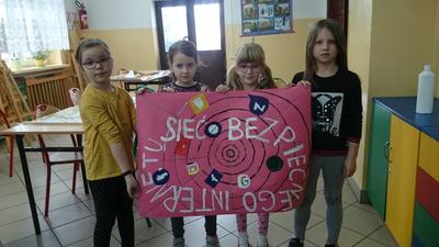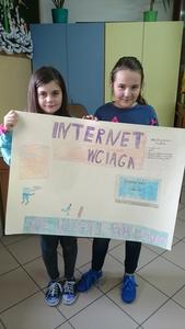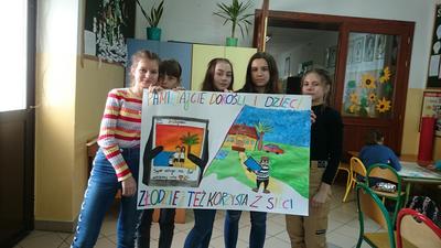 Uczniowie klas VII-VIII przygotowali i wydrukowali ulotki informacyjne dla rodziców i mieszkańców gminy, pt. „Działajmy razem na rzecz bezpieczeństwa dzieci i młodzieży w sieci”.