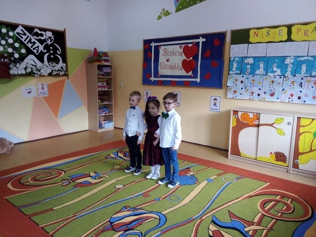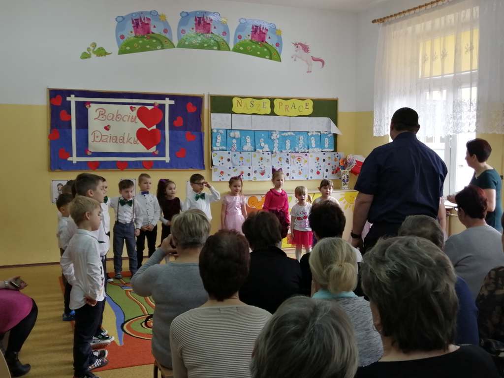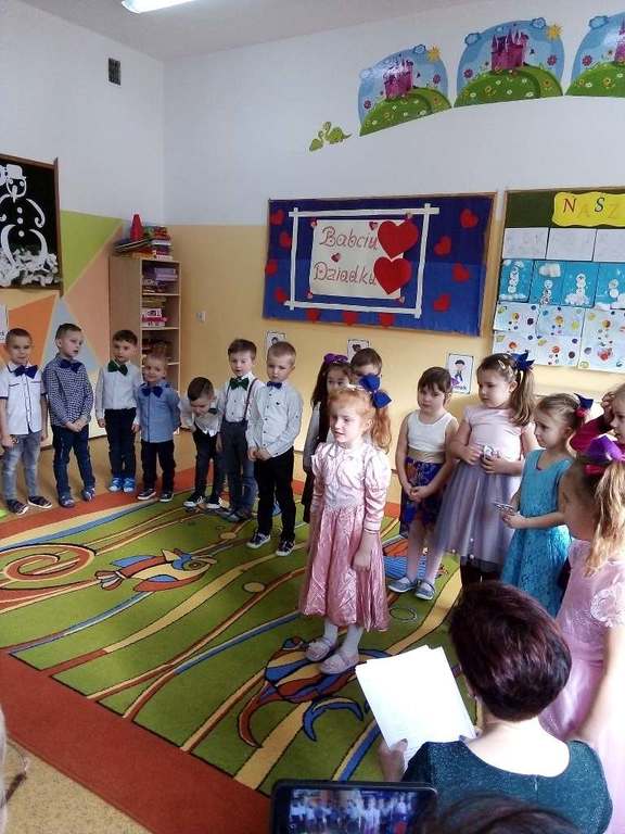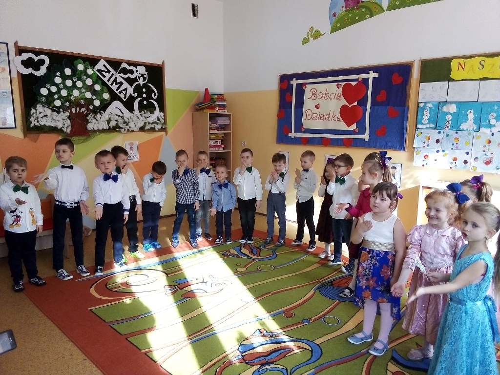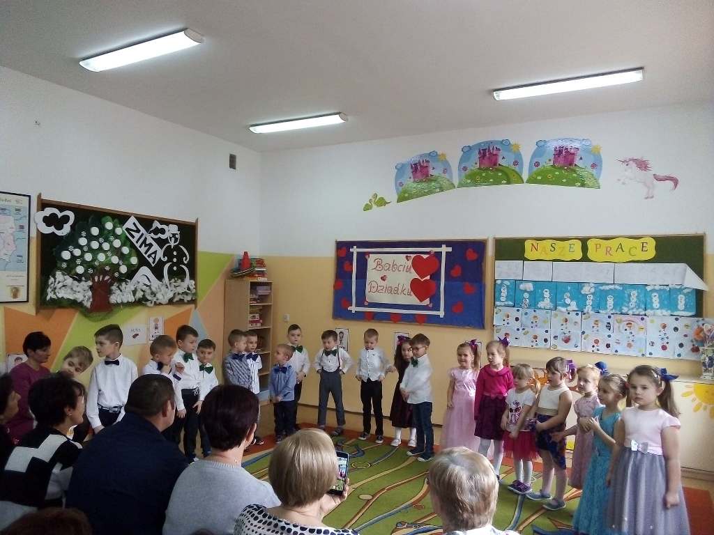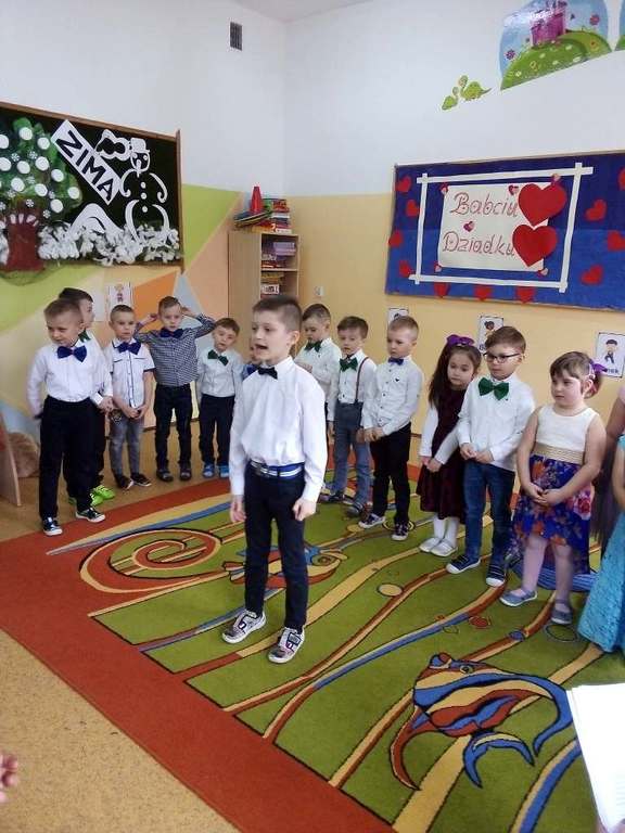 Dzieci z oddziału przedszkolnego 5-latków zaprosiły swoich dziadków na występ, aby podziękować za miłość i troskliwość, jaką obdarzają swoje wnuki. To zawsze bardzo wyjątkowe spotkania, którym towarzyszy ogromne wzruszenie. Podczas tegorocznej uroczystości dzieci poprzez wiersze i piosenki szukały odpowiedzi na wiele pytań dotyczących swoich dziadków, a w szczególności dotyczących ich młodzieńczych lat. Bardzo chciały również „tak wyczarować, by z małą babcią pospacerować i z dziadkiem (…), małym chłopakiem, na koniec świata iść górskim szlakiem”.