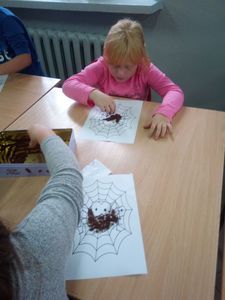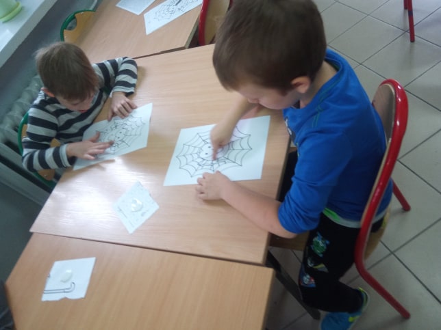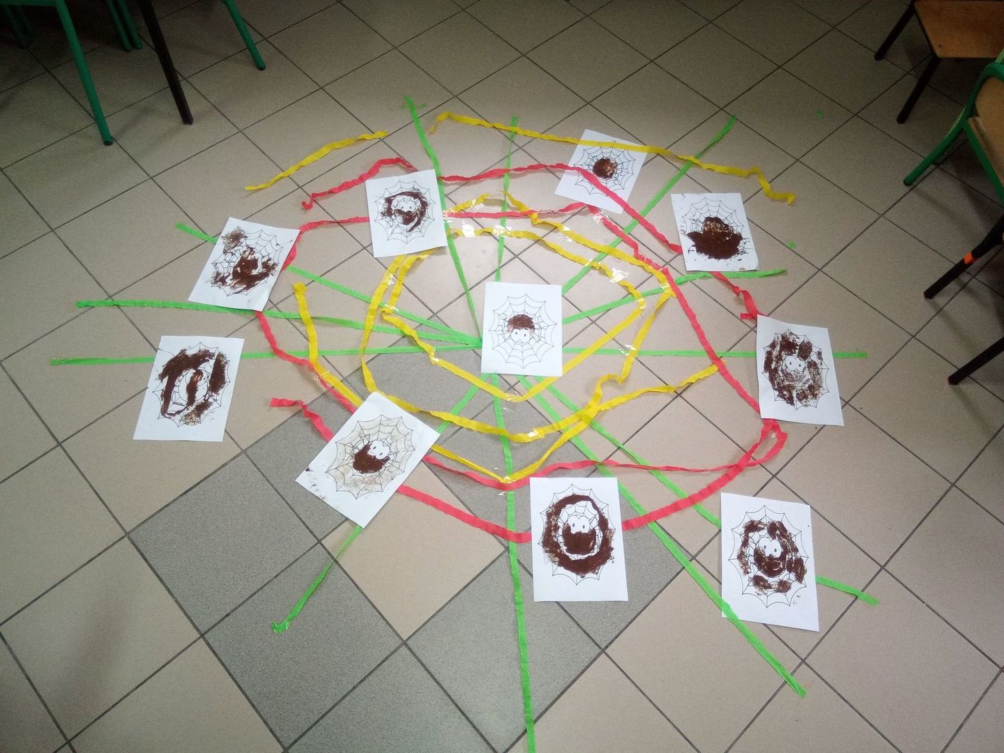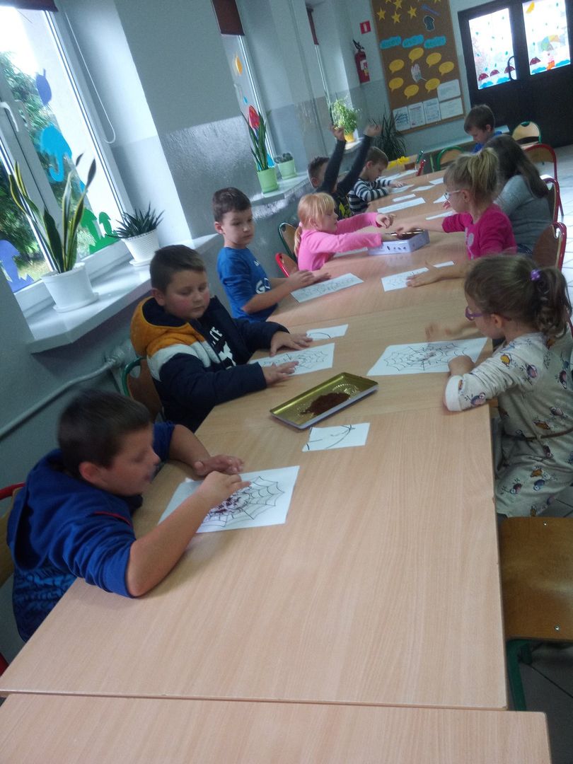 Pani pedagog przeczytała grupie bajkę oraz przeprowadziła pogadankę na jej temat. Uczniowie chętnie odpowiadali na pytania oraz wskazywali własne wnioski. Dzieci wspólnie stworzyły pajęczynę z bibuły oraz sznurka, następnie każde z nich wykonało swojego pajączka. Na ścianie świetlicy również powstała piękna pajęczyna, na której pojawiły się nasze piękne prace plastyczne.