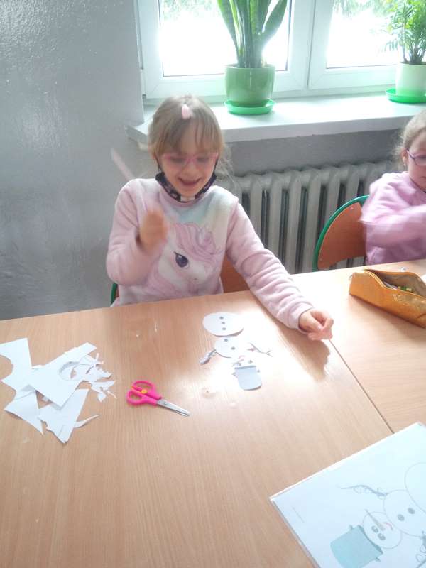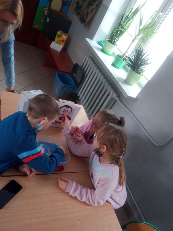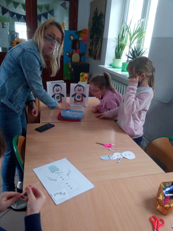 Na początku lutego 2021r. w naszej świetlicy szkolnej odbyły się warsztaty logopedyczne pt. „Zimowe zabawy logopedyczne”, które poprowadziła p. Monika Bębniarz. Zajęcia miały na celu rozwijanie sprawności artykulatorów, słuchu fonemowego, toru oddechowego oraz umiejętności manualnych. Uczniowie z klasy I wykonywali różnego rodzaju ćwiczenia: usprawniali buzie z zimowymi wierszykami, układali bałwanka za pomocą słomek do napojów oraz karmili 2 pingwinki „syczącymi i szumiącymi” rybkami.