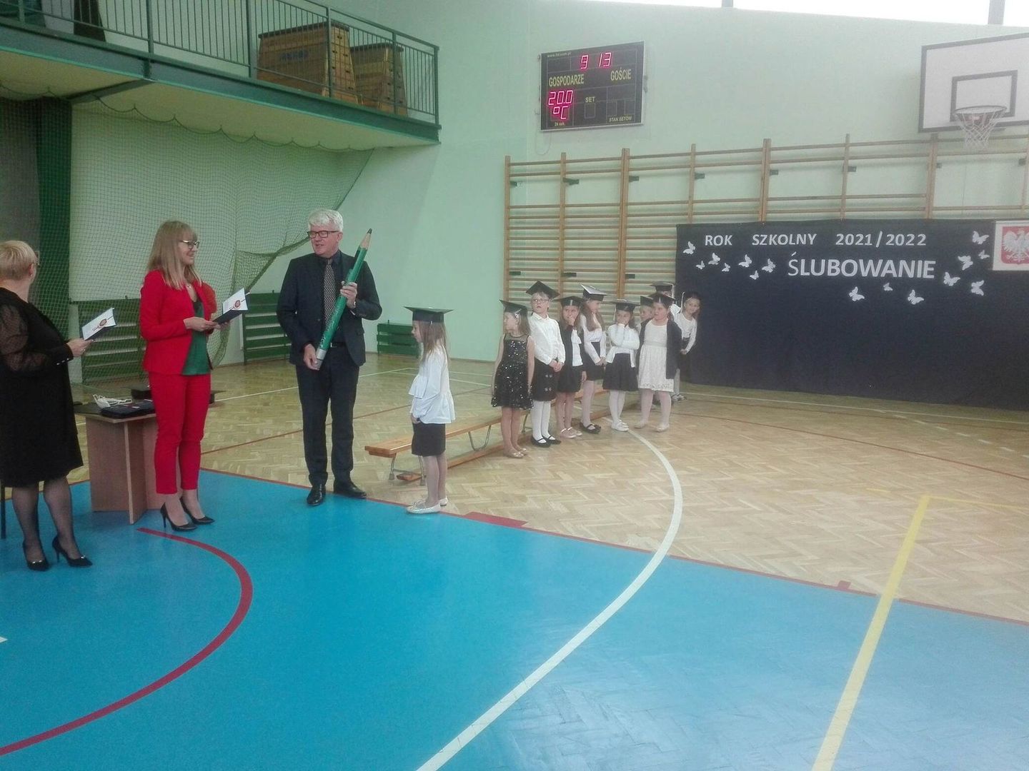 – Ślubuję być dobrym uczniem, dbać o dobre imię szkoły, uczyć się pilnie i być dobrym kolegą. Swym zachowaniem sprawiać rodzicom i nauczycielom- ślubowali uczniowie, a następnie zostali pasowani na ucznia.