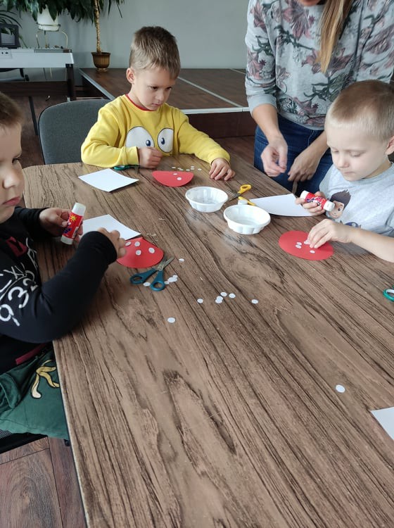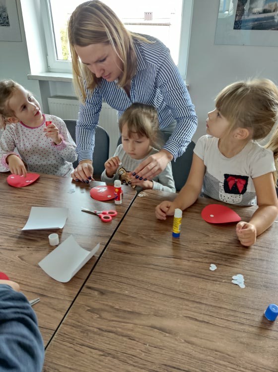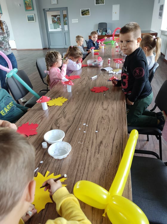 Dzieci wysłuchały bajek o jesieni, a w oparciu o ich treść odpowiadały na pytania związane z aktualna porą roku. Powstały piękne prace – muchomorki, które są teraz ozdobą w sali grupy 5-latków. Były także tańce pod kierunkiem P. Wioletty Drozdowskiej, jak również upominki w postaci balonowych figurek. Każde dziecko mogło zostawić swój ślad uczestnictwa w zajęciach na jesiennym listku. Było miło, twórczo i kreatywnie, za co bardzo dziękujemy.