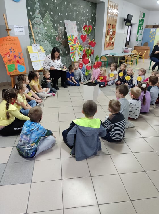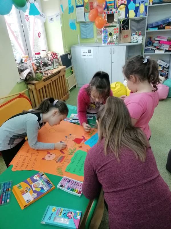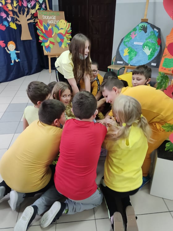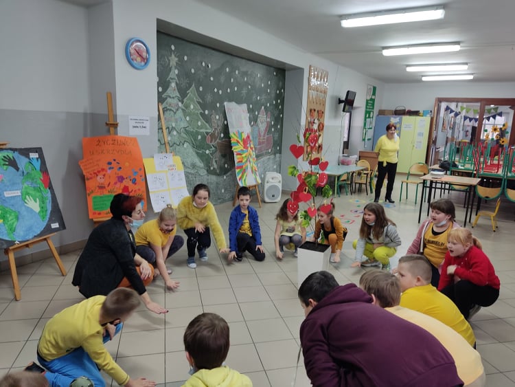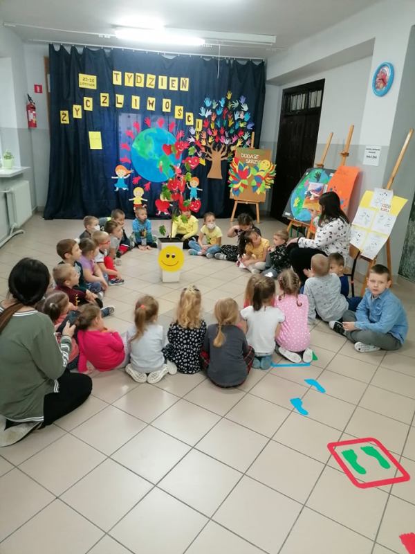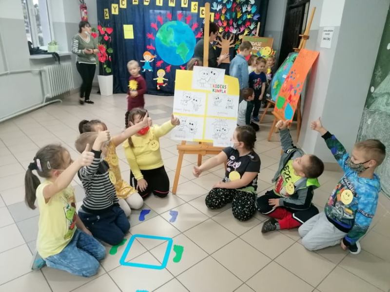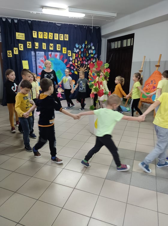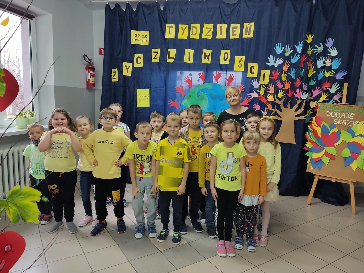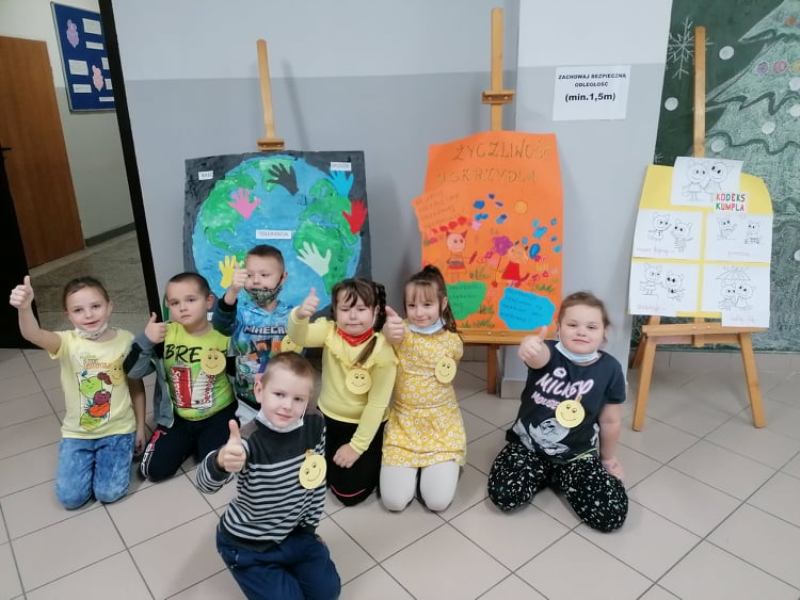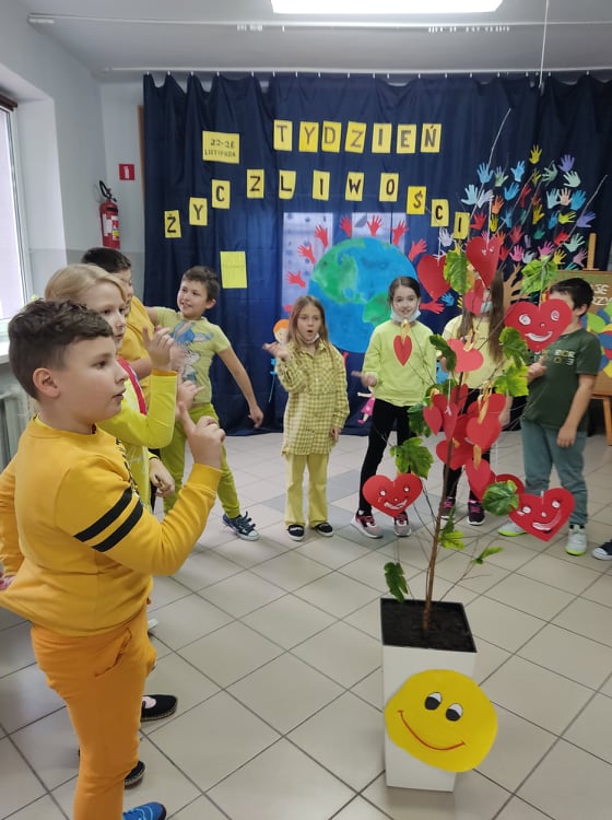 Oddziały przedszkolne realizowały swoje zdania każdego dnia wg harmonogramu: wysłuchały opowiadania o Krainie życzliwości; brały czynny udział w zabawach, które mają na celu uświadomienie, że życzliwość wymaga od każdego wrażliwości i współpracy; wykonały plakat z odbitych rączek wokół planety ziemi; ubrały się w żółte stroje do zdjęć w fotobudce; wykonały własny Kodeks Kumpla; wykonały kotylion z emotikonem oraz serca, które zostały umieszczone na wspólnym drzewku życzliwości. Na zakończenie przedszkolaki: 3-latki, 4-latki, 5-latki, 6-latki, klasa I, II i III kolejno zaśpiewały Hymn Życzliwości przy Drzewie Życzliwości.