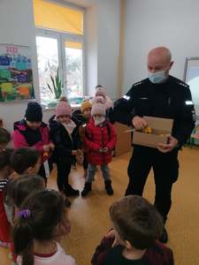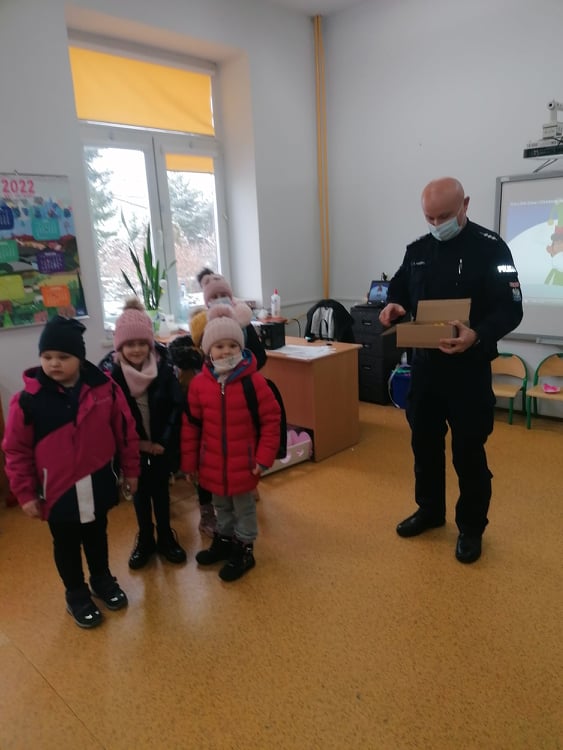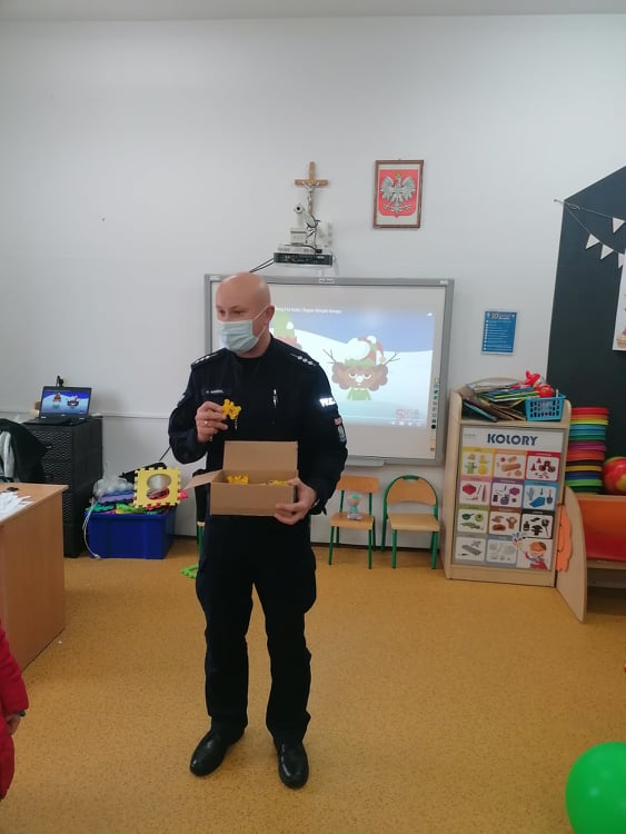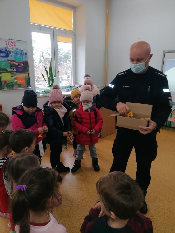 W dniu 9 grudnia w naszej szkole odbyło się spotkanie przedszkolaków z panem policjantem z Komisariatu Policji w Przedborzu. Celem wizyty było przypomnienie o podstawowych zasadach bezpieczeństwa. Przedszkolaki dowiedziały się jak bezpiecznie podróżować, jak ważne jest zapinanie pasów, bezpieczeństwo podczas jazdy samochodem, przypomniał również o konieczności ubrań i obuwia z elementami odblaskowymi.