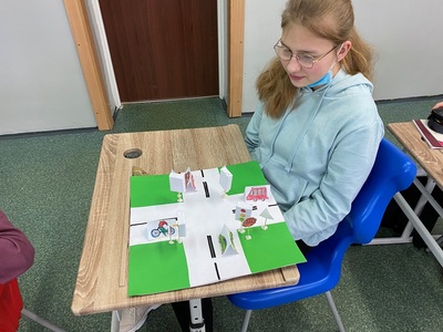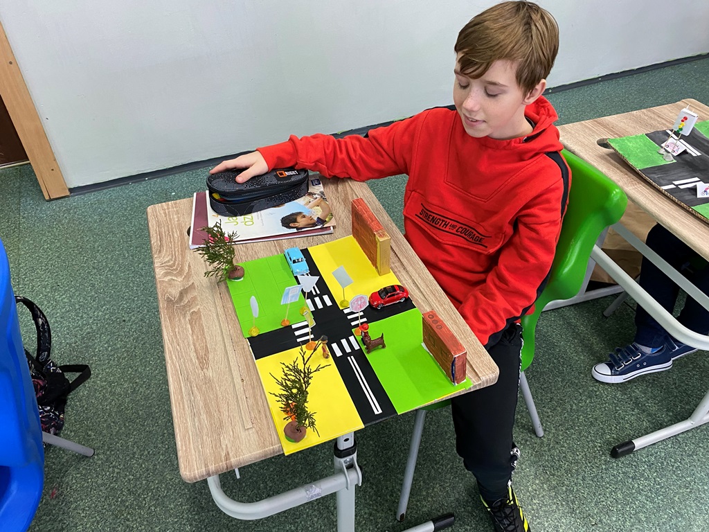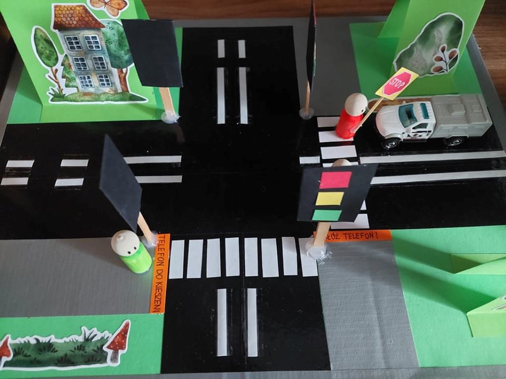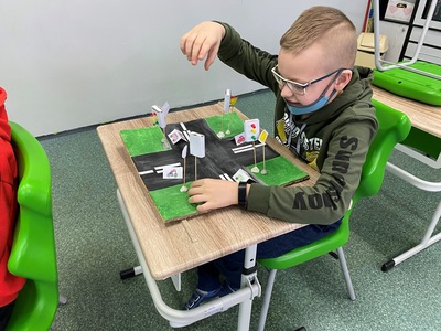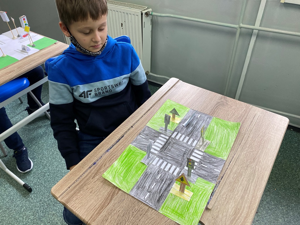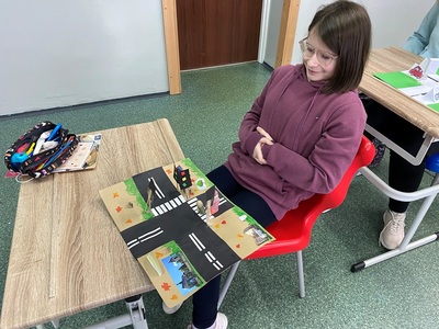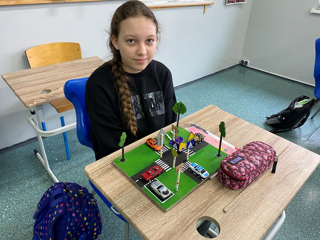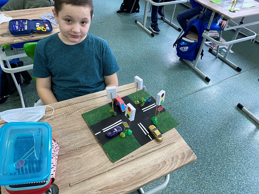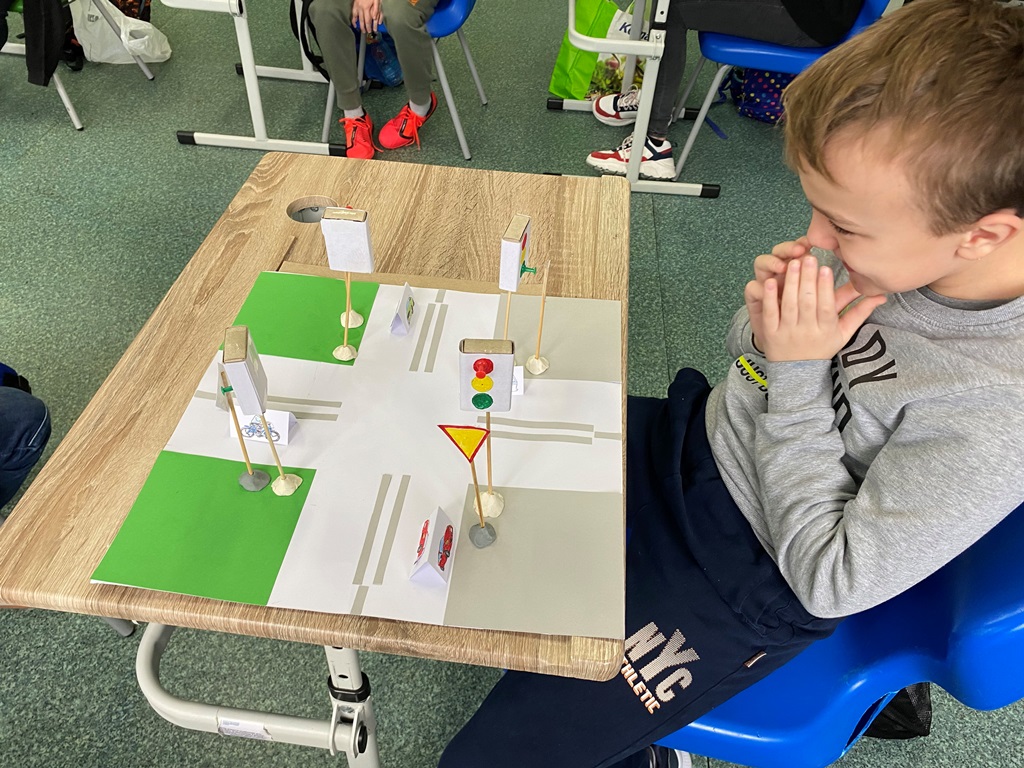 W poniedziałek uczniowie klasy czwartej zaprezentowali wykonane przez siebie plansze do nauki zasad pierwszeństwa przejazdu na skrzyżowaniu. Samo ich wykonanie jest formą powtórzenia i utrwalenia dotychczas omówionego materiału. Wykazali się pomysłowości w doborze materiałów i formy wykonania swoich prac. Nieźle się przy tym bawili.