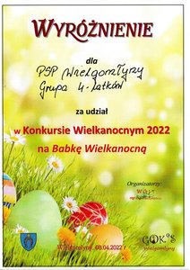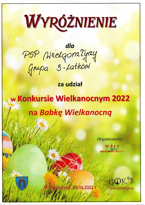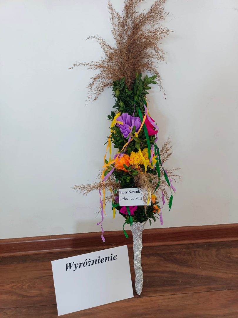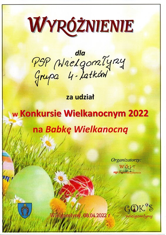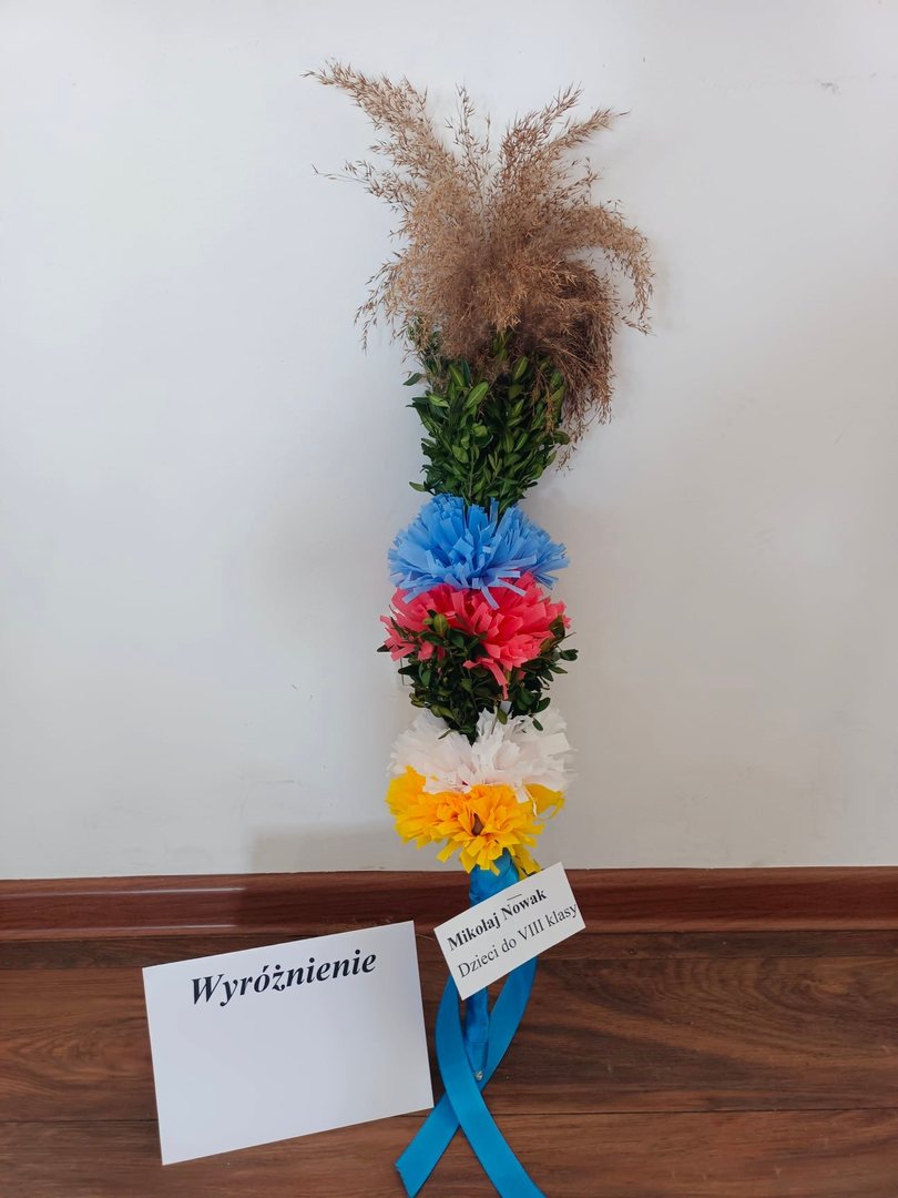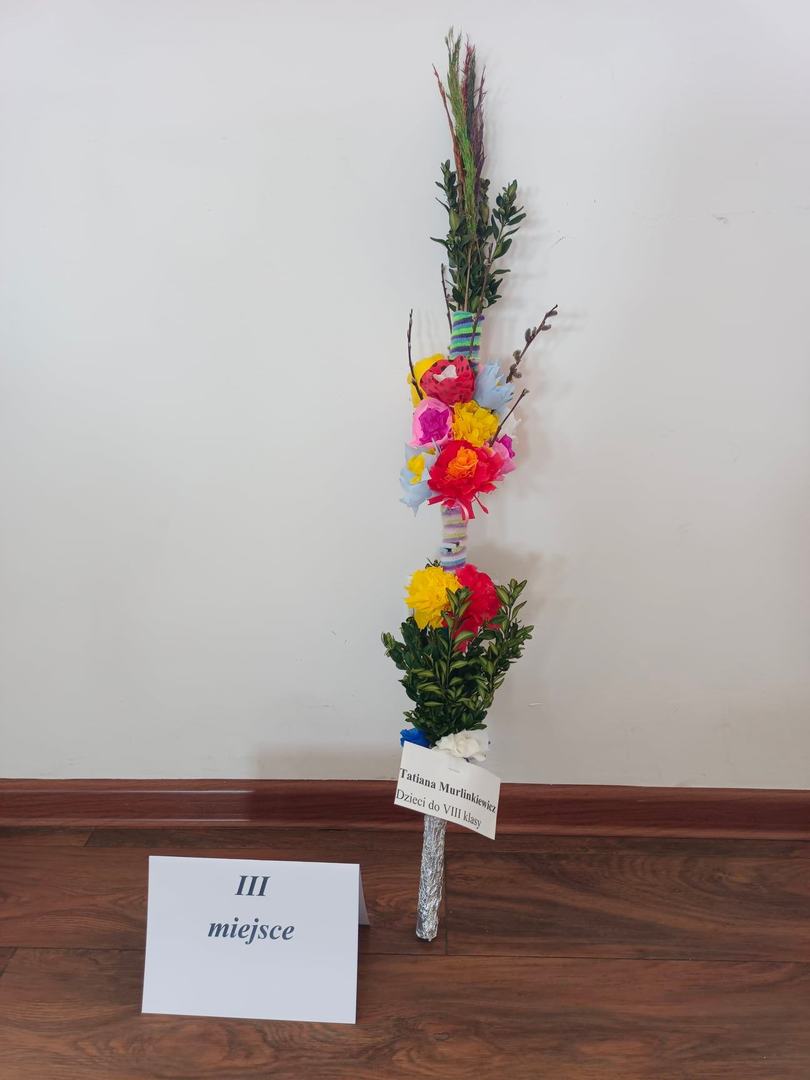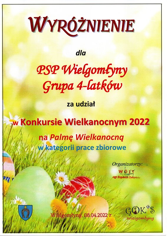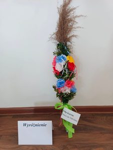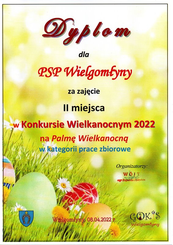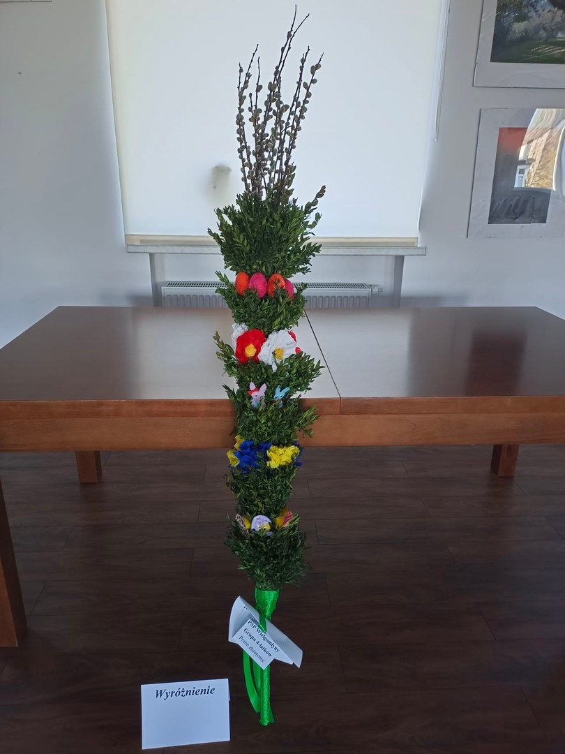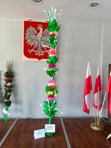 08.04.2022r. w GOKiS w Wielgomłynach odbyło się wręczenie nagród za palmę oraz babkę wielkanocną. Uczniowie naszej szkoły zajęli II miejsce w konkursie na palmę wielkanocną. Nasza palma była wykonana z materiałów tradycyjnych, czyli bibuły i krepiny. Palma miała ponad 2 metry wysokości. Nagrodę wręczyła Pani Wójt Gminy Wielgomłyny Bogumiła Dyktyńska.