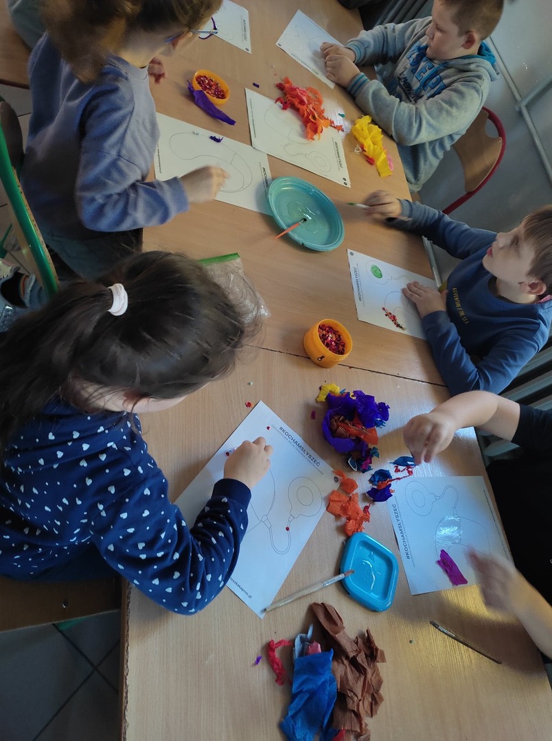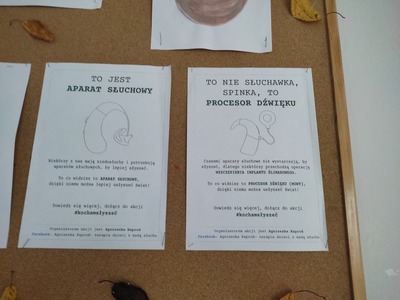 W październiku w naszej szkole odbyła się Ogólnopolska Akcja #kochamsłyszeć, która organizowana jest co roku przez znanych logopedów. Celem akcji jest przekazanie wiedzy na temat niedosłuchu oraz sposobów radzenia sobie z tą niepełnosprawnością, a także kształtowanie postaw wobec osób dotkniętych niedosłuchem. Uczniowie w naszej szkole obejrzeli film na temat funkcjonowania narządu słuchu, otrzymali wiedzę na temat aparatu słuchowego oraz procesora dźwięku. Dodatkowo rozwijali się twórczo podczas pracy plastycznej. Akcję przeprowadziła logopeda Monika Bębniarz.