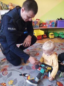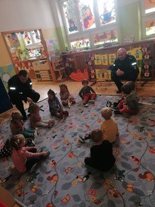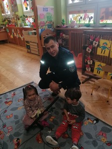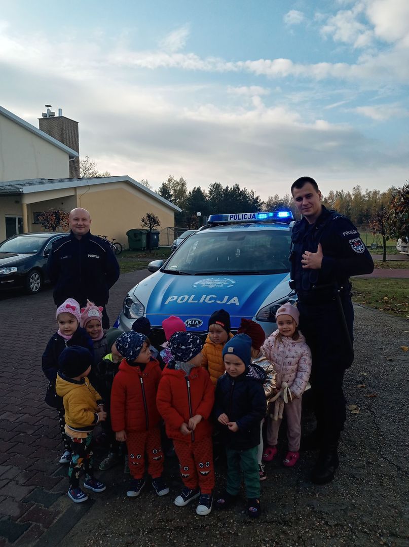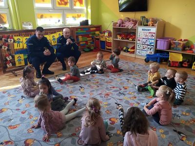 25 października nasz oddział odwiedzili panowie policjanci: S. Konieczny i A. Wróbel, którzy przybliżyli dzieciom podstawowe zasady bezpiecznego poruszania się po drogach oraz przypomnieli numery alarmowe. Dzieci otrzymały również wskazówki, jak zachować się, gdy spotkają obcego człowieka, zagubią się w lesie czy w sklepie oraz w przypadku ataku dzikiego zwierzęcia. Przedszkolaki chętnie ćwiczyły pozycję „Żółwika”, która chroni przed atakiem zwierzaka.