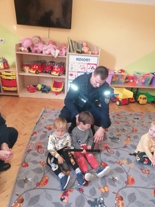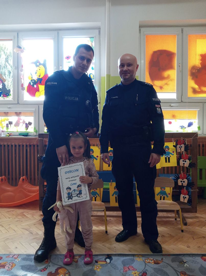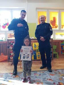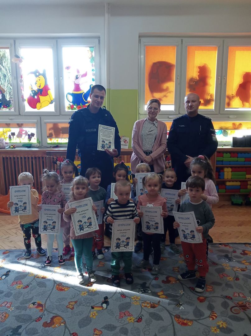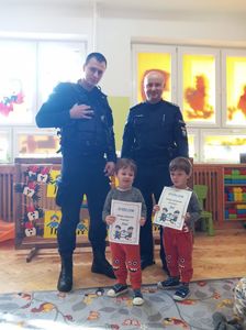 Największym zainteresowaniem cieszyła się prezentacja wyposażenia policyjnego niezbędnego podczas wykonywania pracy policjanta, tj.: kajdanki, pałka policyjna, druki mandatowe, radiowóz. Dzieci miały możliwość zrobić sobie pamiątkowe zdjęcie wewnątrz radiowozu. Na koniec spotkania przedszkolaki otrzymały dyplom Małego Policjanta i Małej Policjantki. Dziękujemy serdecznie panom policjantom za odwiedziny i przybliżenie dzieciom zawodu policjanta.
