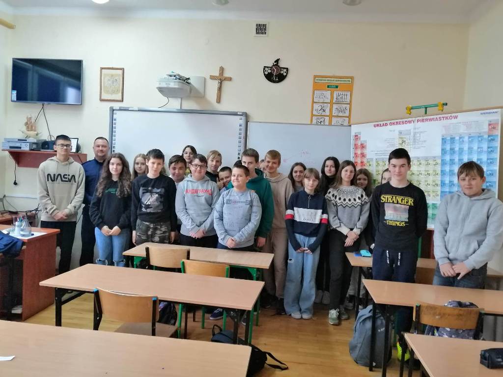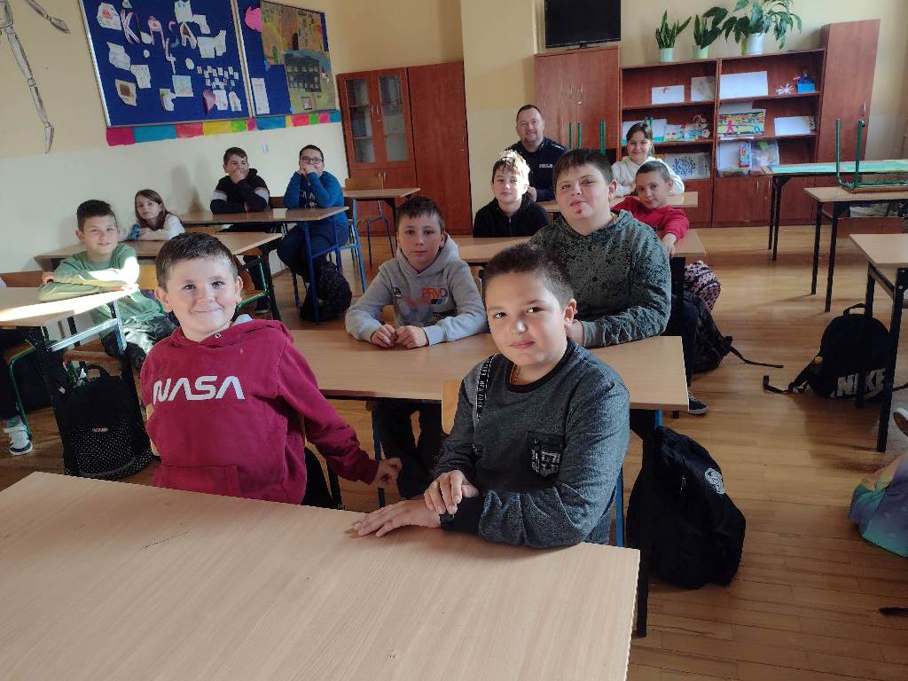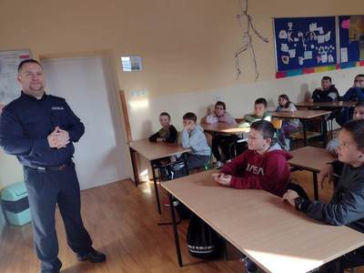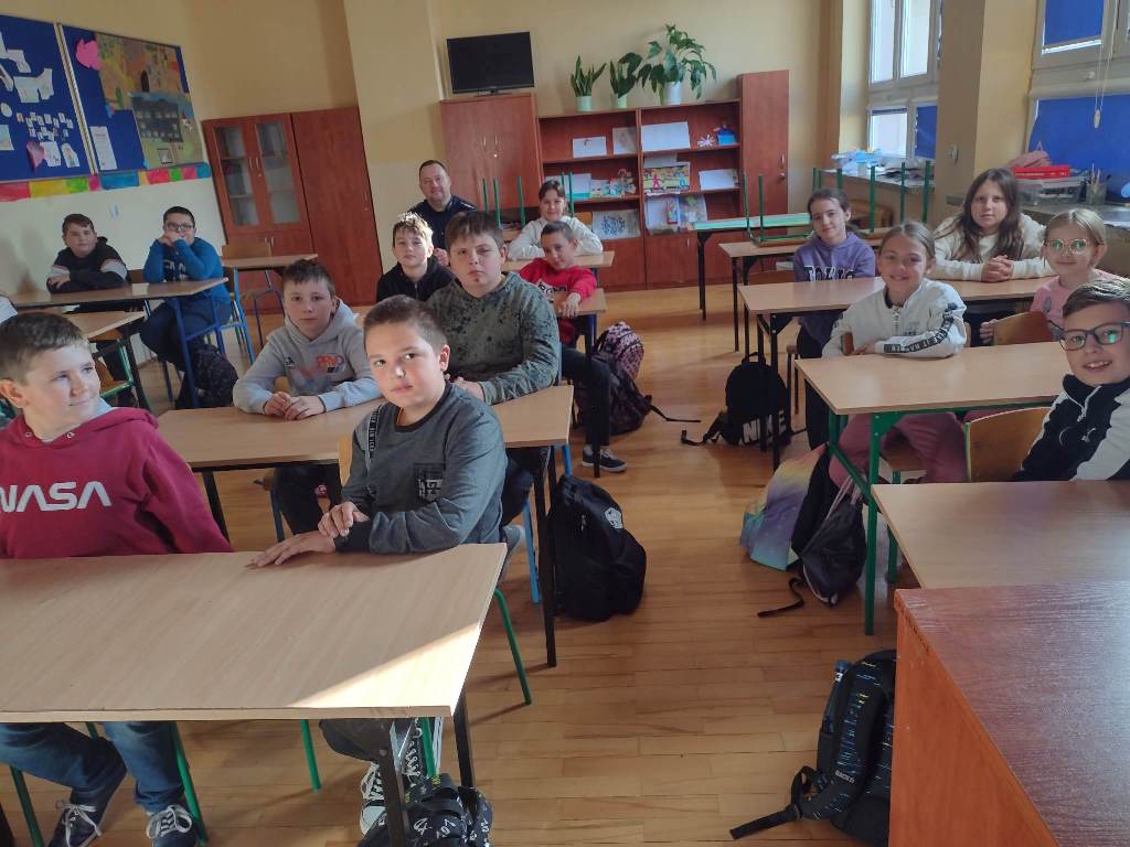 22 listopada klasa 8 i 4 spotkały się z policjantem aspirantem Dariuszem Trepką z Komendy Powiatowej Policji w Radomsku. Tematy poruszane w klasie 8 dotyczyły przede wszystkim odpowiedzialności karnej, cyberprzestępczości oraz uzależnień, natomiast klasa młodsza wysłuchała zasad bezpieczeństwa w ruchu drogowym. Policjant podkreślił ważną rolę noszenia elementów odblaskowych, które powinien mieć każdy z nas. Poruszane również były zasady, które należy stosować w kontaktach z obcymi oraz zagrożenia z Internetu. Na zakończenie rozwiązała się dyskusja i uczniowie zadawali pytania oraz dzielili się swoimi spostrzeżeniami. Dziękujemy Panu Dariuszowi za wiele cennych porad.